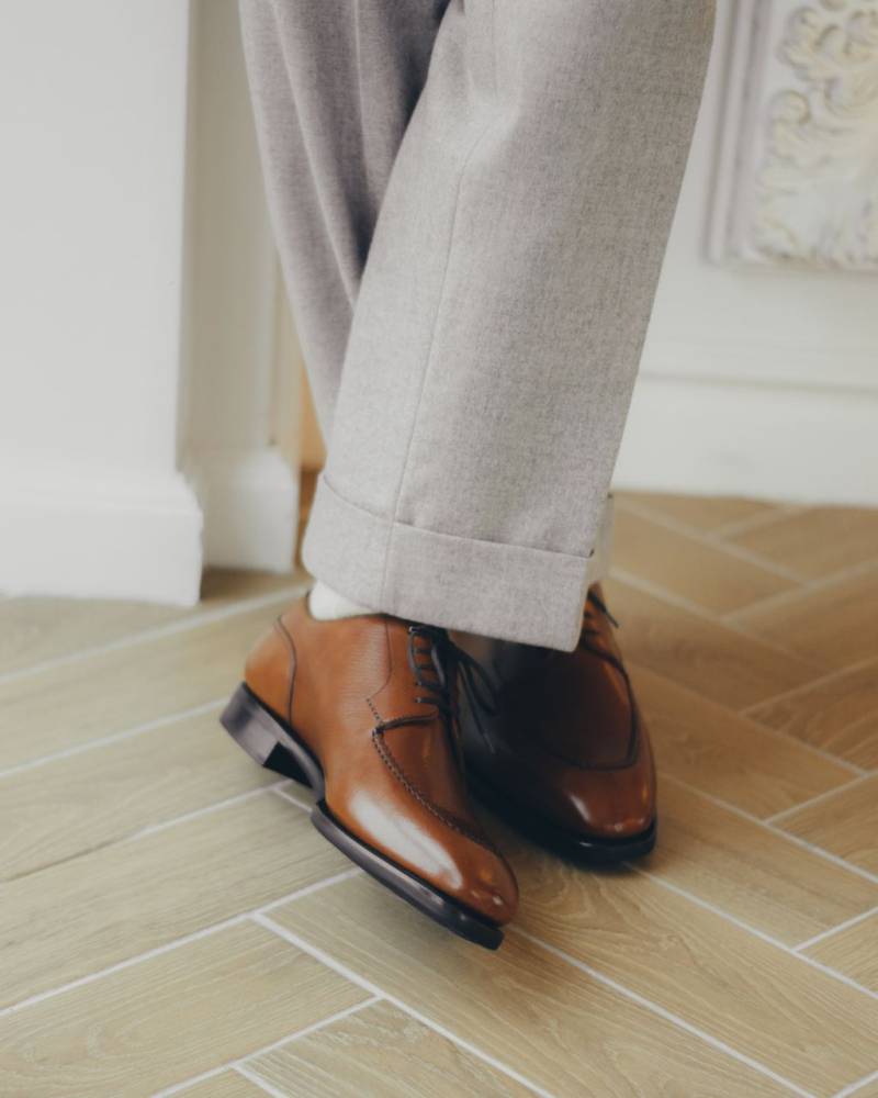 Элегантные коричневые дерби с норвежским мыском (англ. Norwegian split toe) испанской марки TLB Mallorca из премиальной коллекции Artista. Данная модель отличается двумя видами ручных швов: на союзке — наружный, а на мыске — внутренний. Верх туфель выполнен из фактурной светло-коричневой телячьей кожи (тиснение выполнено в стиле знаменитой русской юфти — англ. Russian leather), а подкладка и стелька — из тонкой телячьей кожи растительного дубления. Резиновая подошва позволяет носить такие дерби даже в ненастную погоду. Конструкция Goodyear Welted.