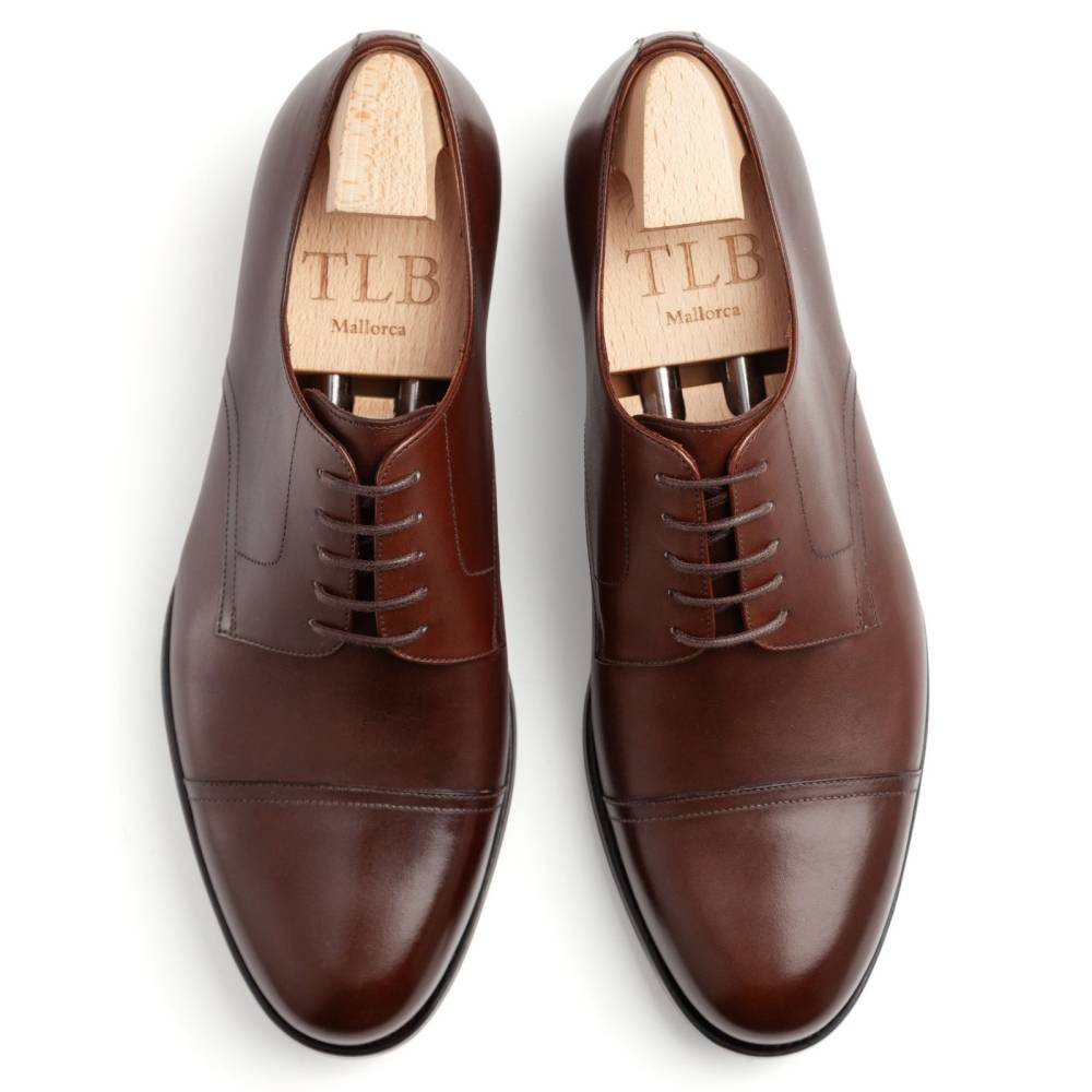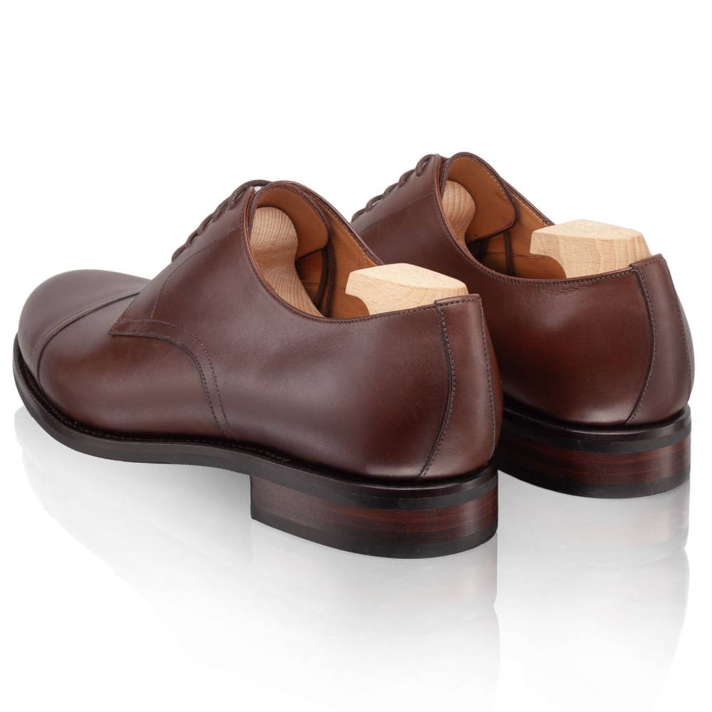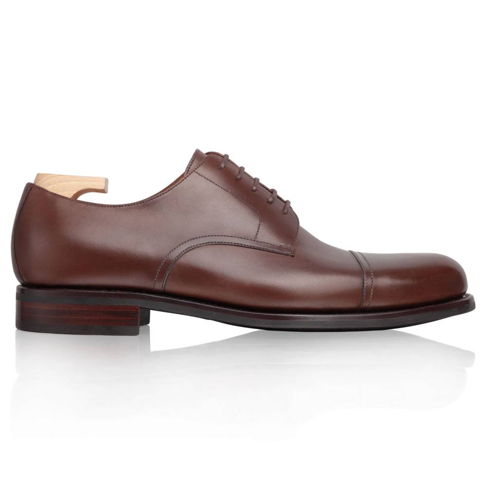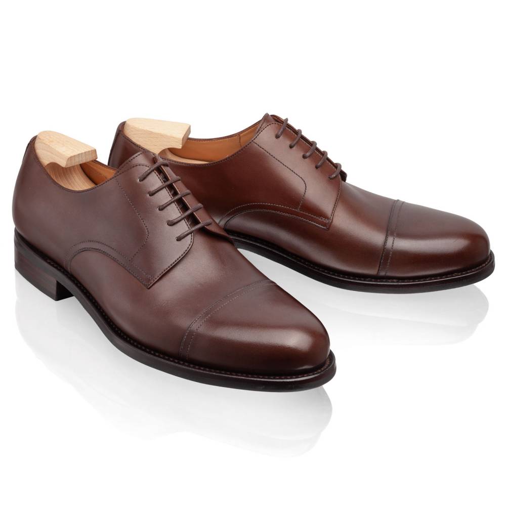 Классические мужские дерби Joseph с отрезным мыском (cap toe) из основной коллекции TLB. Выполнены из высококачественной телячьей кожи анилинового крашения (vegano) коричневого цвета. Внутренняя отделка из тонкой кожи растительного дубления обеспечивает идеальную посадку. Подошва из резины, позволяет носить в ненастную погоду. Конструкция Goodyear Welted.
