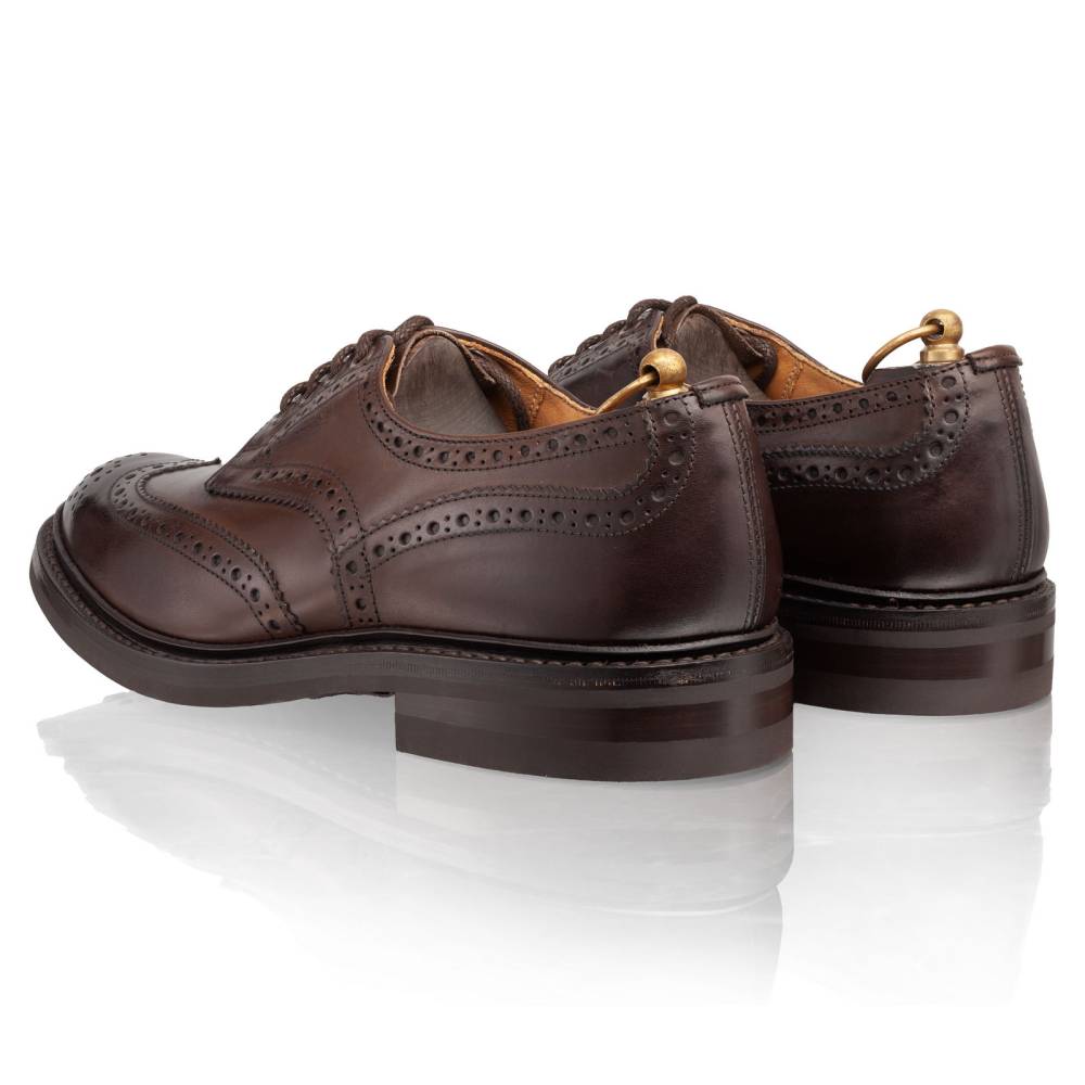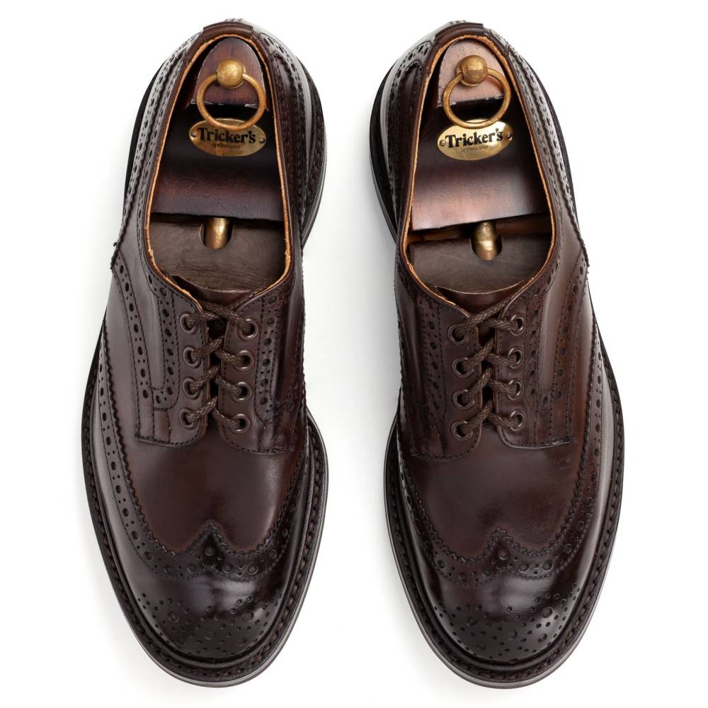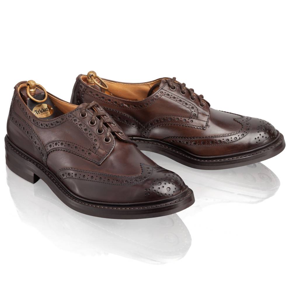 Броги Bourton на толстой резиновой подошве Dainite от старейшей английской мануфактуры Tricker’s. Выполнены из плотной телячьей кожи тёмно-коричневого цвета. Модель имеет усиленный рант с окантовкой (storm welt), который добавляет подошве влагоустойчивость. Верх украшен узнаваемым перфорированным узором и фестонами, а также традиционным медальоном на мысе. Эти массивные, износостойкие броги на толстой подошве были созданы на фабрике компании в Нортгемптоне в 1937 под руководством Эрнеста Р. Барлтропа, сына сооснователя бренда. С тех пор модель является ярким примером традиционной английской неформальной обуви, которая стала известна во всем мире. Конструкция Goodyear Welted.