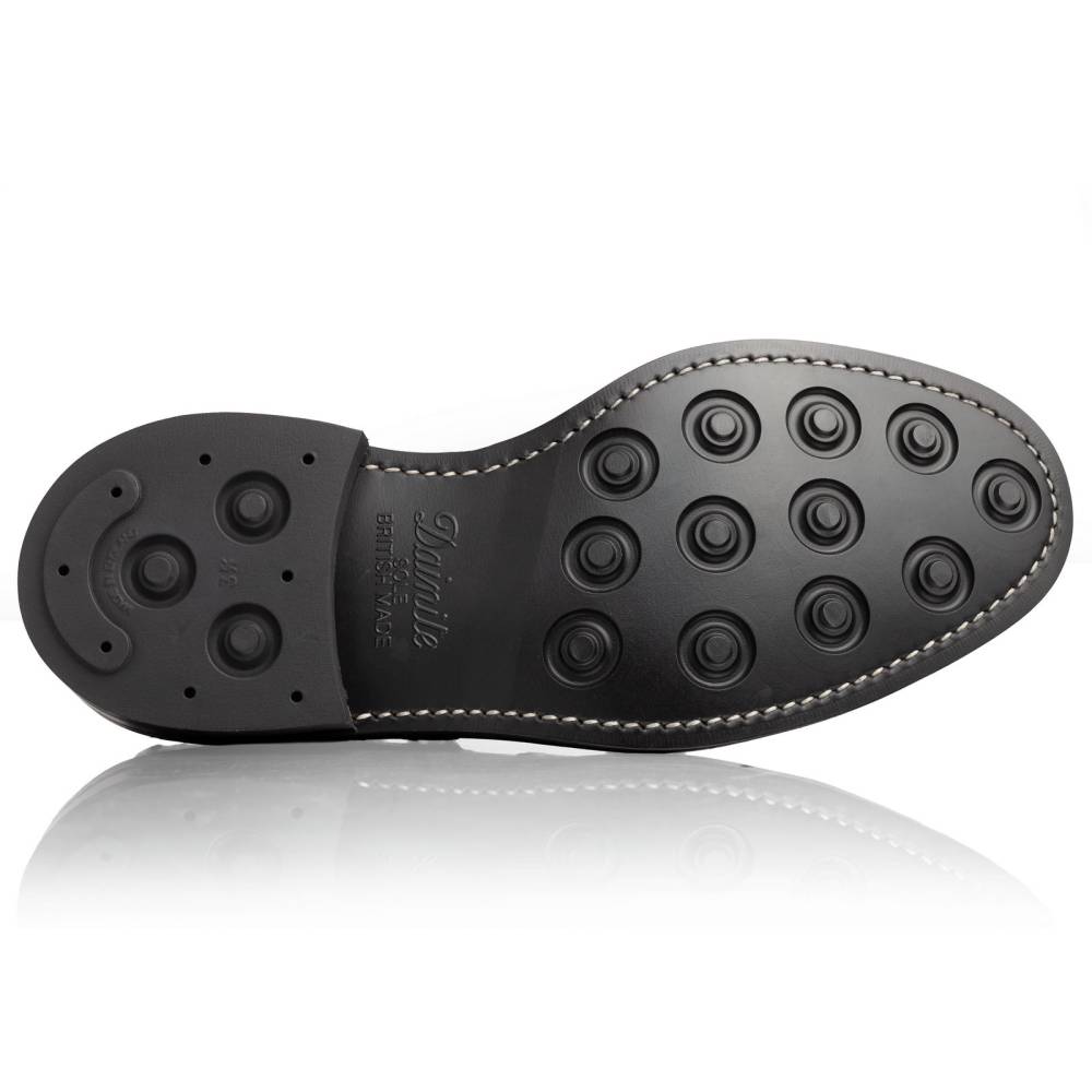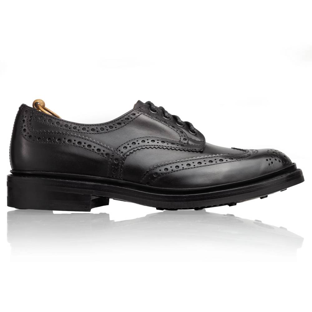 Броги Bourton на толстой резиновой подошве Dainite от старейшей английской мануфактуры Tricker’s. Выполнены из плотной телячьей кожи чёрного цвета. Модель имеет усиленный рант с окантовкой (storm welt), который добавляет подошве влагоустойчивость. Верх украшен узнаваемым перфорированным узором и фестонами, а также традиционным медальоном на мысе. Эти массивные, износостойкие броги на толстой подошве были созданы на фабрике компании в Нортгемптоне в 1937 под руководством Эрнеста Р. Барлтропа, сына сооснователя бренда. С тех пор модель является ярким примером традиционной английской неформальной обуви, которая стала известна во всем мире. Конструкция Goodyear Welted.