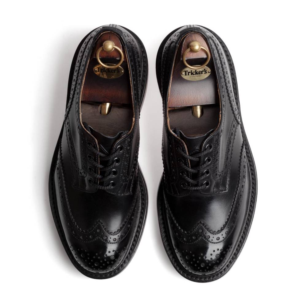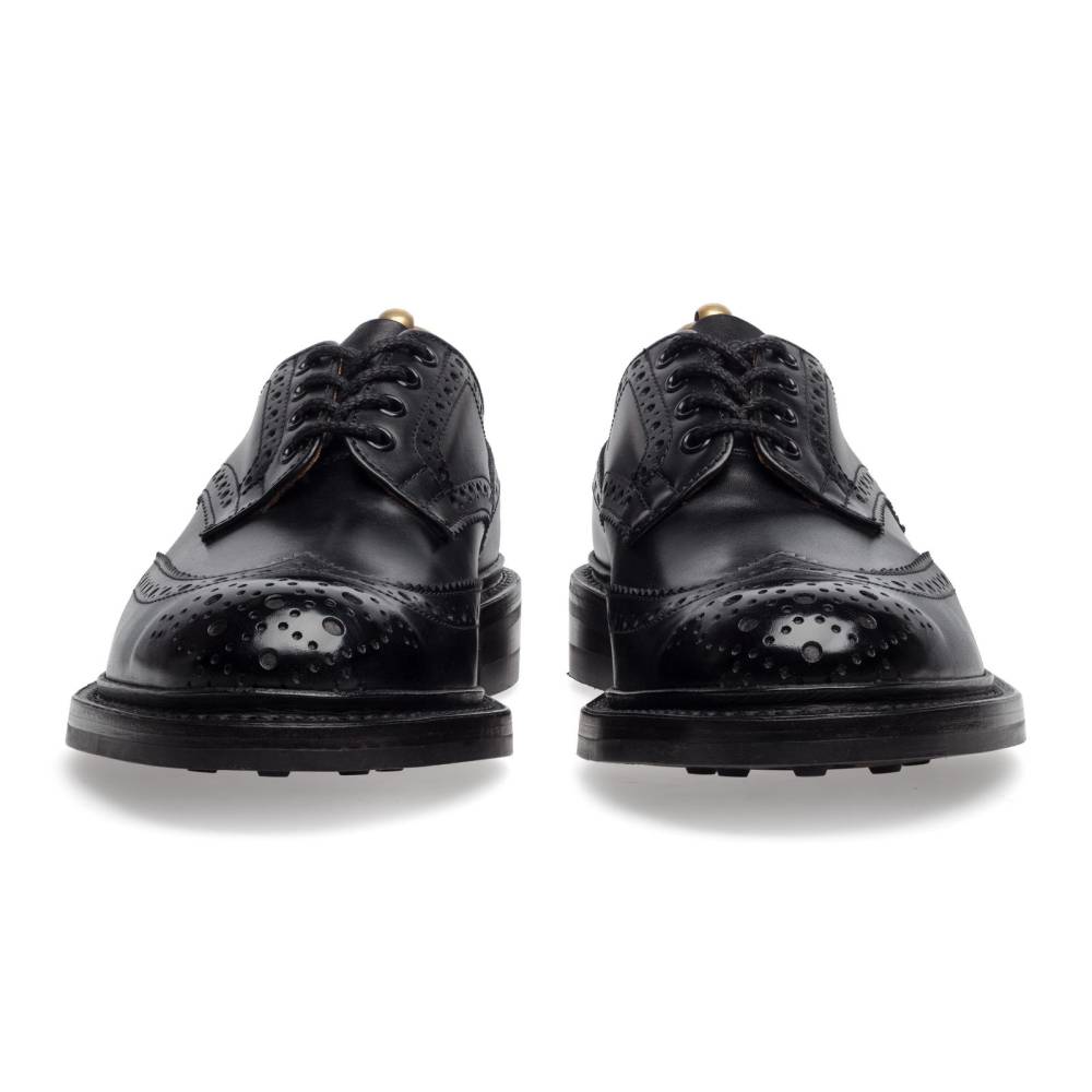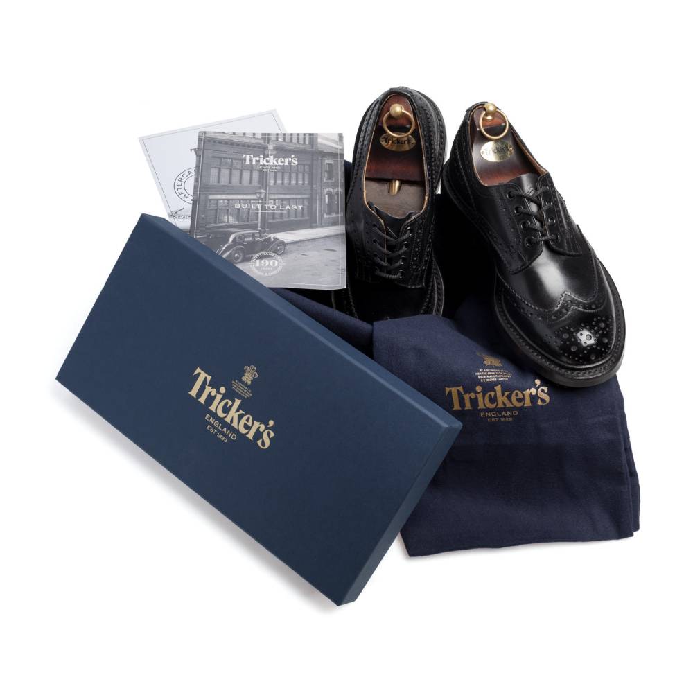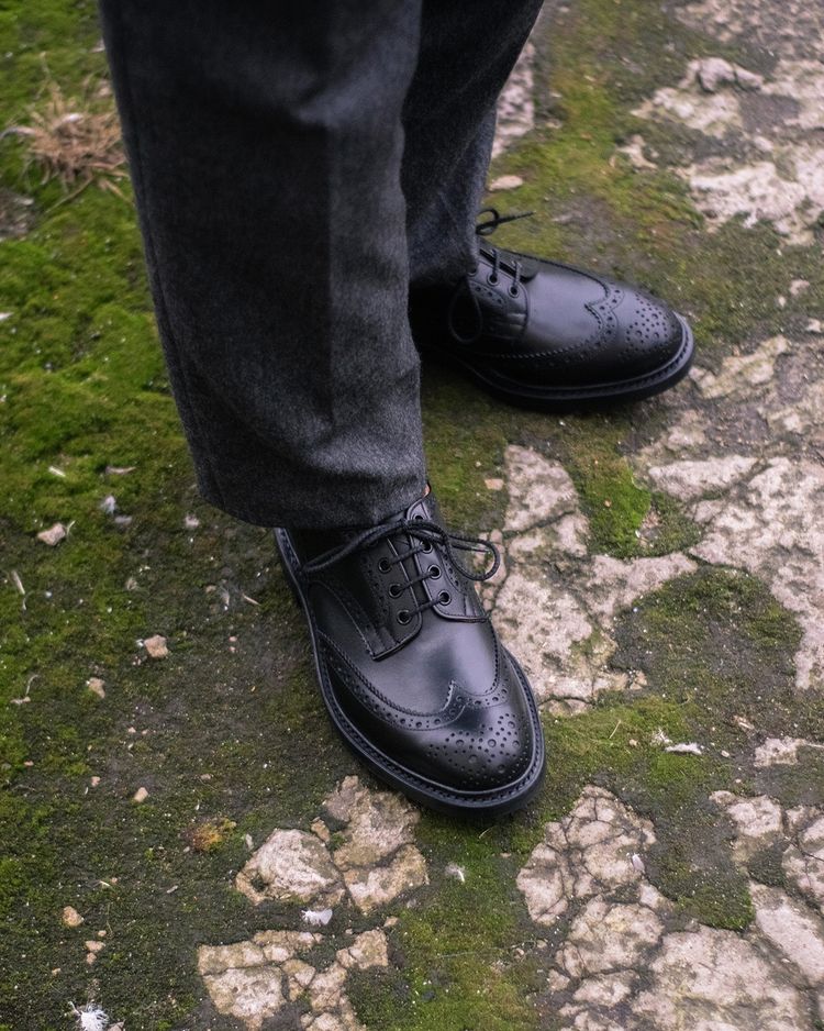 Броги Bourton на толстой резиновой подошве Dainite от старейшей английской мануфактуры Tricker’s. Выполнены из плотной телячьей кожи чёрного цвета. Модель имеет усиленный рант с окантовкой (storm welt), который добавляет подошве влагоустойчивость. Верх украшен узнаваемым перфорированным узором и фестонами, а также традиционным медальоном на мысе. Эти массивные, износостойкие броги на толстой подошве были созданы на фабрике компании в Нортгемптоне в 1937 под руководством Эрнеста Р. Барлтропа, сына сооснователя бренда. С тех пор модель является ярким примером традиционной английской неформальной обуви, которая стала известна во всем мире. Конструкция Goodyear Welted.