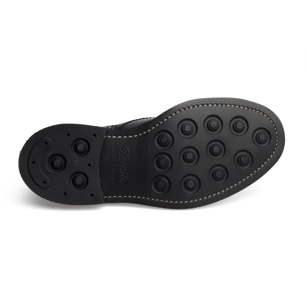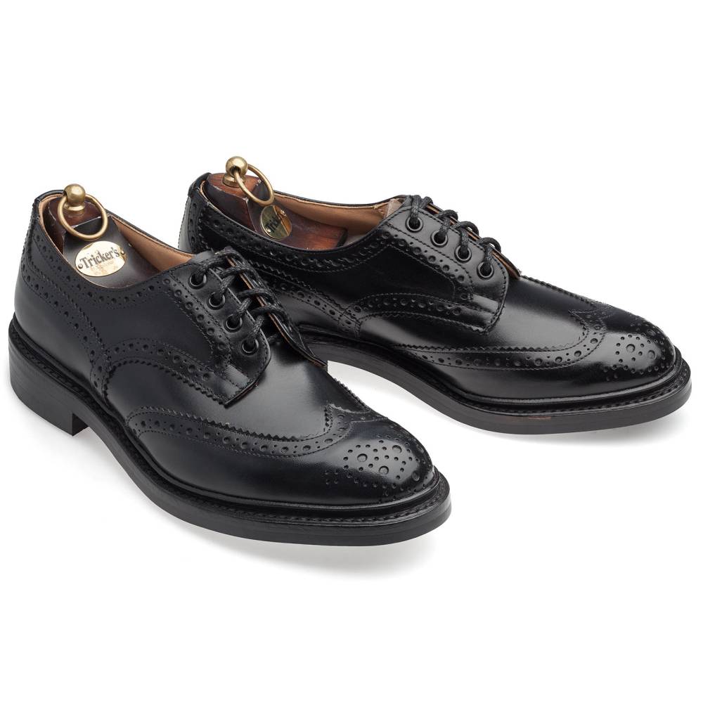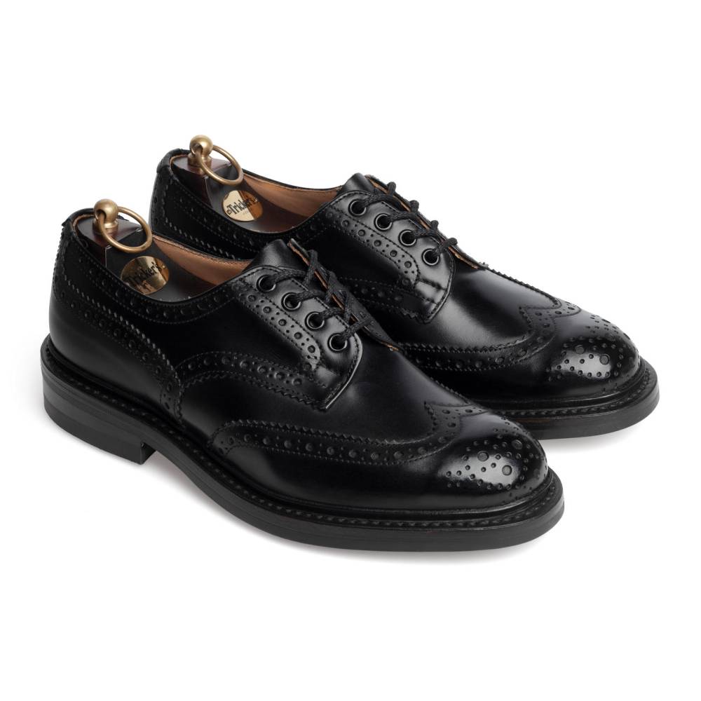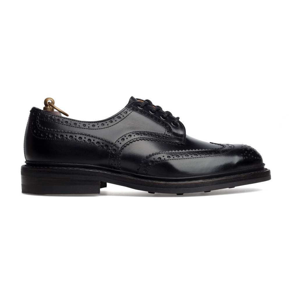 Броги Bourton на толстой резиновой подошве Dainite от старейшей английской мануфактуры Tricker’s. Выполнены из плотной телячьей кожи чёрного цвета. Модель имеет усиленный рант с окантовкой (storm welt), который добавляет подошве влагоустойчивость. Верх украшен узнаваемым перфорированным узором и фестонами, а также традиционным медальоном на мысе. Эти массивные, износостойкие броги на толстой подошве были созданы на фабрике компании в Нортгемптоне в 1937 под руководством Эрнеста Р. Барлтропа, сына сооснователя бренда. С тех пор модель является ярким примером традиционной английской неформальной обуви, которая стала известна во всем мире. Конструкция Goodyear Welted.