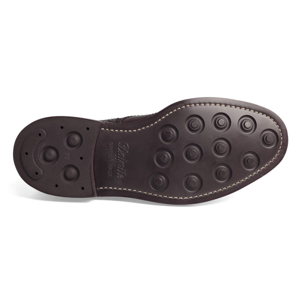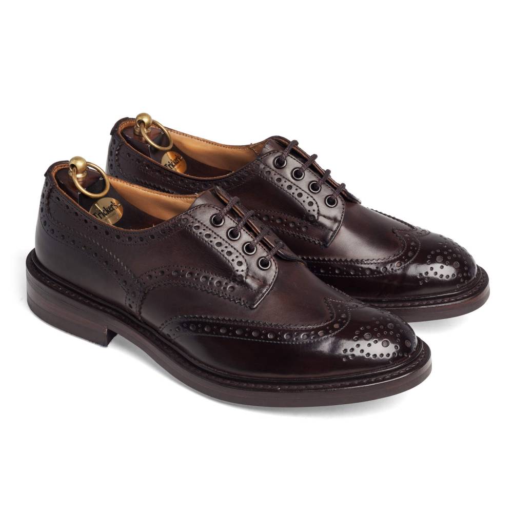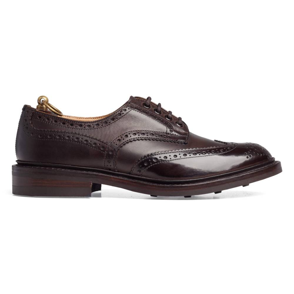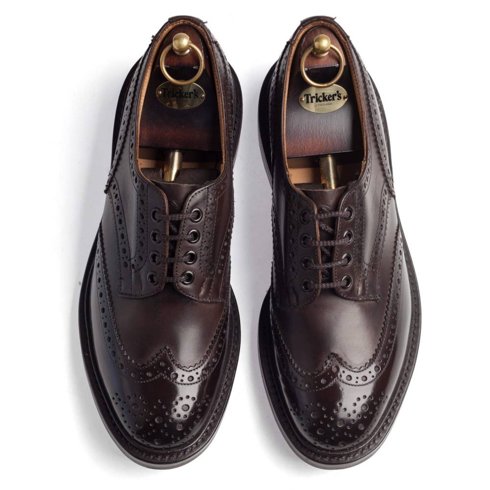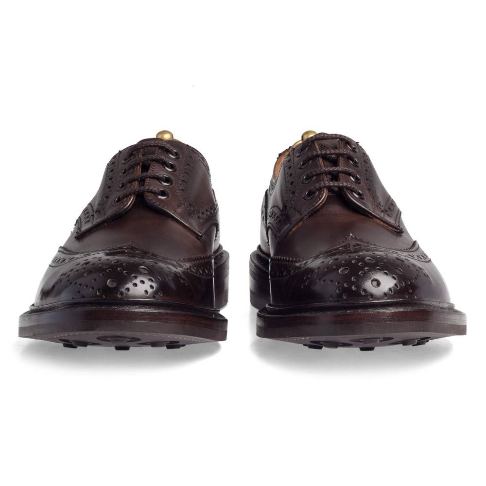 Броги Bourton на толстой резиновой подошве Dainite от старейшей английской мануфактуры Tricker’s. Выполнены из плотной телячьей кожи тёмно-коричневого цвета. Модель имеет усиленный рант с окантовкой (storm welt), который добавляет подошве влагоустойчивость. Верх украшен узнаваемым перфорированным узором и фестонами, а также традиционным медальоном на мысе. Эти массивные, износостойкие броги на толстой подошве были созданы на фабрике компании в Нортгемптоне в 1937 под руководством Эрнеста Р. Барлтропа, сына сооснователя бренда. С тех пор модель является ярким примером традиционной английской неформальной обуви, которая стала известна во всем мире. Конструкция Goodyear Welted.