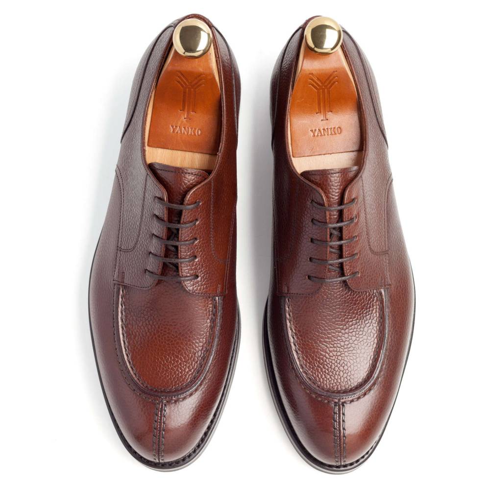 Традиционные дерби Yanko в норвежском стиле выполнены из плотной телячьей кожи с зернистой текстурой тёмно-коричневого цвета. Модель на прочной двухслойной подошве из кожи и высококачественной резины Vibram. Конструкция Goodyear Welted.
