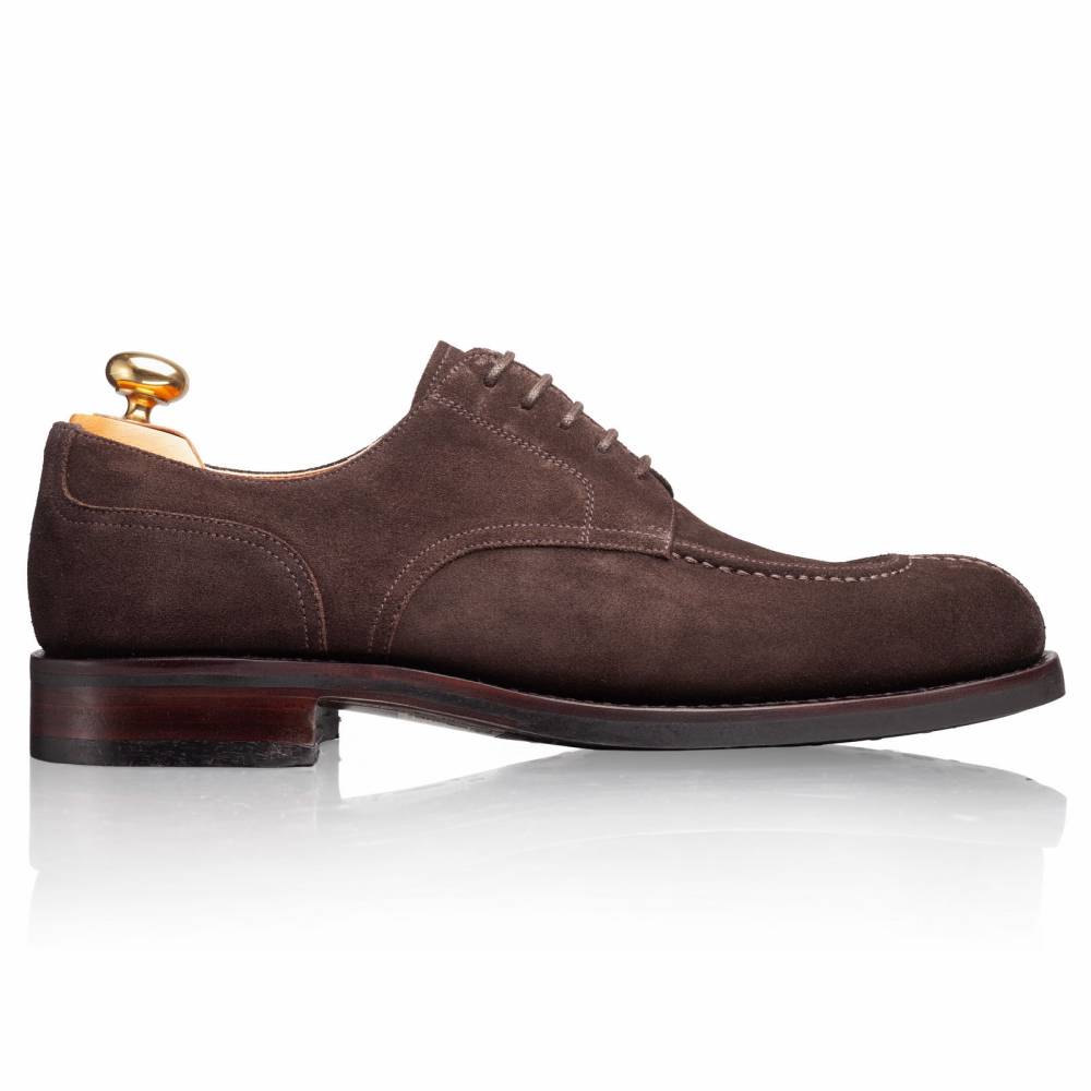 Повседневные мужские дерби изготовлены на Майорке на фабрике Yanko в конструкции Goodyear Welted. Модель представляет собой дерби в норвежском стиле с тремя контрастными строчками в передней части (split toe derby). Подошва выполнена из кожи и резины. Такое сочетание материалов позволяет носить обувь даже в дождливую погоду, не жертвуя при этом удобством. Область пятки с внутренней стороны с шероховатой поверхностью, чтобы стопа лучше фиксировалась.