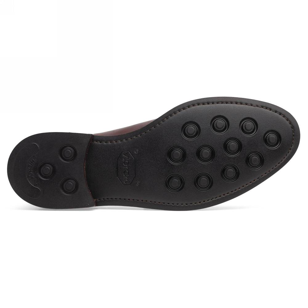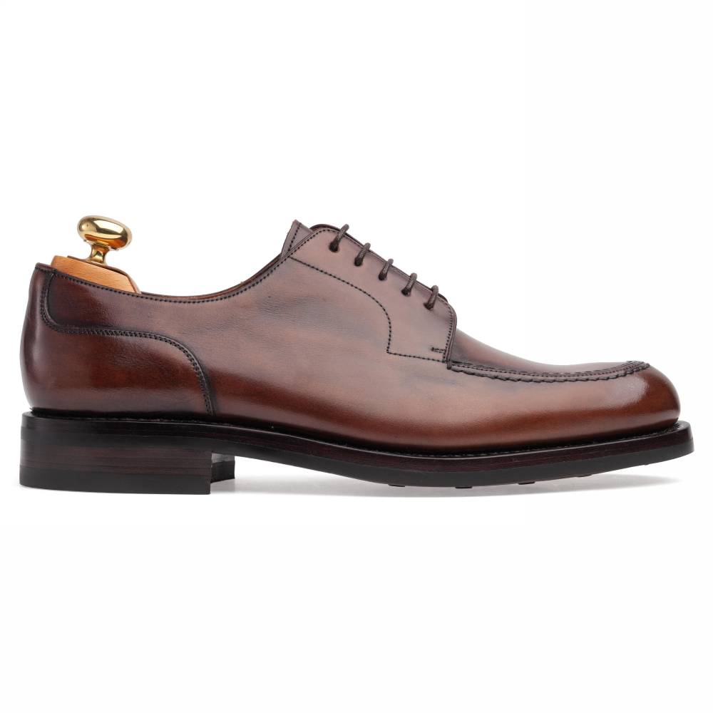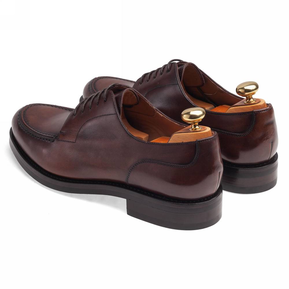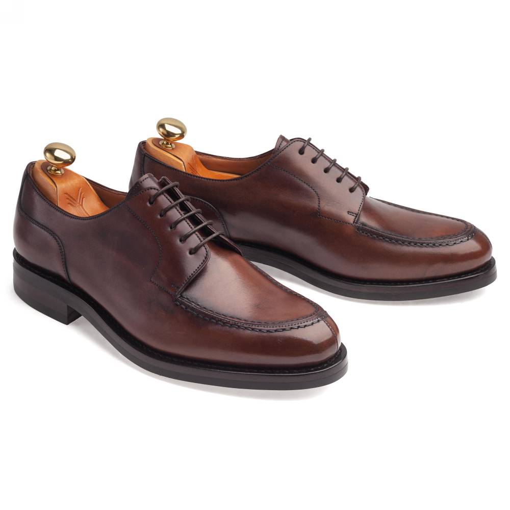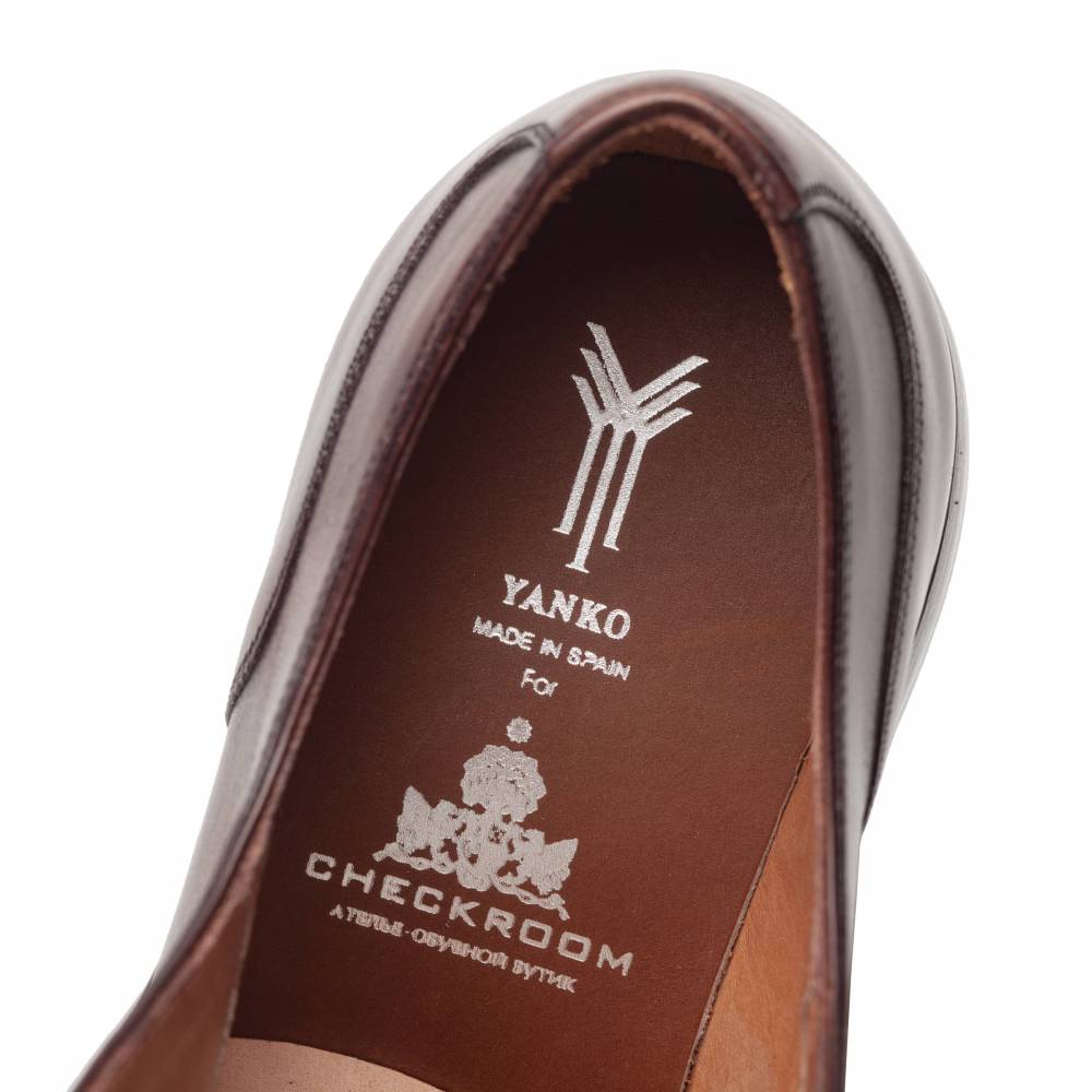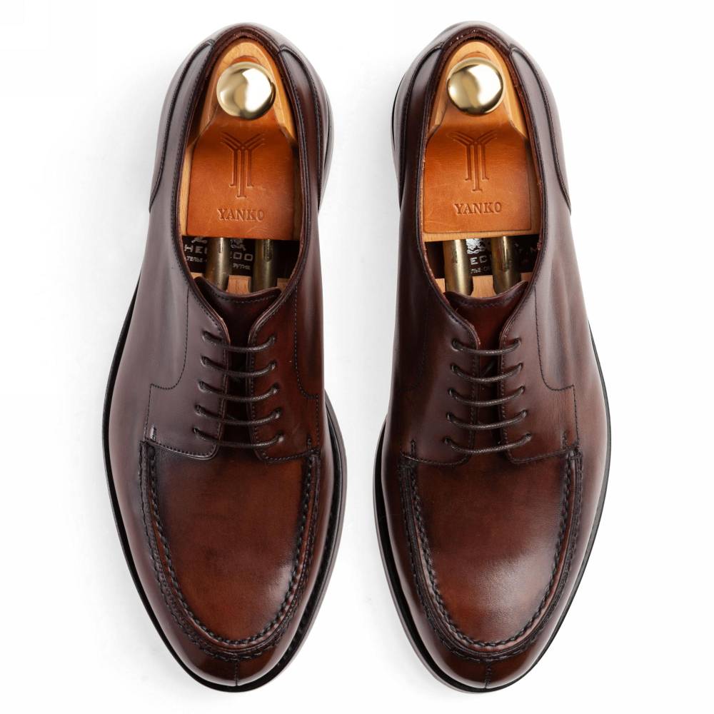 Повседневные туфли-дерби испанского бренда Yanko на практичной резиновой подошве Vibram. Модель представляет собой дерби в норвежском стиле с тремя сшитыми элементами в передней части (split toe derby). Верхняя часть выполнена из высококачественной телячьей кожи тёмно-коричневого цвета. Особенностью модели является ручная окраска, благодаря которой заметна характерная игра цвета и градиентные переливы. Внутренняя отделка из тонкой гладкой кожи. Конструкция Goodyear.