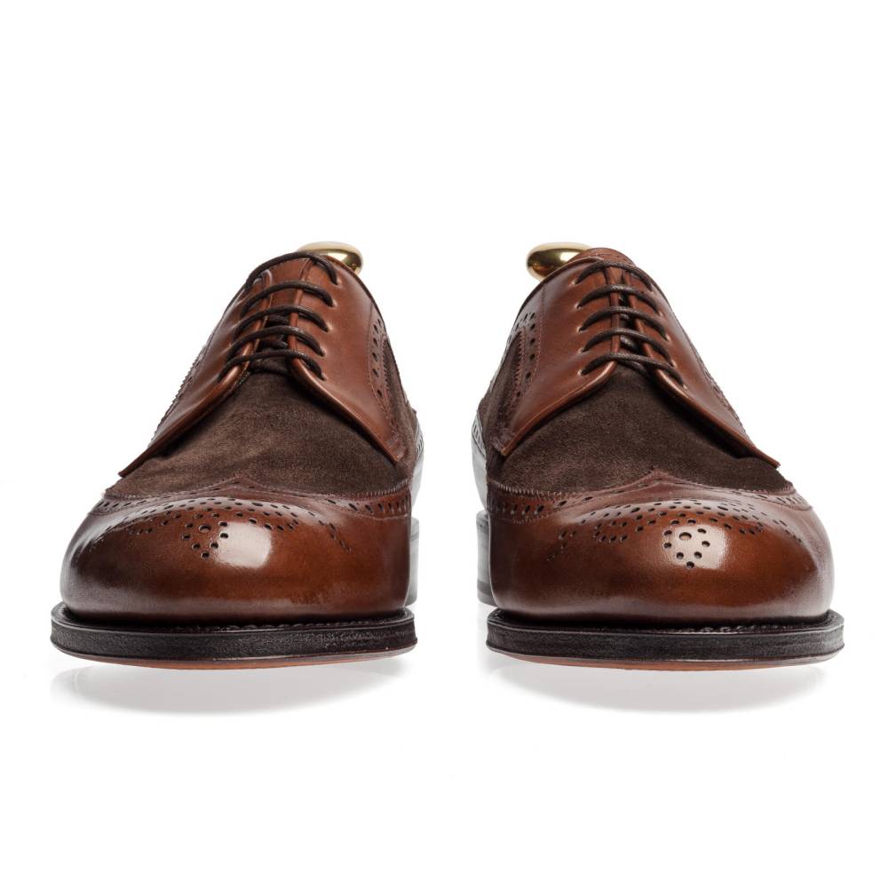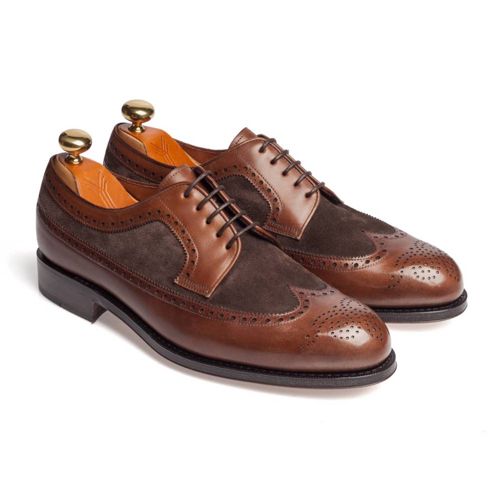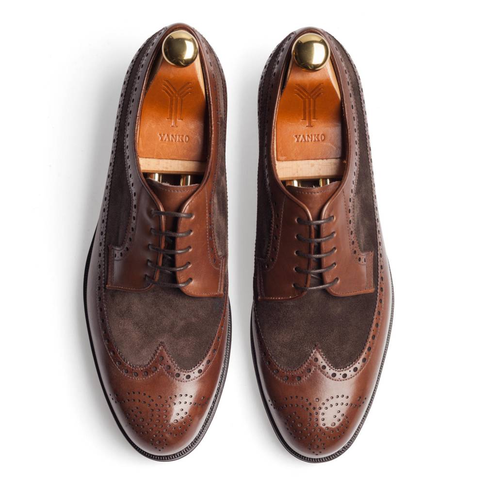 Двухцветная модель “Spectator” от испанского бренда Yanko. По легенде обувь, состоящую из кожи двух цветов, придумал английской обувщик Джон Лобб в 1868 году. Особую популярность модель приобрела в комбинации из чёрных и белых цветов. Спортсмены, знаменитые музыканты 30-х, гангстеры, голливудские звезды и заядлые модники отдавали предпочтение двухцветным туфлям, щеголяя по улицам мировых столиц. Бутик Checkroom представляет данную модель в более спокойной цветовой гамме. Верх выполнен из кожи и замши в коричневых тонах. Туфли украшены традиционной перфорацией и медальоном на мысе. Кожаная подошва. Конструкция Goodyear Welted.