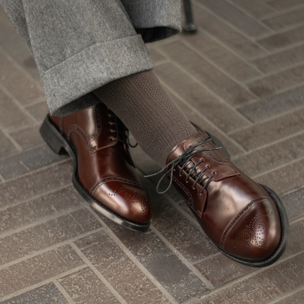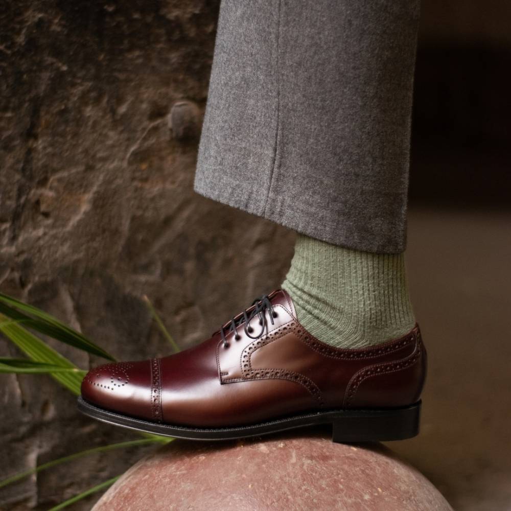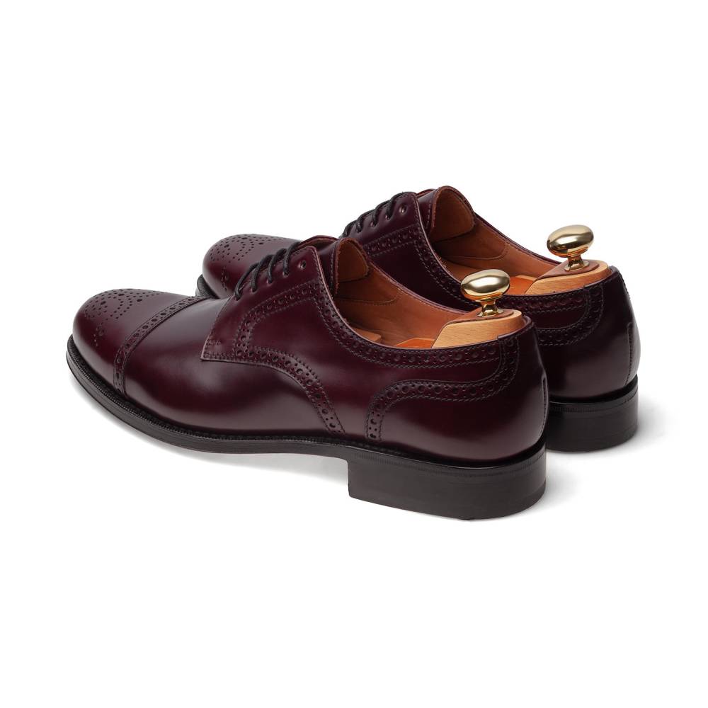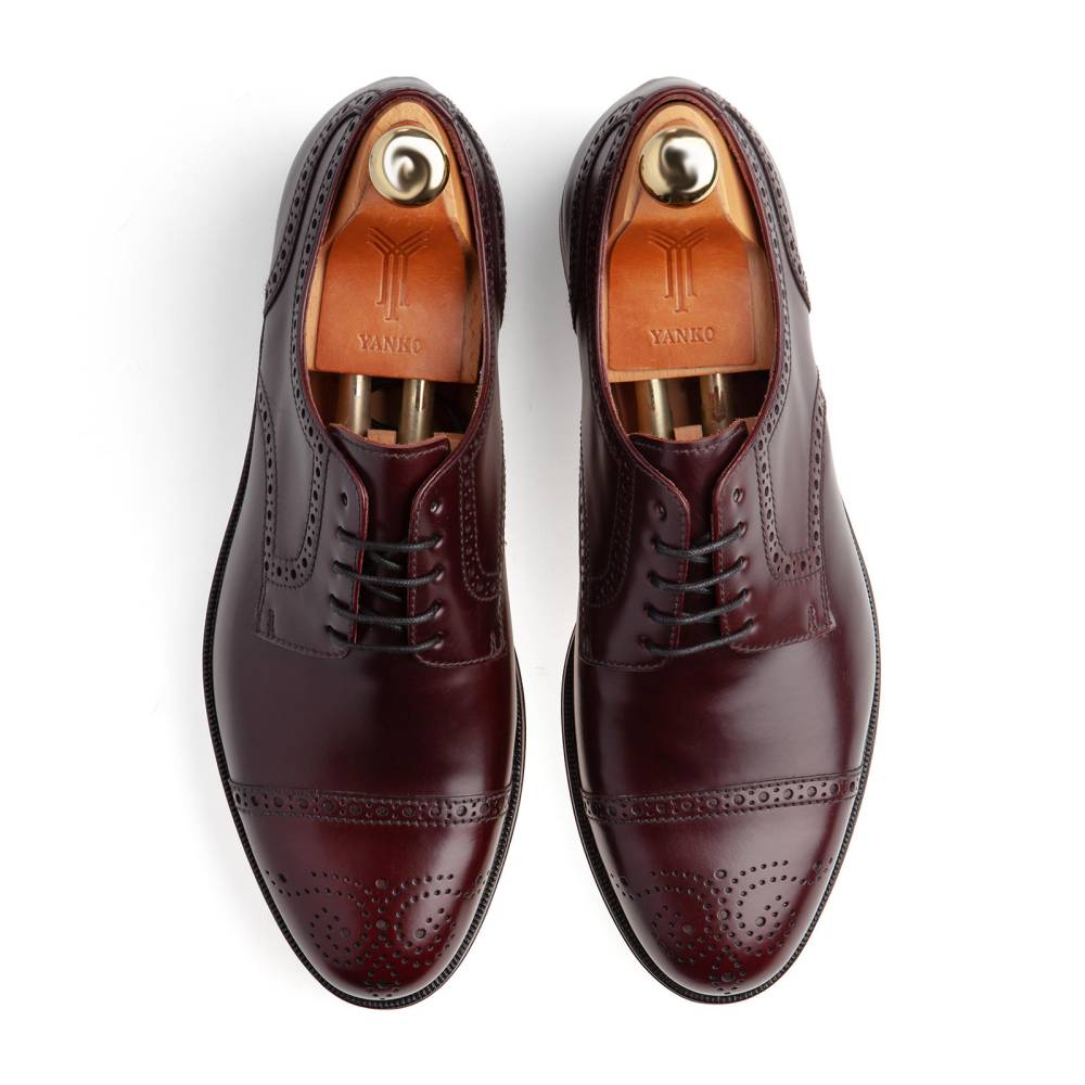 Дерби полуброги от испанской фирмы Yanko благородного винного оттенка. Верх модели выполнен из высококачественной полированной телячьей кожи. Туфли представляют собой традиционный австрийский тип обуви «Alt Wien» (Старая Вена), с характерным для него медальоном на мысе и перфорацией на берцах. Кожаная подошва. Конструкция Goodyear Welted.