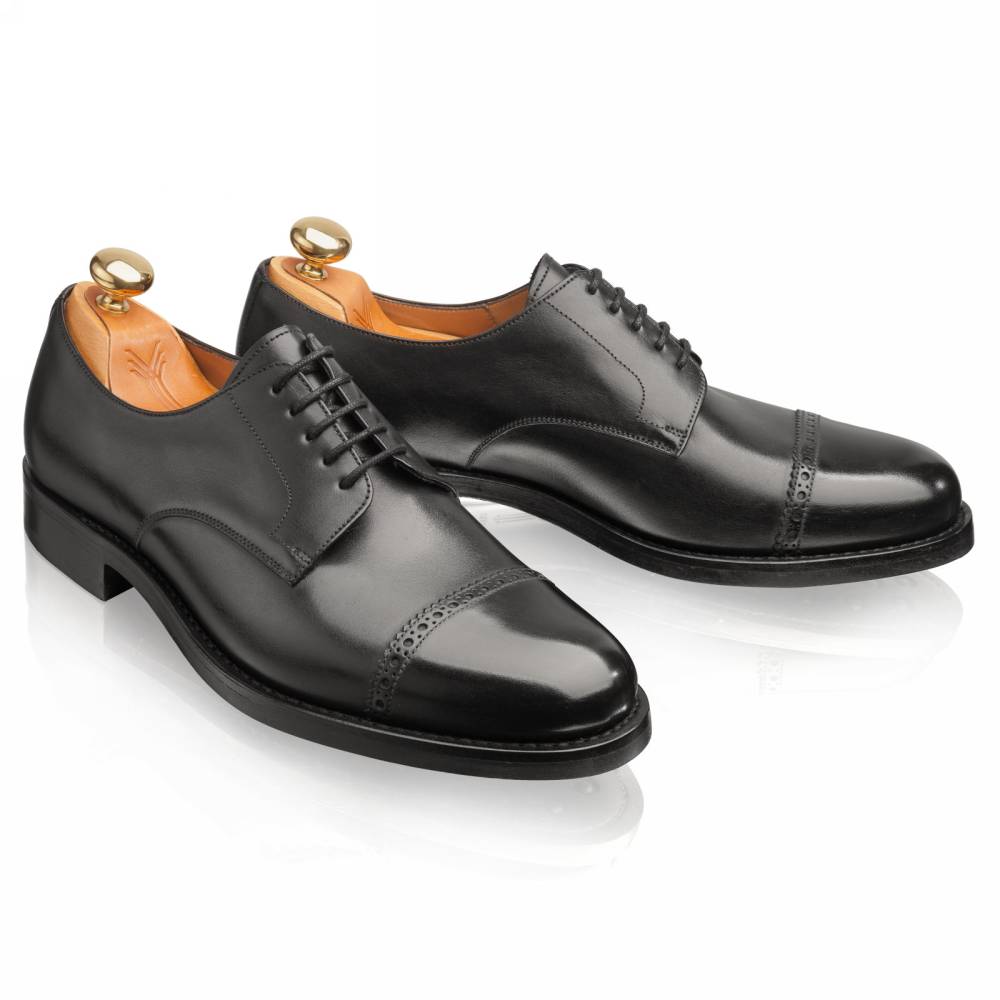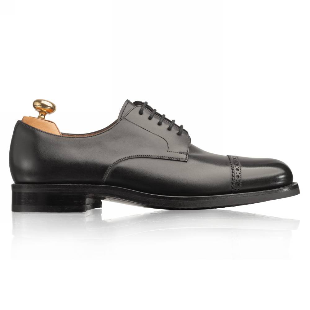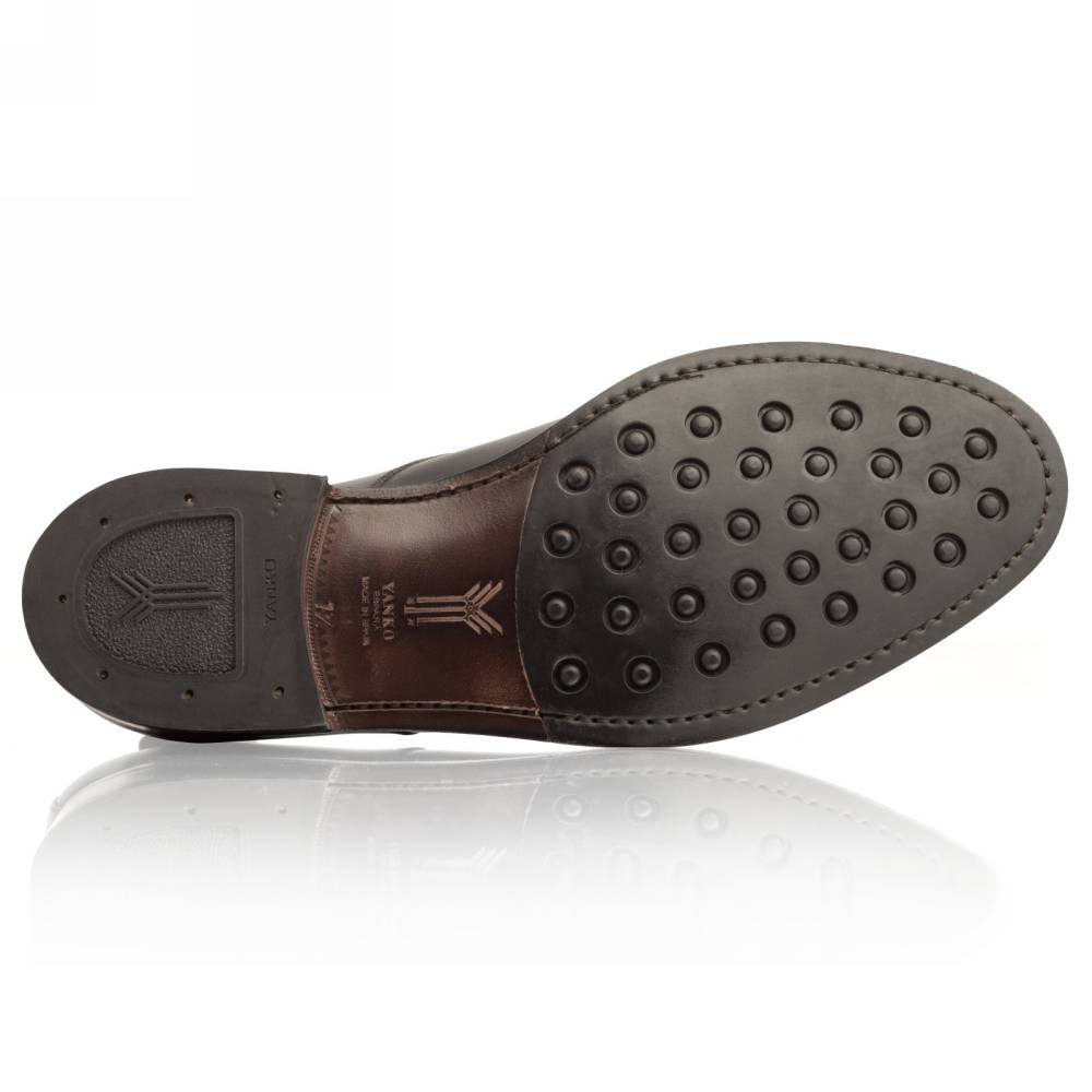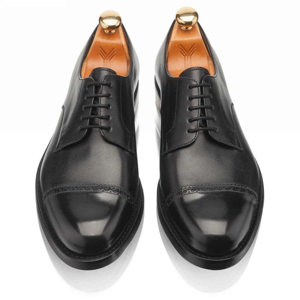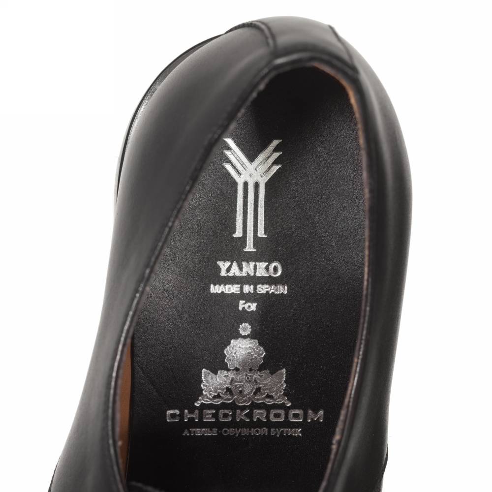 Повседневные классические дерби Yanko выполнены из гладкой телячьей кожи чёрного цвета. Верхняя часть украшена ненавязчивой перфорацией вдоль шва на мыске. Модель имеет практичную подошву из кожи и резины, которая превосходно подходит для города в дождливое время года. Конструкция Goodyear Welted.