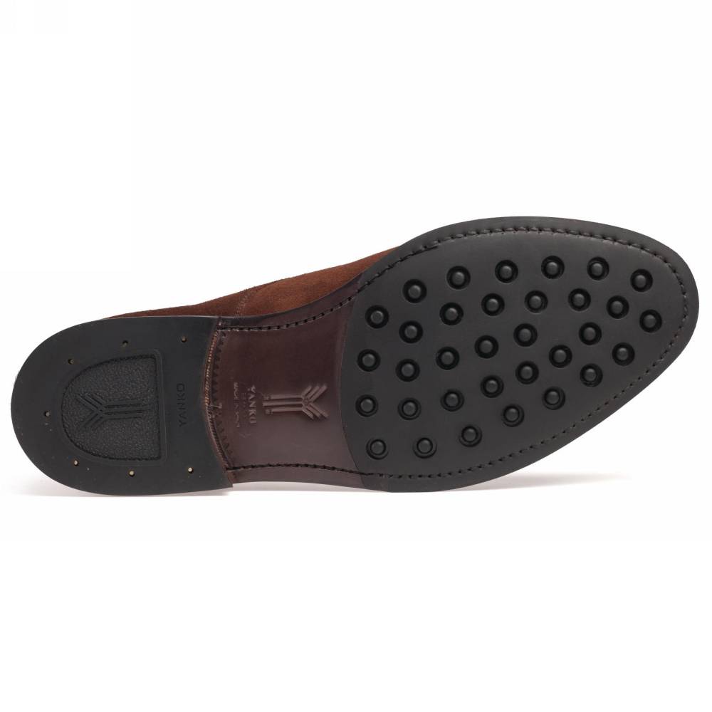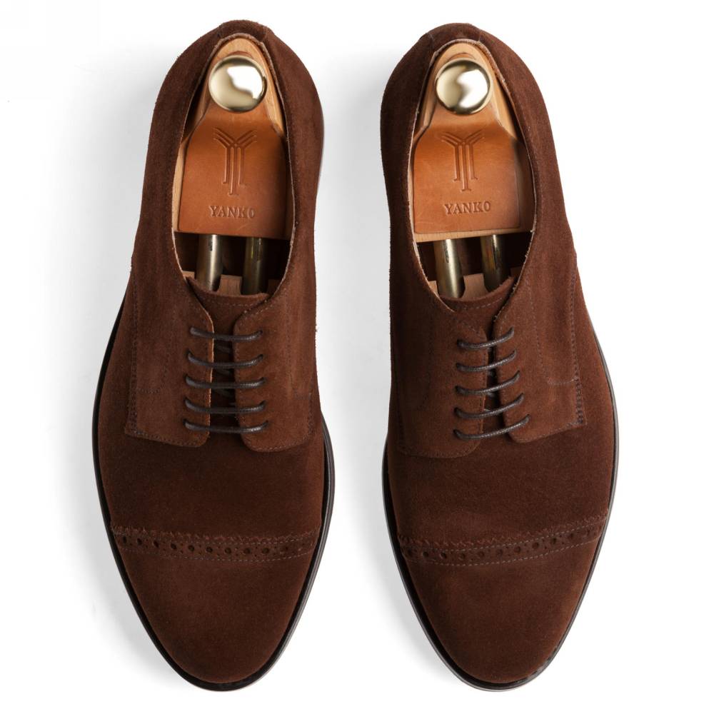 Универсальные мужские дерби испанской фабрики Yanko выполнены из высококачественной бархатистой замши коричневого цвета. Модель украшена перфорацией вдоль шва на отрезном мыске. Внутренняя отделка из гладкой телячьей кожи бежевого оттенка. Модель имеет практичную износостойкую подошву из кожи и резины. Изготовлена по специальному заказу бутика Checkroom. Конструкция Goodyear Welted.