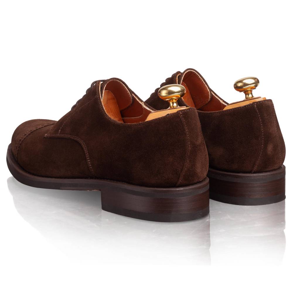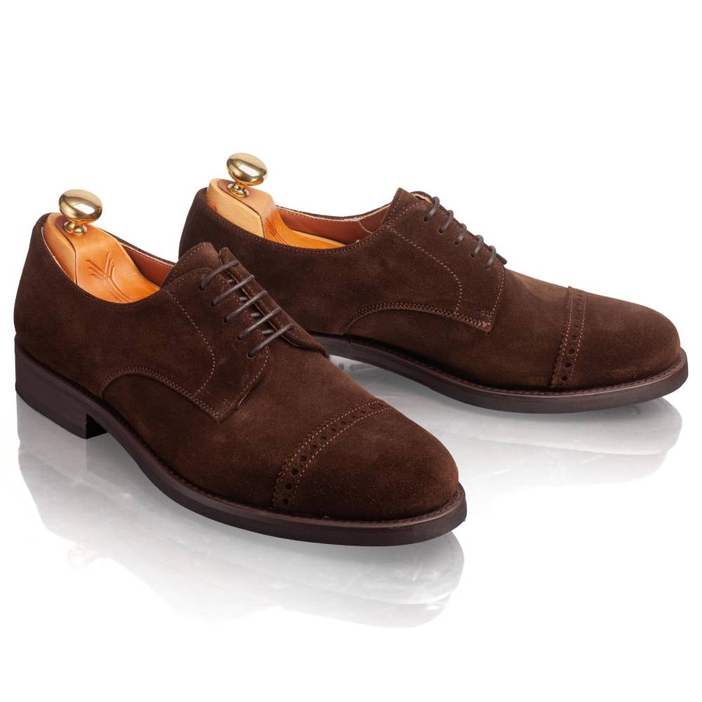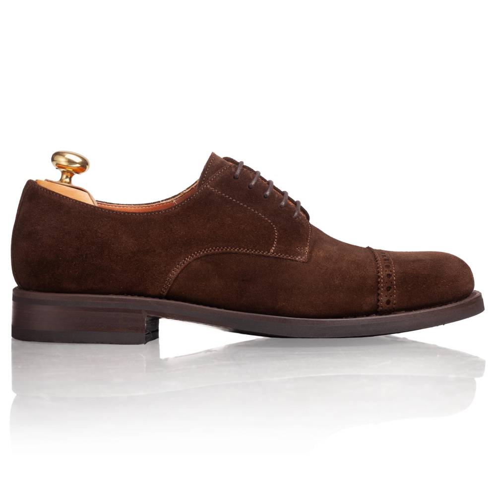 Универсальные мужские дерби испанской фабрики Yanko выполнены из высококачественной телячьей замши Repello Gum Oil. Этот материал обрабатывается по специальной технологии с нанесением масла, что придает ему повышенную долговечность, уникальные тактильные ощущения и привлекательный внешний вид. Модель украшена перфорацией вдоль шва на отрезном мыске. Внутренняя отделка из гладкой телячьей кожи бежевого оттенка. Модель имеет практичную износостойкую подошву из кожи и резины. Изготовлена по специальному заказу бутика Checkroom. Конструкция Goodyear Welted.