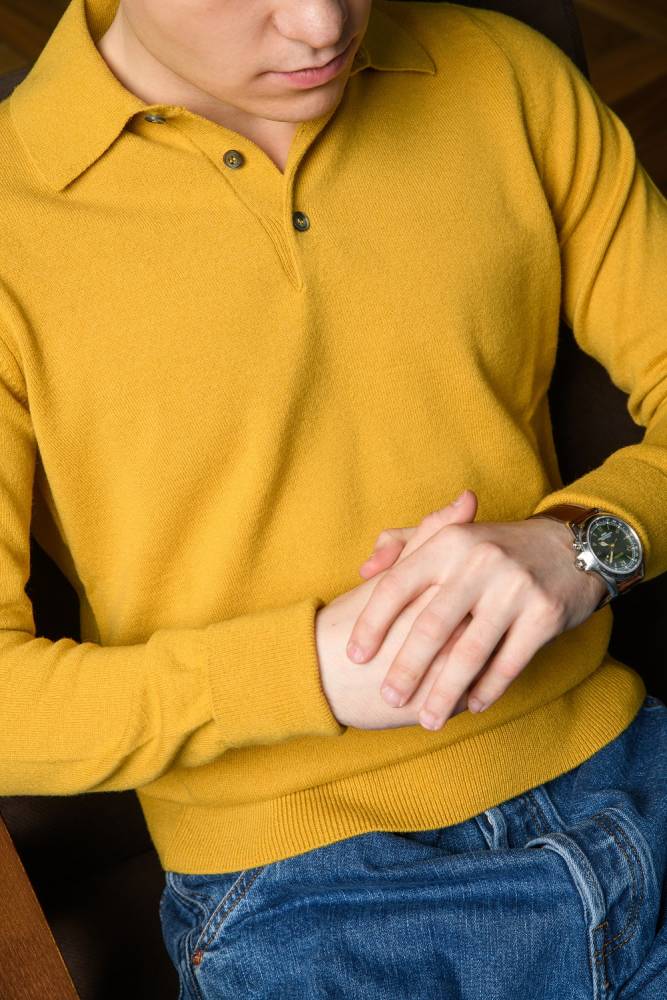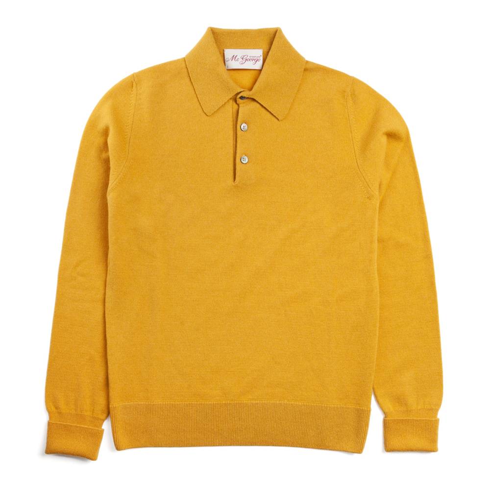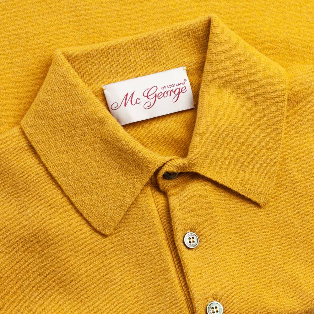 Тёплый элегантный джемпер-поло McGeorge of Scotland жёлтого цвета. Модель выполнена из мягкого приятного на ощупь трикотажа, в состав которого входят шерсть и кашемир. Характерный для поло отложной воротник застегивается на три пуговицы. Традиционные эластичные манжеты и низ. Модель прекрасно дополнит повседневный классический гардероб нестрого стиля. Джемпер-поло можно носить под пиджаком, или же надевать на сорочку.