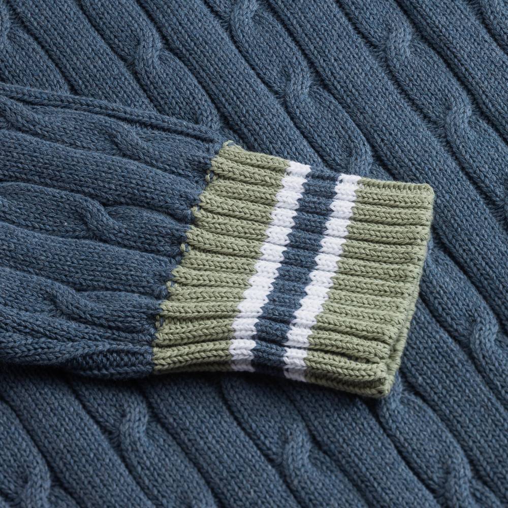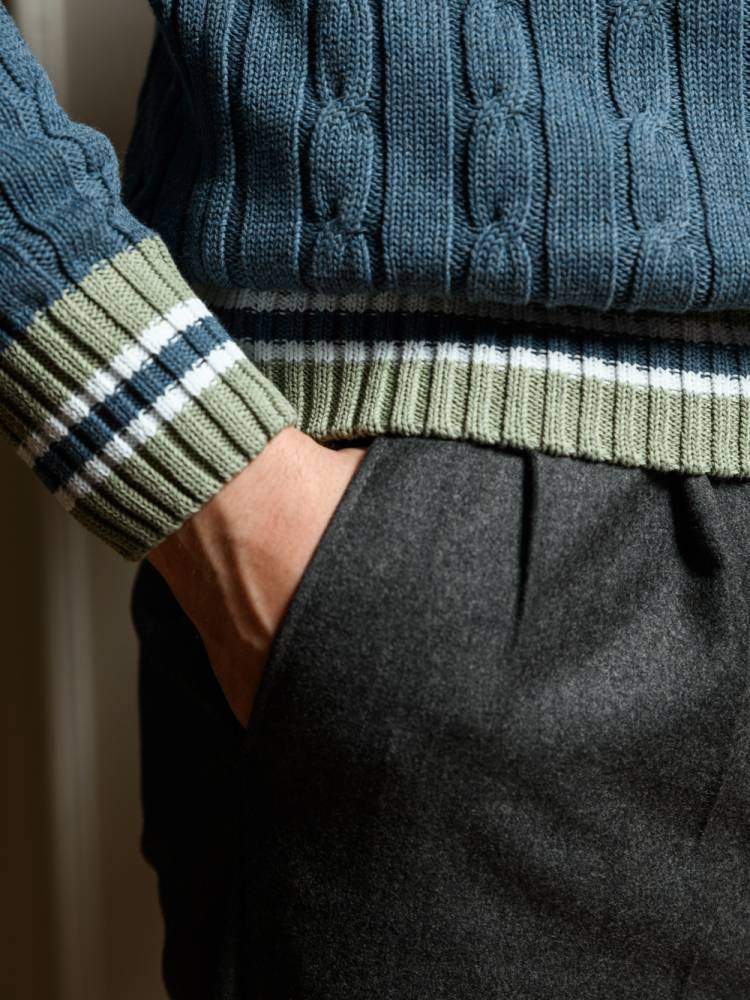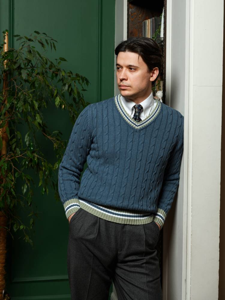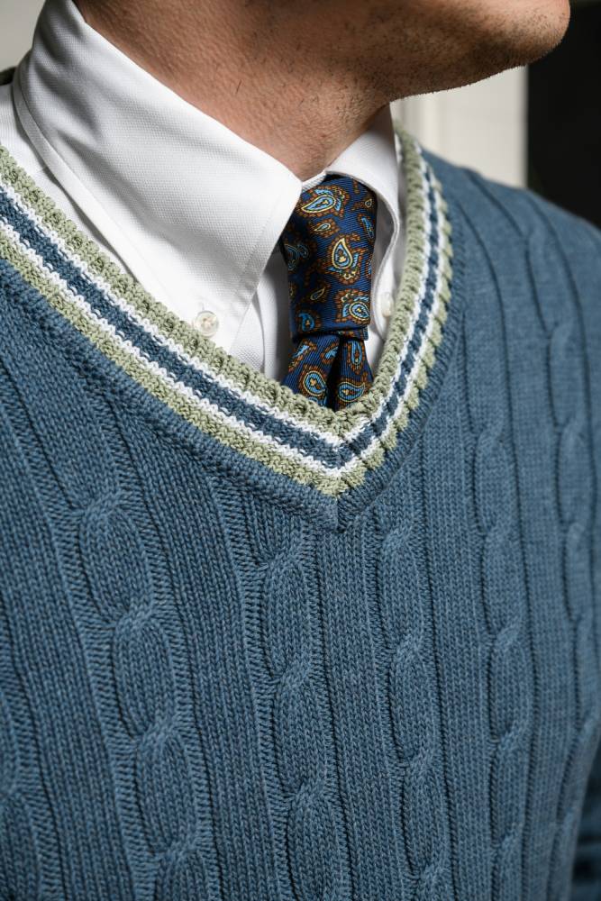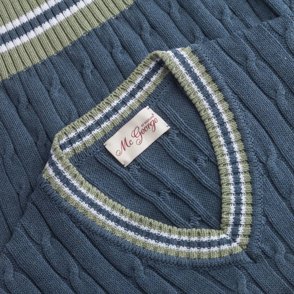 Классический джемпер для крикета Nottingham бренда McGeorge of Scotland синего цвета с традиционным V-образным вырезом и контрастными краями. Выполнен из мягкого перуанского хлопка Pima, который отличается тонкими и длинными волокнами: изделия из такого хлопка приятны к телу и долговечны. Рукав втачной. Фактурная кабельная вязка. Джемпер прекрасно сочетается с casual-образами в светлых или тёмных тонах.