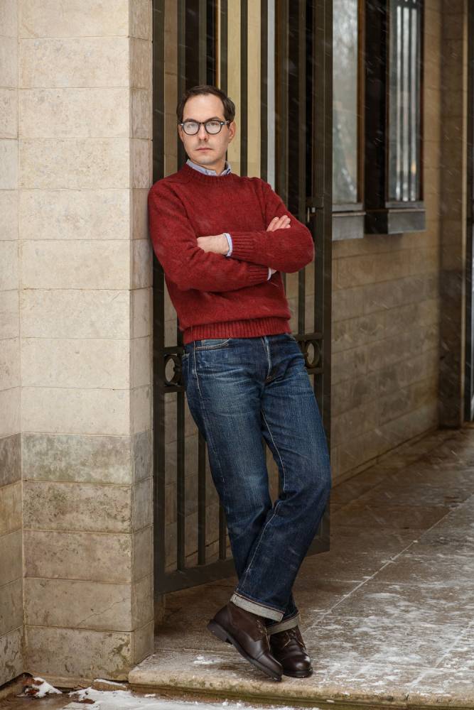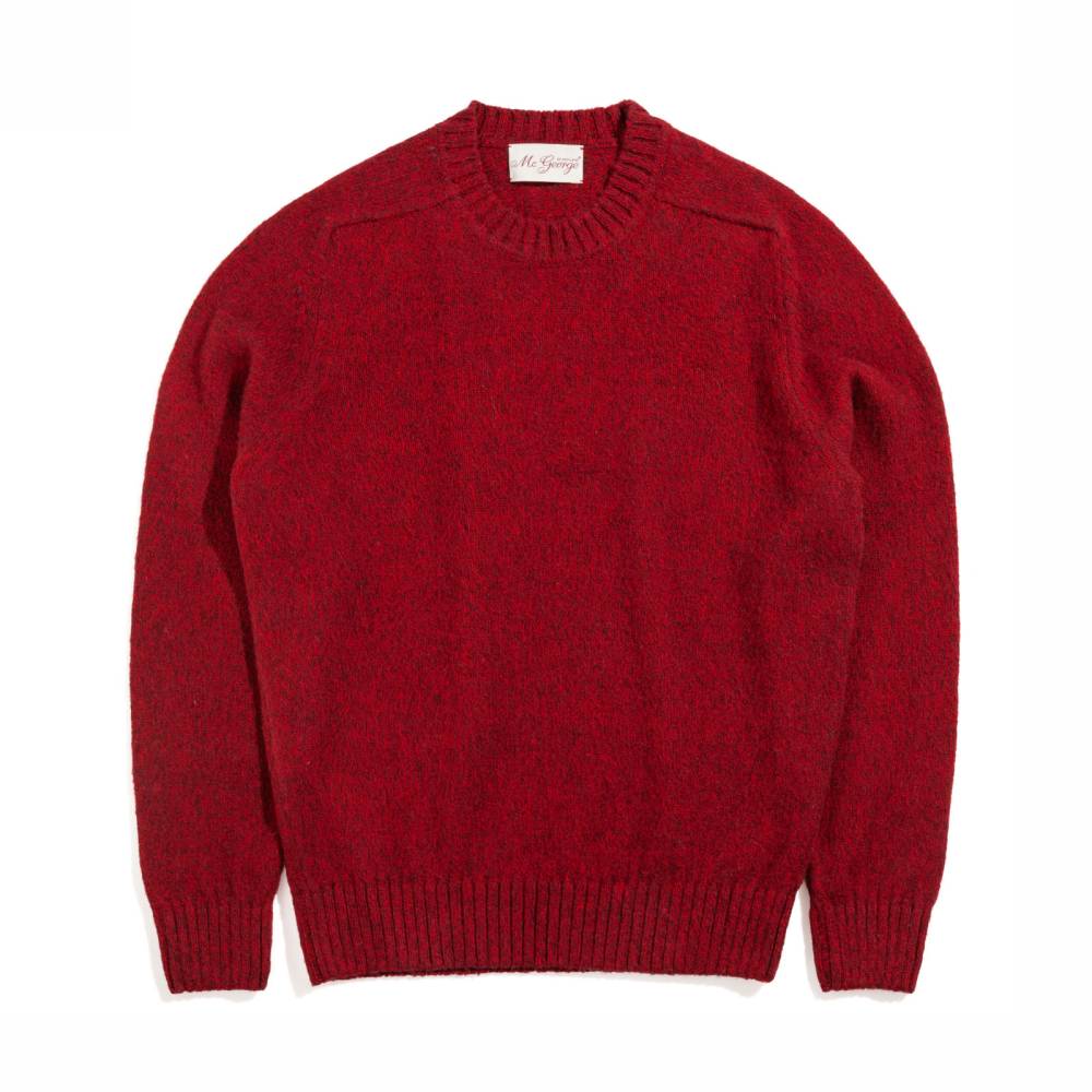 Тёплый мужской джемпер из мягкой чёсаной (англ. shaggy) шетлендской шерсти благородного бордового цвета с рукавом реглан (англ. saddle shoulder). Особо стоит отметить разные оттенки и неоднородность пряжи при ближнем рассмотрении, что в целом создаёт уникальную палитру цветов. Универсальный предмет мужского гардероба, который пользуется большой популярностью у ценителей неформального классического стиля, в особенности стиля Лиги плюща. Свободный крой и аккуратный ворот позволяют вписать такой джемпер и в комплекты в стиле casual, и в умеренно формальные образы.