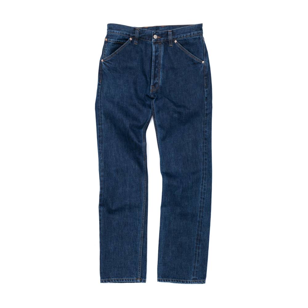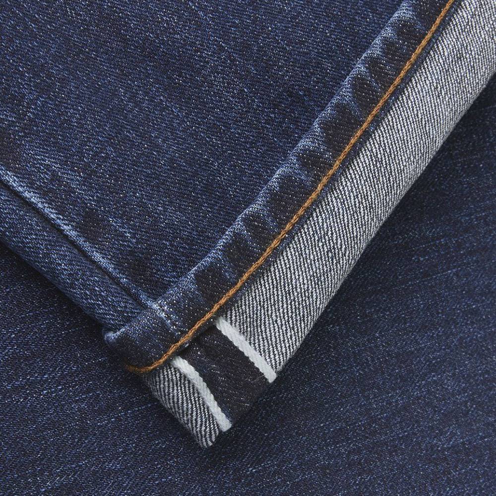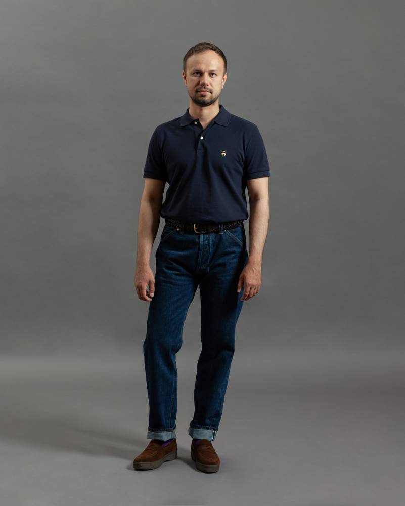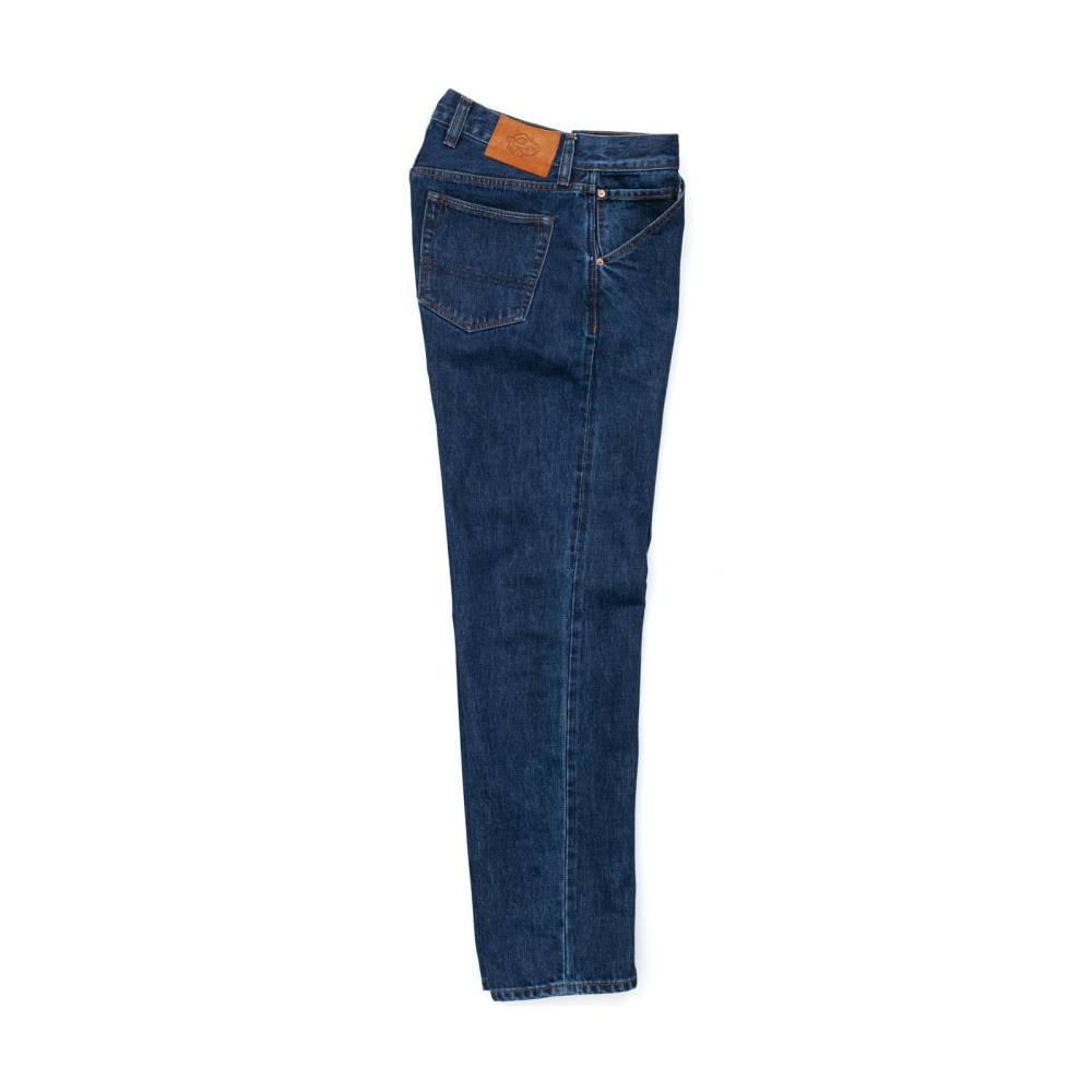 Классические прямые мужские джинсы английской марки Drake's сшиты из японского селвидж-денима, сотканного в префектуре Окаяма и окрашенного натуральным индиго. Эти джинсы будут уместны практически в любой обстановке: такая ткань долго сохраняет первоначальный вид, и фейд на ней образуется неконтрастный. Ткань средней плотности (14 унций) не требует усадки (pre-washed denim) и прошла обработку пемзой (stone-washed denim) для достижения слегка неоднородной окраски. Заклёпки на джинсах сделаны из меди, а задние карманы укреплены скрытыми заклёпками, которые не поцарапают мебель или автомобильное сиденье. Передние карманы косые; посадка средняя, но чуть выше обычной, поэтому джинсы будут хорошо смотреться с нестрогими пиджаками.