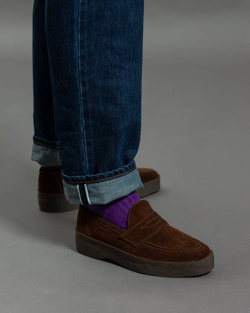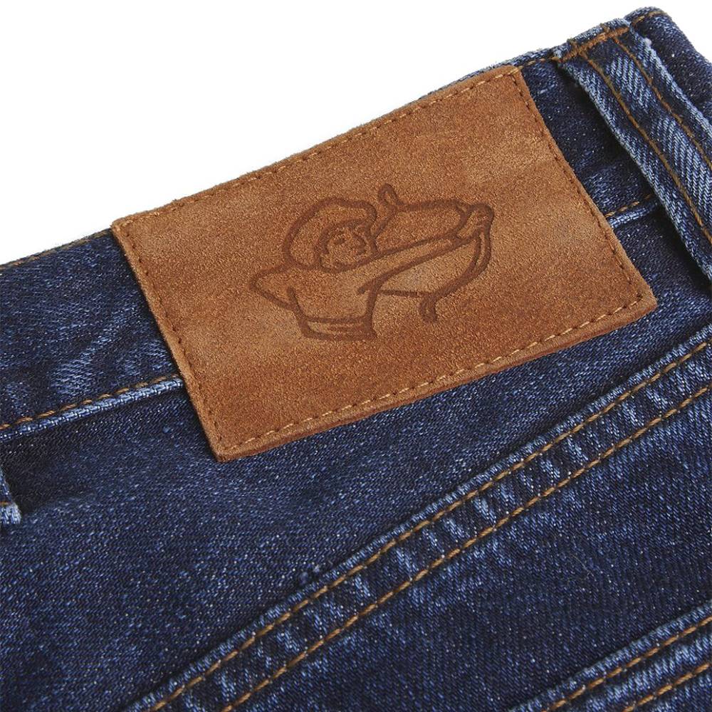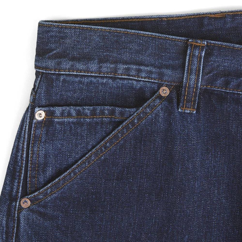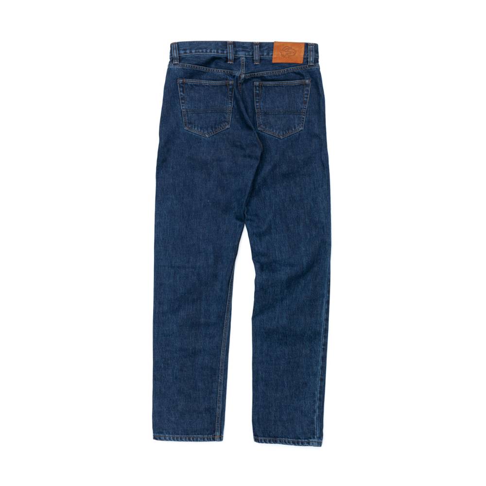 Классические прямые мужские джинсы английской марки Drake's сшиты из японского селвидж-денима, сотканного в префектуре Окаяма и окрашенного натуральным индиго. Эти джинсы будут уместны практически в любой обстановке: такая ткань долго сохраняет первоначальный вид, и фейд на ней образуется неконтрастный. Ткань средней плотности (14 унций) не требует усадки (pre-washed denim) и прошла обработку пемзой (stone-washed denim) для достижения слегка неоднородной окраски. Заклёпки на джинсах сделаны из меди, а задние карманы укреплены скрытыми заклёпками, которые не поцарапают мебель или автомобильное сиденье. Передние карманы косые; посадка средняя, но чуть выше обычной, поэтому джинсы будут хорошо смотреться с нестрогими пиджаками.