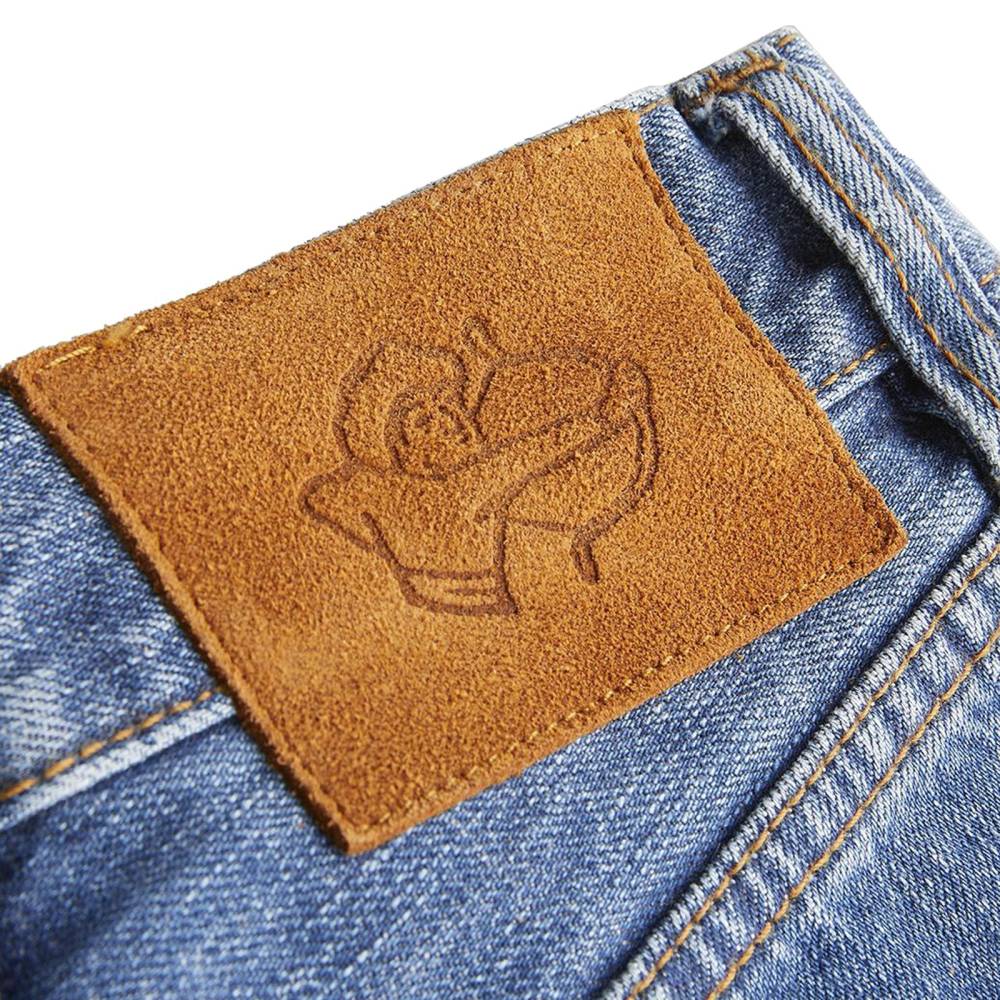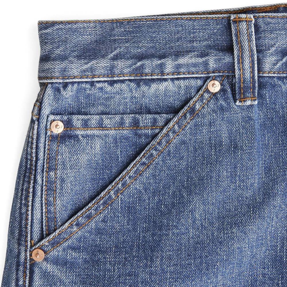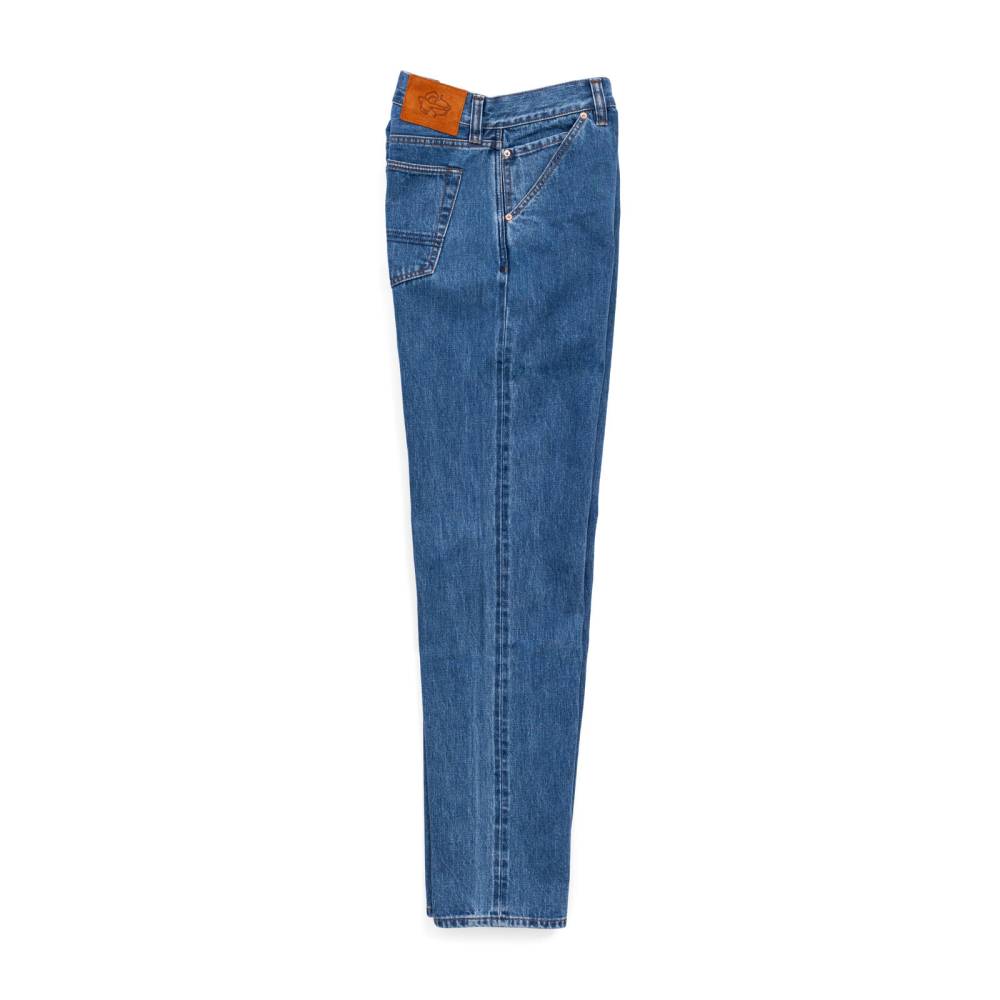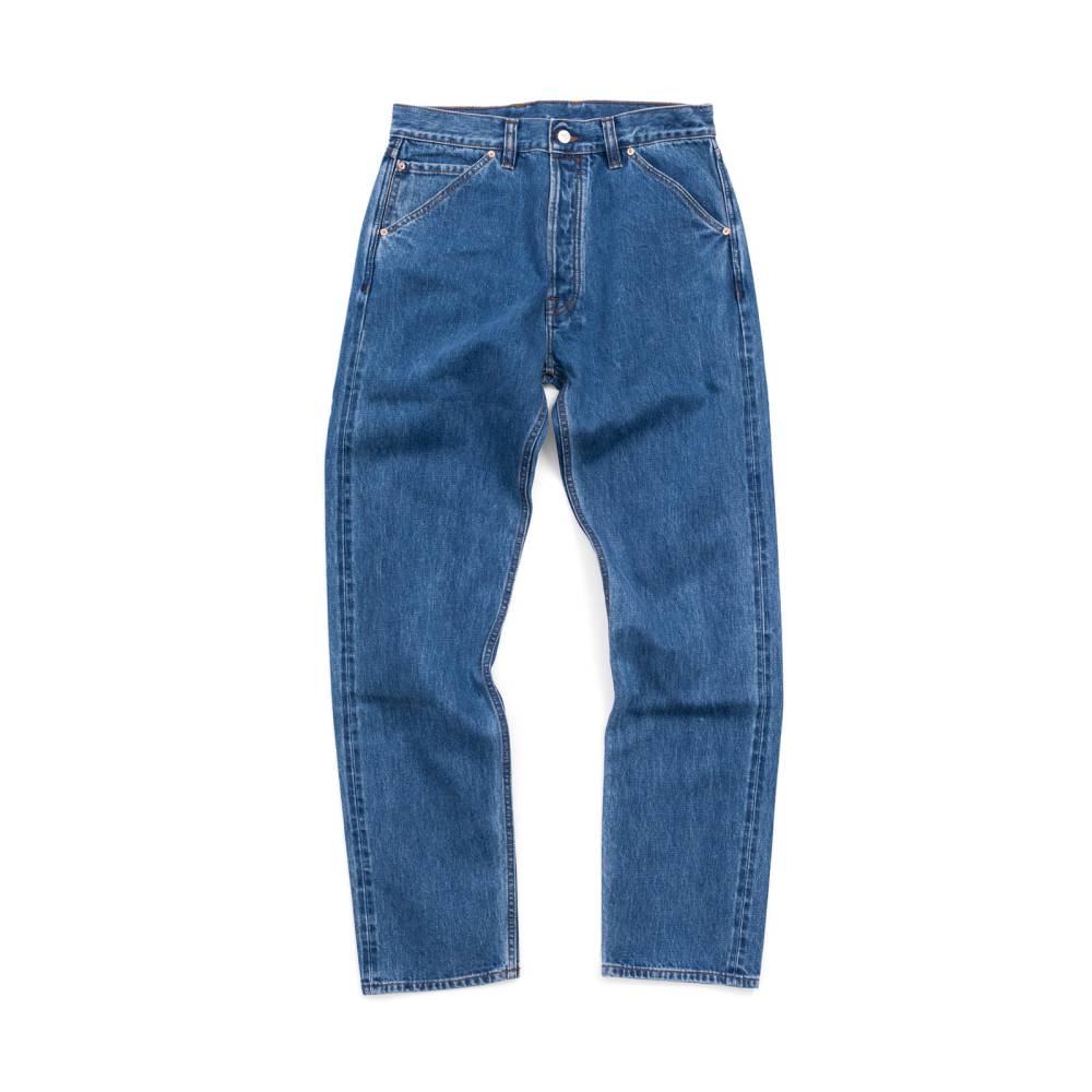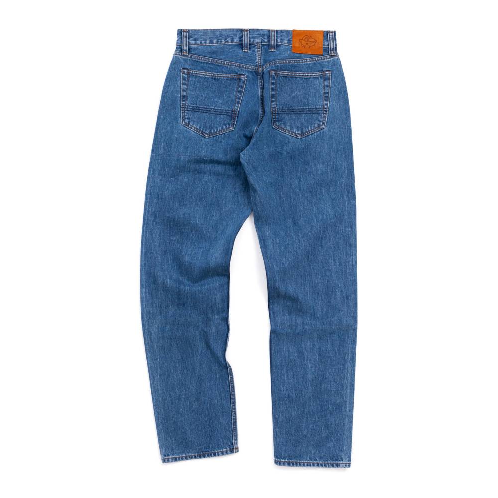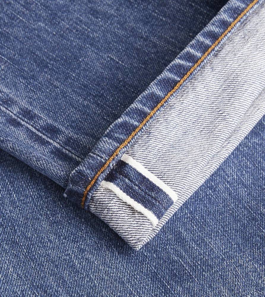 Классические прямые мужские джинсы английской марки Drake's сшиты из японского селвидж-денима, сотканного в префектуре Окаяма и окрашенного натуральным индиго. Эти джинсы будут уместны практически в любой обстановке: такая ткань долго сохраняет первоначальный вид, и фейд на ней образуется неконтрастный. Ткань средней плотности (14 унций) не требует усадки (pre-washed denim) и прошла обработку пемзой (stone-washed denim) для достижения слегка неоднородной окраски. Заклёпки на джинсах сделаны из меди, а задние карманы укреплены скрытыми заклёпками, которые не поцарапают мебель или автомобильное сиденье. Передние карманы косые; посадка средняя, но чуть выше обычной, поэтому джинсы будут хорошо смотреться с нестрогими пиджаками.