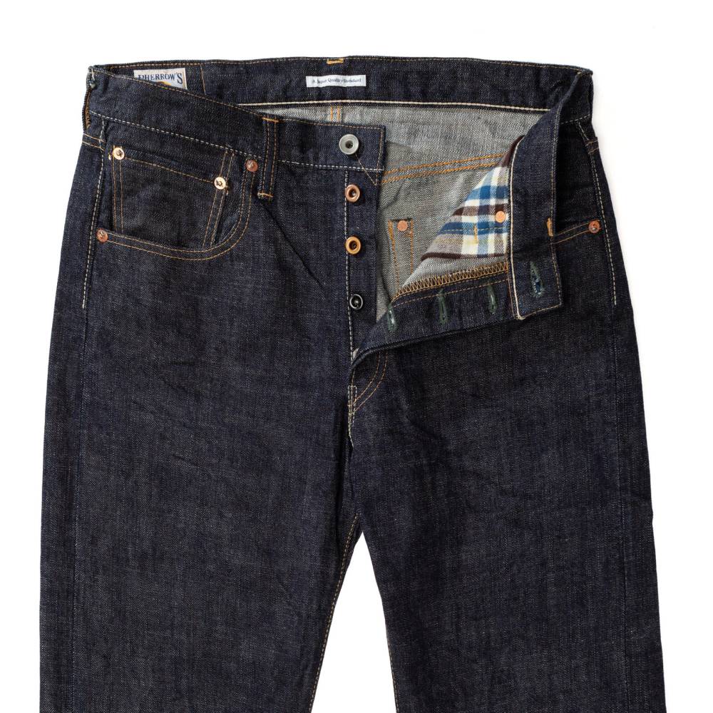 Флагманская модель бренда Pherrow's – 421SW. Изготовлена в Японии из плотного денима 13,75 унций. Сэлвидж деним с фирменной желтой строчкой произведен эксклюзивно по заказу Pherrow's из хлопка, выращенного в США, на оригинальных станках прошлых столетий. Модель представляет собой аутентичный силуэт джинсов, характерный для послевоенного времени. Для данной модели используется шишковидная пряжа, что делает деним фактурным, приятным на ощупь и влияет на процесс фэйдинга (рисунок, образуемый за счет выцветания джинсов после стирок). Джинсы 421SW прямого неширокого кроя, который визуально удлиняет ноги и не стесняет движения. Джинсы не дают усадку после стирки и со временем становятся мягче и комфортнее. Средняя посадка талии. Внутренняя ткань карманов из клетчатой фланели.