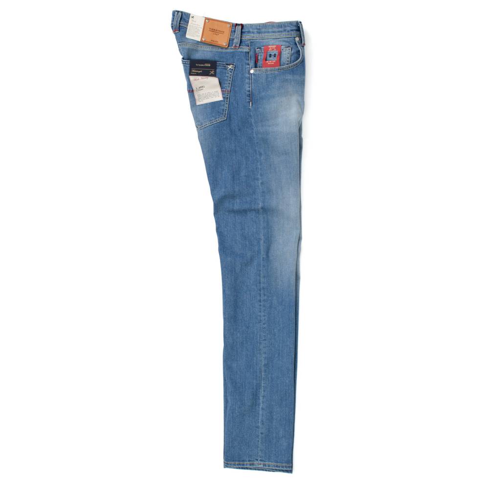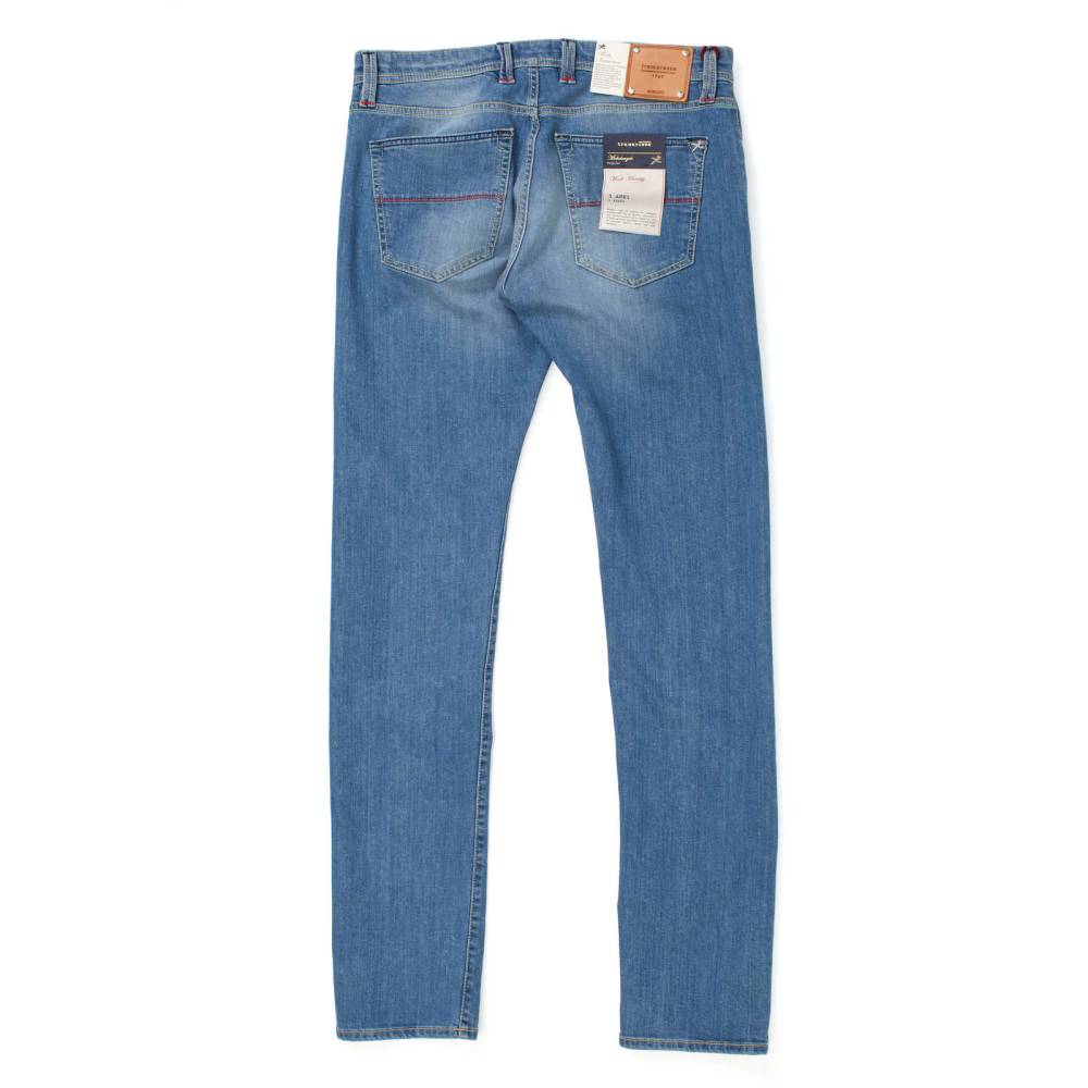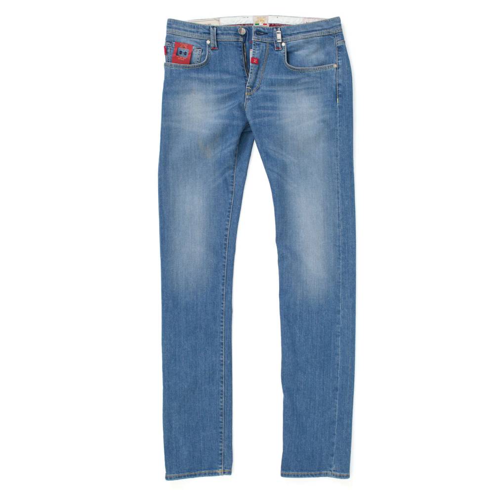Мужские джинсы Michelangelo прямого силуэта «regular fit» бренда Sartoria Tramarossa. Модель выполнена из мягкого высококачественного денима, украшенного фирменными контрастными строчками и авторской фурнитурой. Джинсы застегиваются на молнию и пуговицу. Пояс декорирован кожаной нашивкой с логотипом бренда.