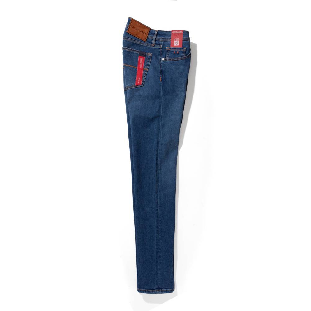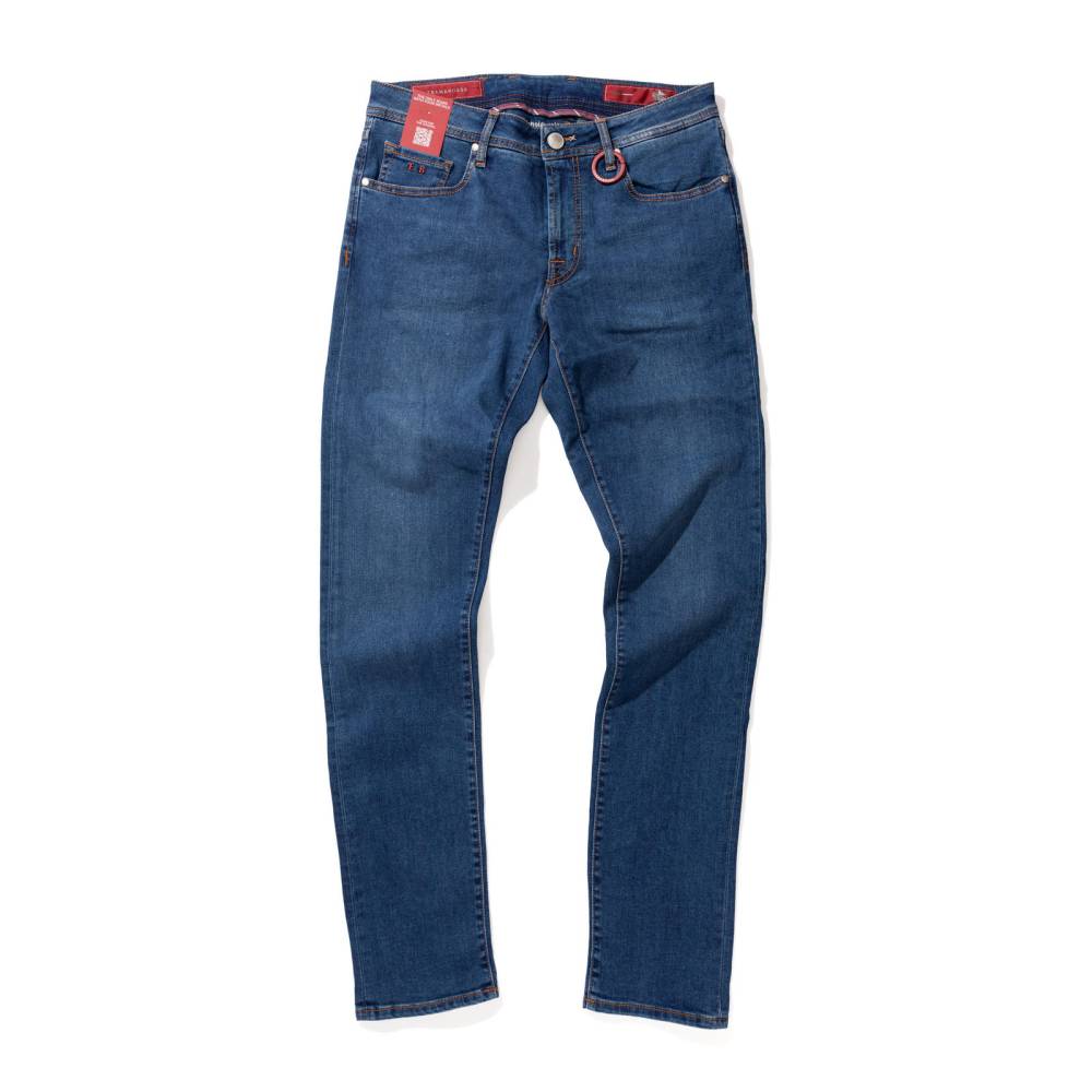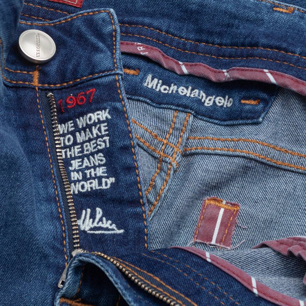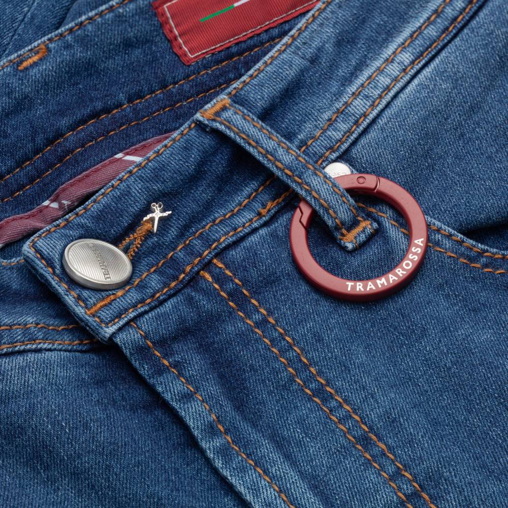 Лаконичные джинсы итальянского бренда Tramarossa — модель Michelangelo. Зауженный книзу силуэт (Slim Fit) с посадкой чуть ниже средней. Инновационный супер эластичный габардин (Superstretch Gabardine) синего цвета. Уникальная растяжимость (6% полиэстера, 2% эластана) обеспечивает идеальную посадку, сохранение формы и максимальную свободу движений. Застежка на молнию, пять карманов, контрастные строчки. Подходит для всех сезонов.