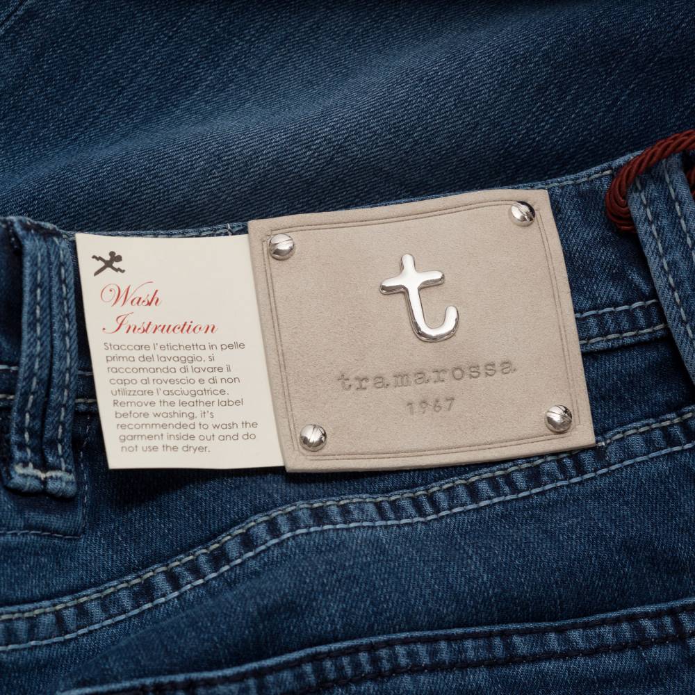 Мужские джинсы Michelangelo прямого силуэта «regular fit» бренда Sartoria Tramarossa. Модель выполнена из мягкого высококачественного денима, украшенного фирменными контрастными строчками и авторской фурнитурой. Джинсы застегиваются на молнию и пуговицу. Пояс декорирован кожаной нашивкой с логотипом бренда.