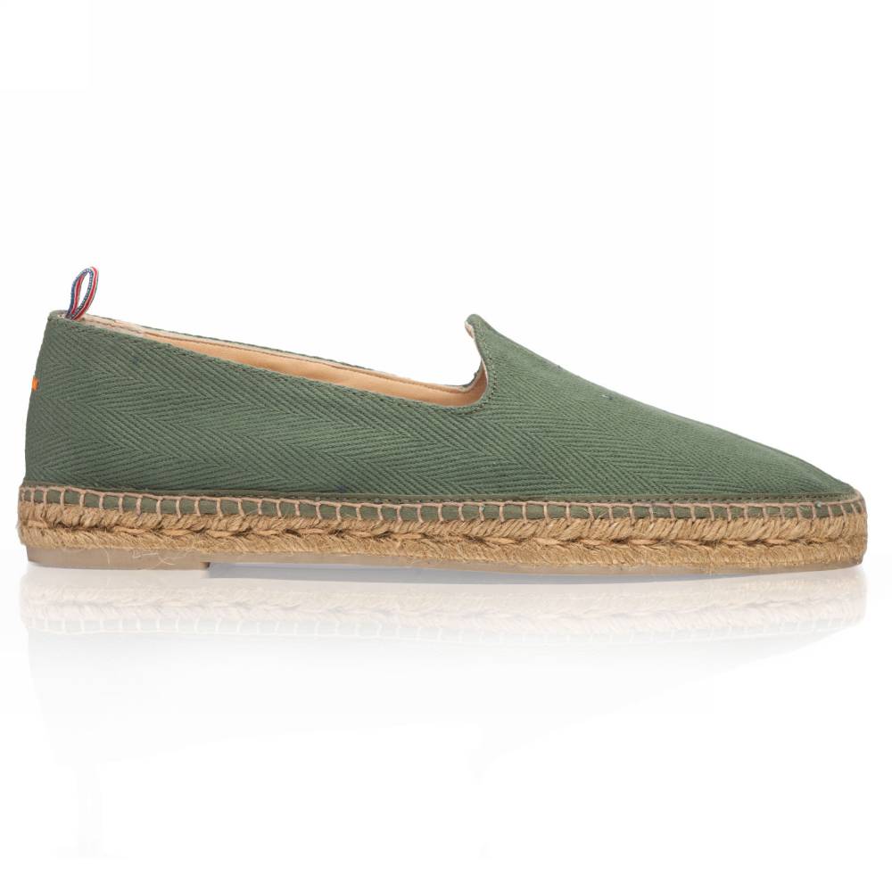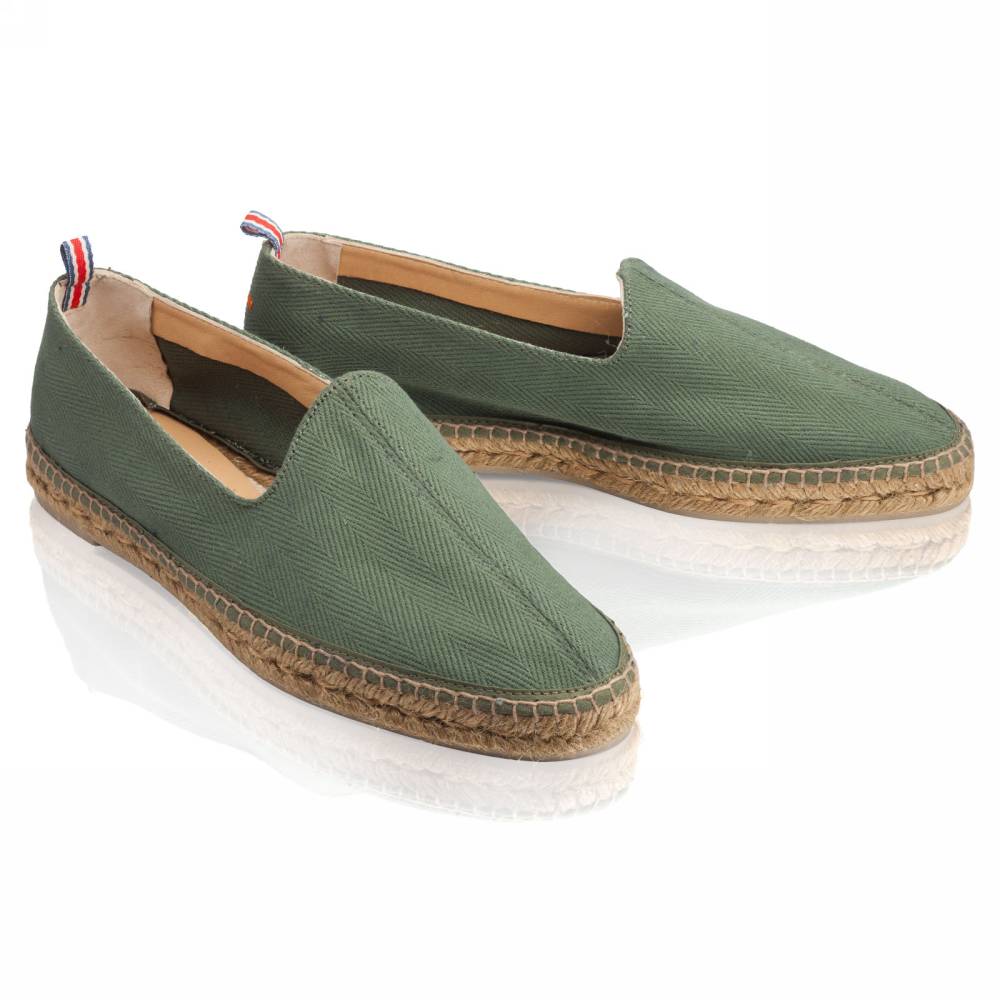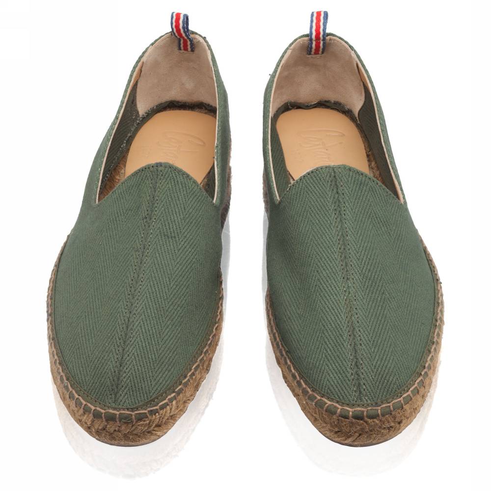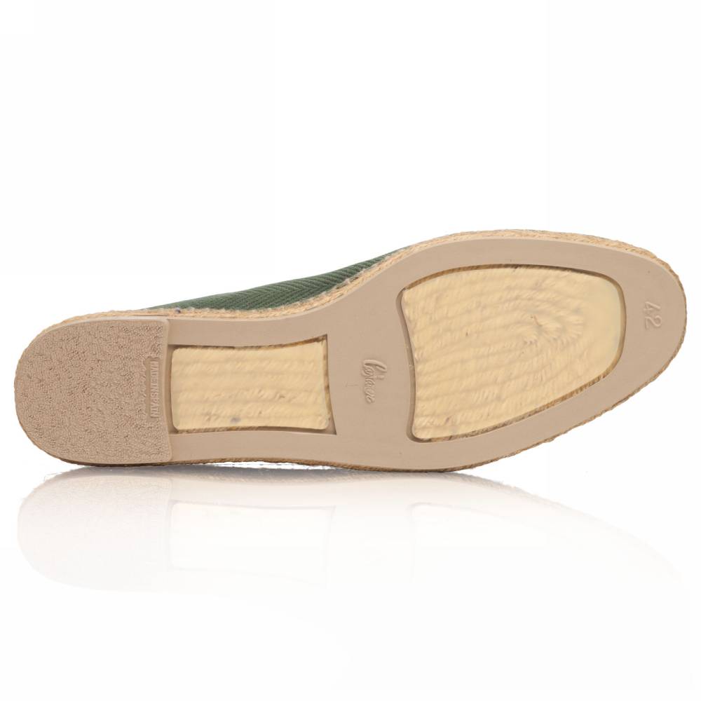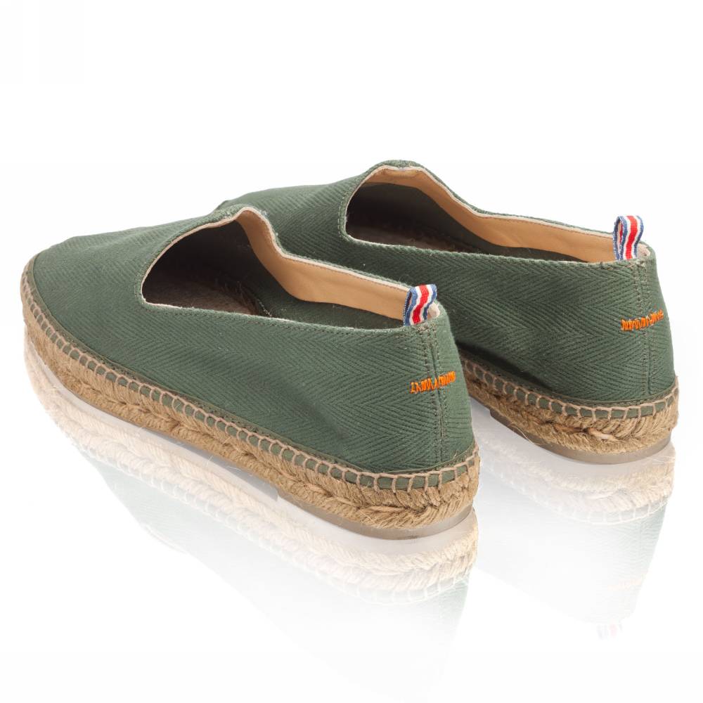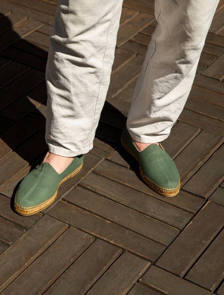 Лёгкие эспадрильи Jaime испанского бренда Castañer созданы из качественных натуральных материалов. Верх выполнен из плотного текcтиля зелёного цвета в ёлочку без подкладки. Подошва состоит из нескольких слоёв джута - натурального волокнистого материала. Благодаря джуту обувь имеет высокую воздухопроницаемость и идеально подходит даже для самой жаркой погоды. От влаги и изнашивания джутовую подошву защищает тонкий слой резины снизу.