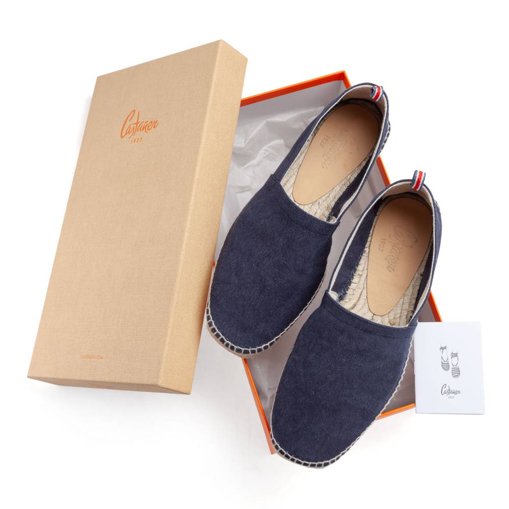 Культовые эспадрильи Pablo испанского бренда Castañer созданы из качественных натуральных материалов. Верх выполнен из плотного канваса тёмно-синего цвета без подкладки. Подошва состоит из нескольких слоёв джута - натурального волокнистого материала. Благодаря джуту обувь имеет высокую воздухопроницаемость и идеально подходит даже для самой жаркой погоды. От влаги и изнашивания джутовую подошву защищает тонкий слой резины снизу.