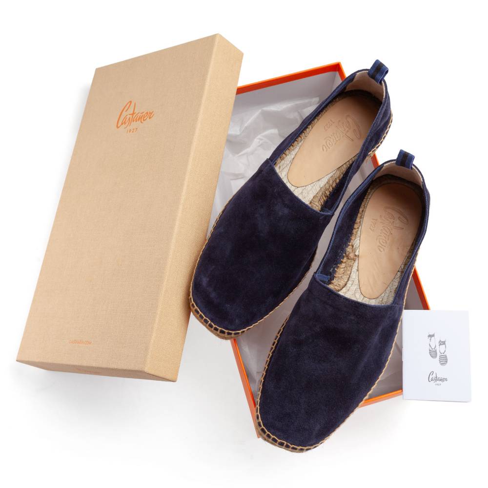 Культовые эспадрильи Pablo испанского бренда Castañer созданы из качественных натуральных материалов. Верх выполнен из мягкой натуральной замши тёмно-синего цвета без подкладки. Подошва состоит из нескольких слоёв джута - натурального волокнистого материала. Благодаря джуту обувь имеет высокую воздухопроницаемость и идеально подходит даже для самой жаркой погоды. От влаги и изнашивания джутовую подошву защищает тонкий слой резины снизу.