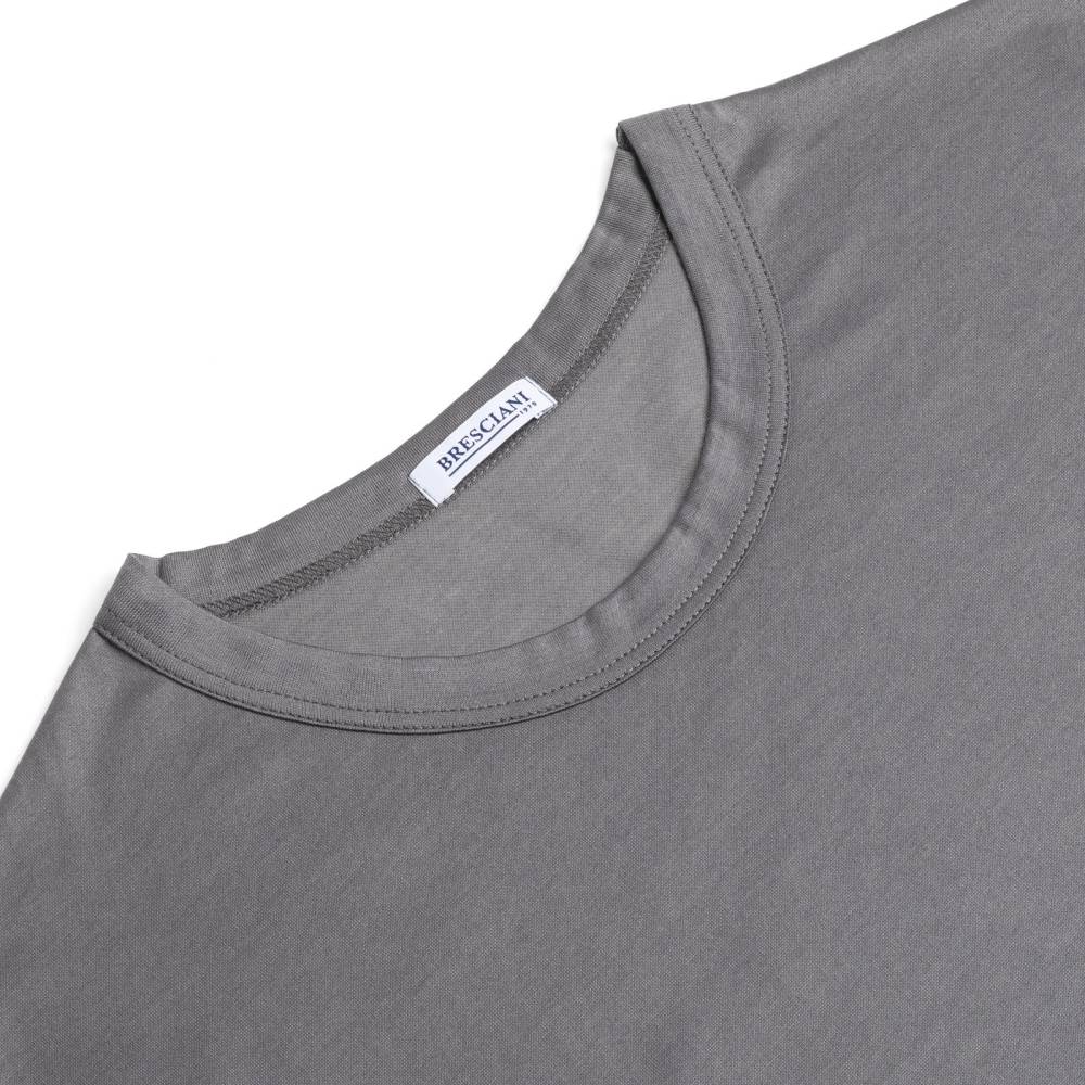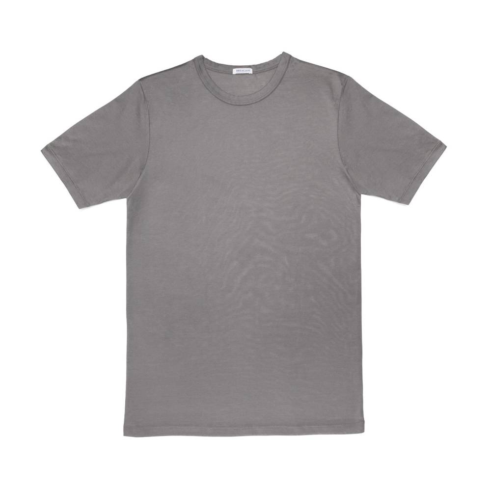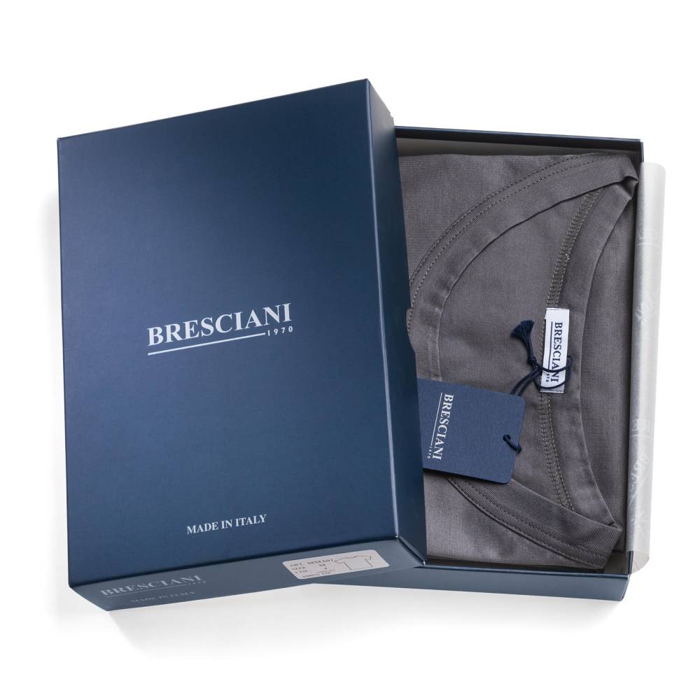 Серая футболка с круглым воротом премиум-класса итальянского бренда Bresciani подойдёт в качестве нижнего слоя или самостоятельного предмета одежды. Модель изготовлена из санфоризованного экстрадлинноволокнистого египетского хлопка (санфоризованные изделия не садятся после стирки). В процессе мерсеризации с пряжи удаляются все свободные волокна, благодаря чему она становится гладкой и блестящей и дольше сохраняет первозданный вид. Швы на модели плоские и не доставляют дискомфорта. Резинка украшена вытканным названием бренда.