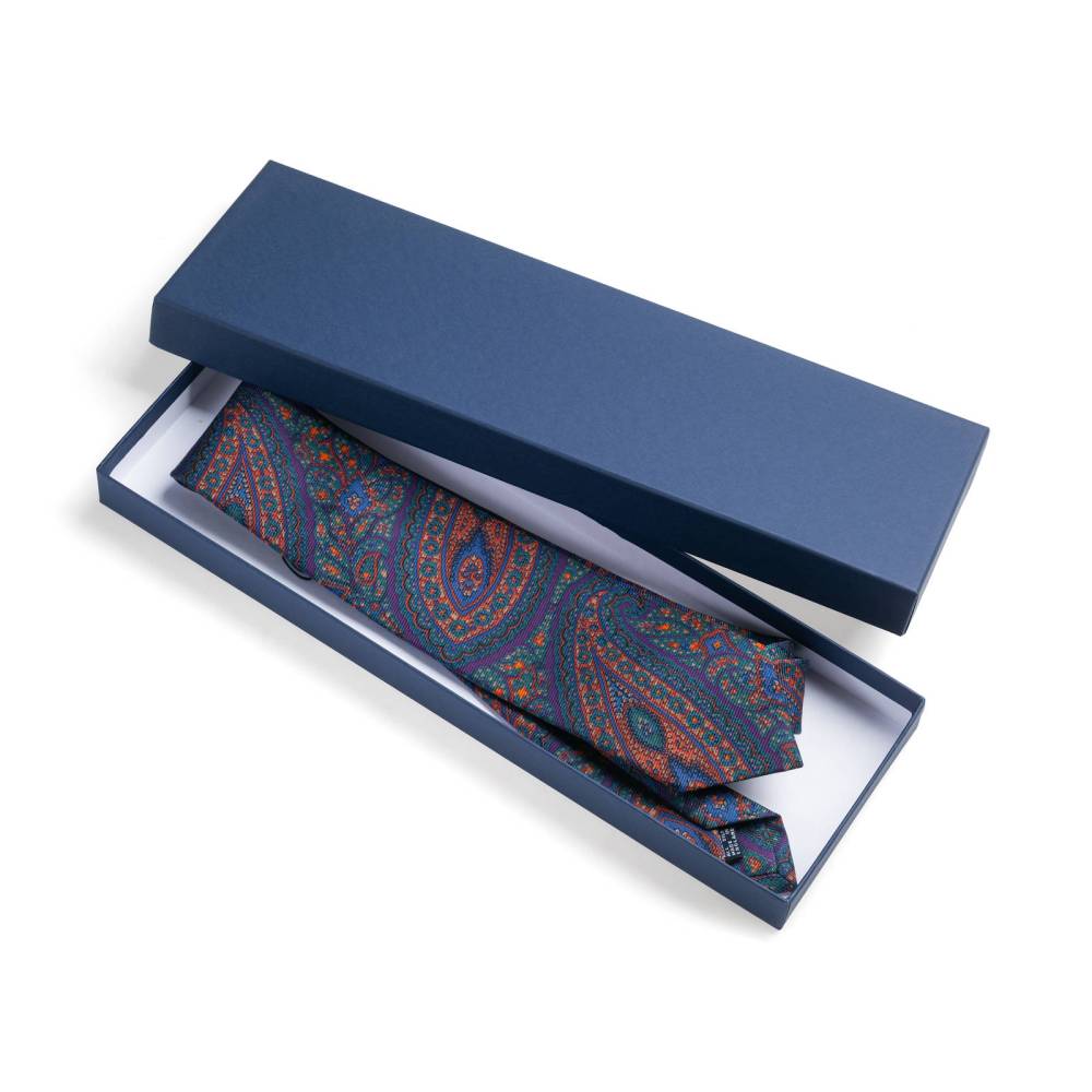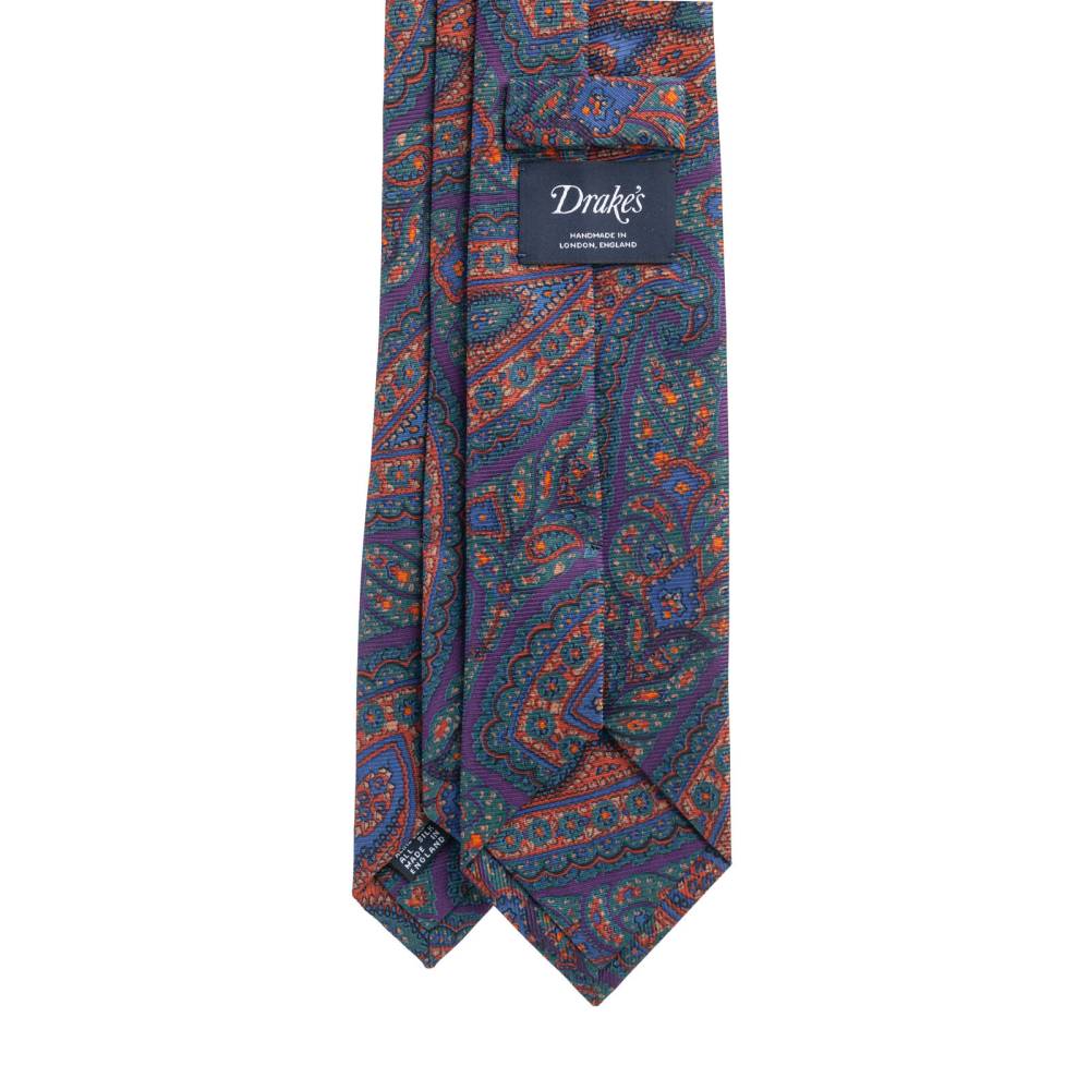 Классический галстук ручной работы известного английского бренда Drake’s. Изготовлен из плотного шёлка с крупным, но приглушённым рисунком пейсли, что отсылает к яркой и элегантной эпохе конца 1960-х годов, когда похожие галстуки носили и рок-звёзды, и члены королевских семей. Вкладка галстука (англ. interlining) выполнена из натуральной шерсти, которая добавляет узлу объём и характерную складку. По всей длине галстука проходит тонкая нить, завершающаяся петлёй в узком крае, что позволяет быстро разглаживать образовавшиеся складки на изделии. Подкладка выполнена из той же ткани, что и сам галстук (англ. self-tipped tie).