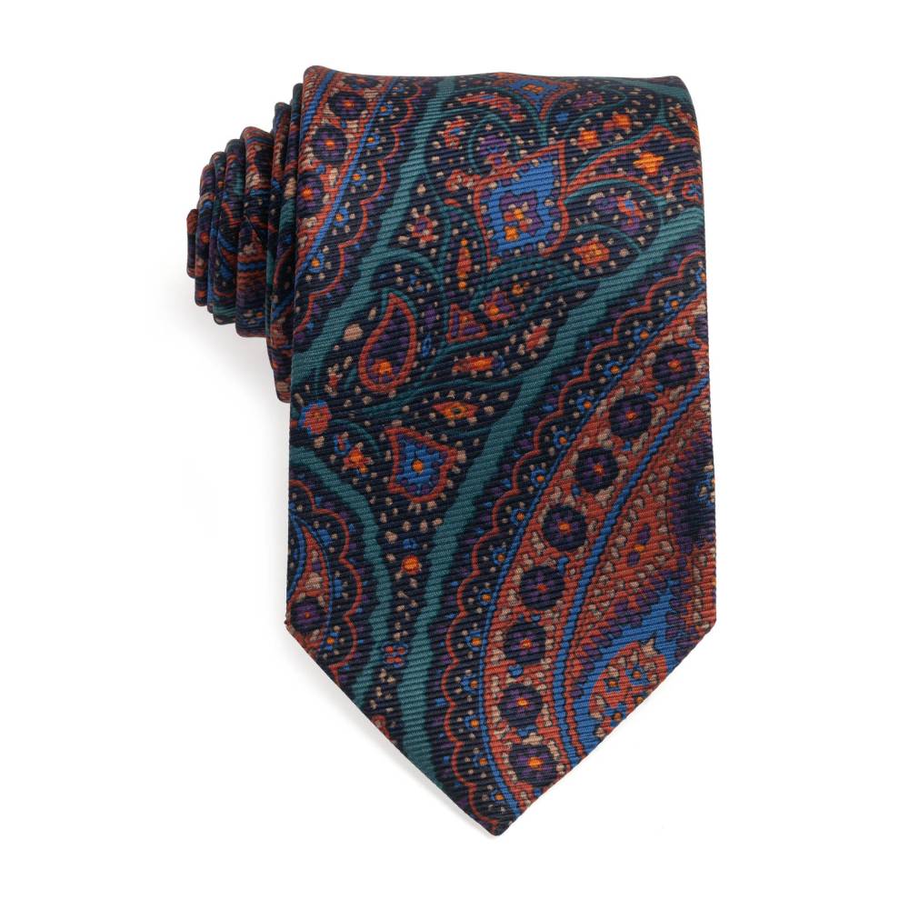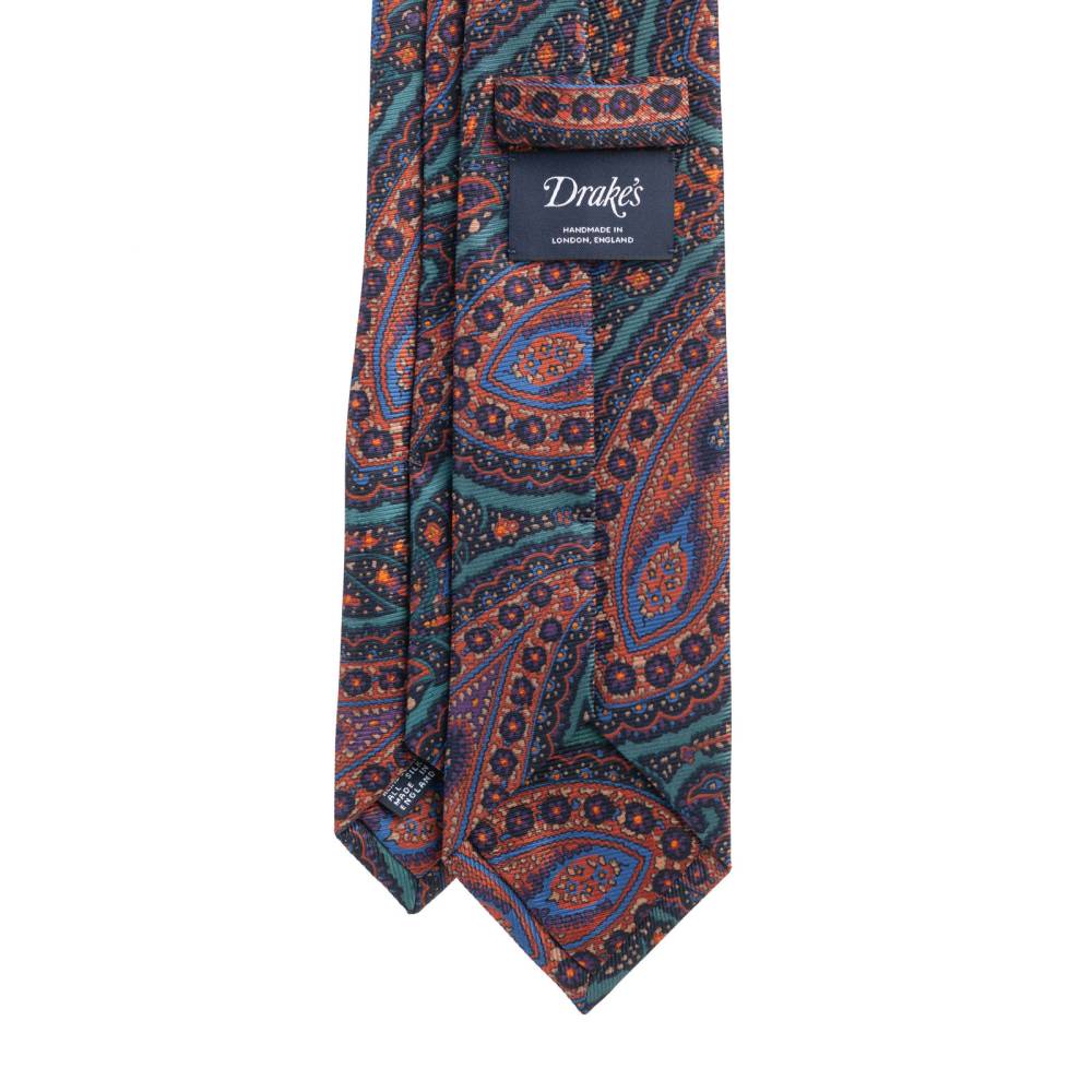 Классический галстук ручной работы известного английского бренда Drake’s. Изготовлен из плотного шёлка с крупным, но приглушённым рисунком пейсли, что отсылает к яркой и элегантной эпохе конца 1960-х годов, когда похожие галстуки носили и рок-звёзды, и члены королевских семей. Вкладка галстука (англ. interlining) выполнена из натуральной шерсти, которая добавляет узлу объём и характерную складку. По всей длине галстука проходит тонкая нить, завершающаяся петлёй в узком крае, что позволяет быстро разглаживать образовавшиеся складки на изделии. Подкладка выполнена из той же ткани, что и сам галстук (англ. self-tipped tie).