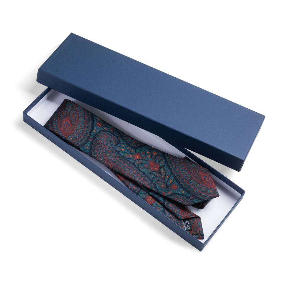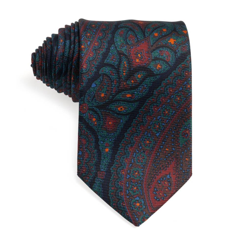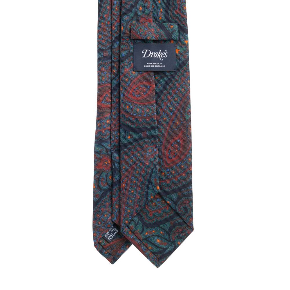 Классический галстук ручной работы известного английского бренда Drake’s. Изготовлен из плотного шёлка с крупным, но приглушённым рисунком пейсли, что отсылает к яркой и элегантной эпохе конца 1960-х годов, когда похожие галстуки носили и рок-звёзды, и члены королевских семей. Вкладка галстука (англ. interlining) выполнена из натуральной шерсти, которая добавляет узлу объём и характерную складку. По всей длине галстука проходит тонкая нить, завершающаяся петлёй в узком крае, что позволяет быстро разглаживать образовавшиеся складки на изделии. Подкладка выполнена из той же ткани, что и сам галстук (англ. self-tipped tie).