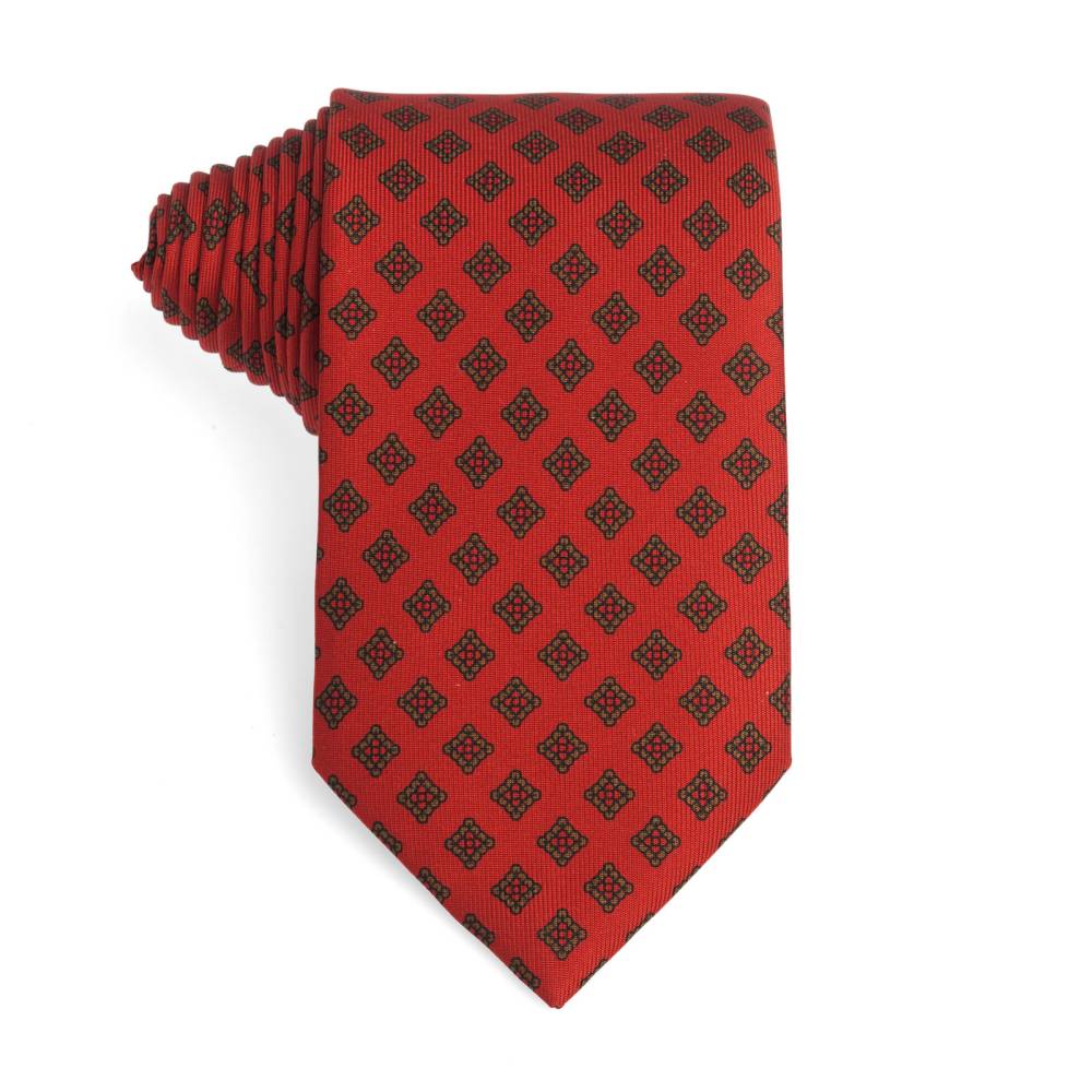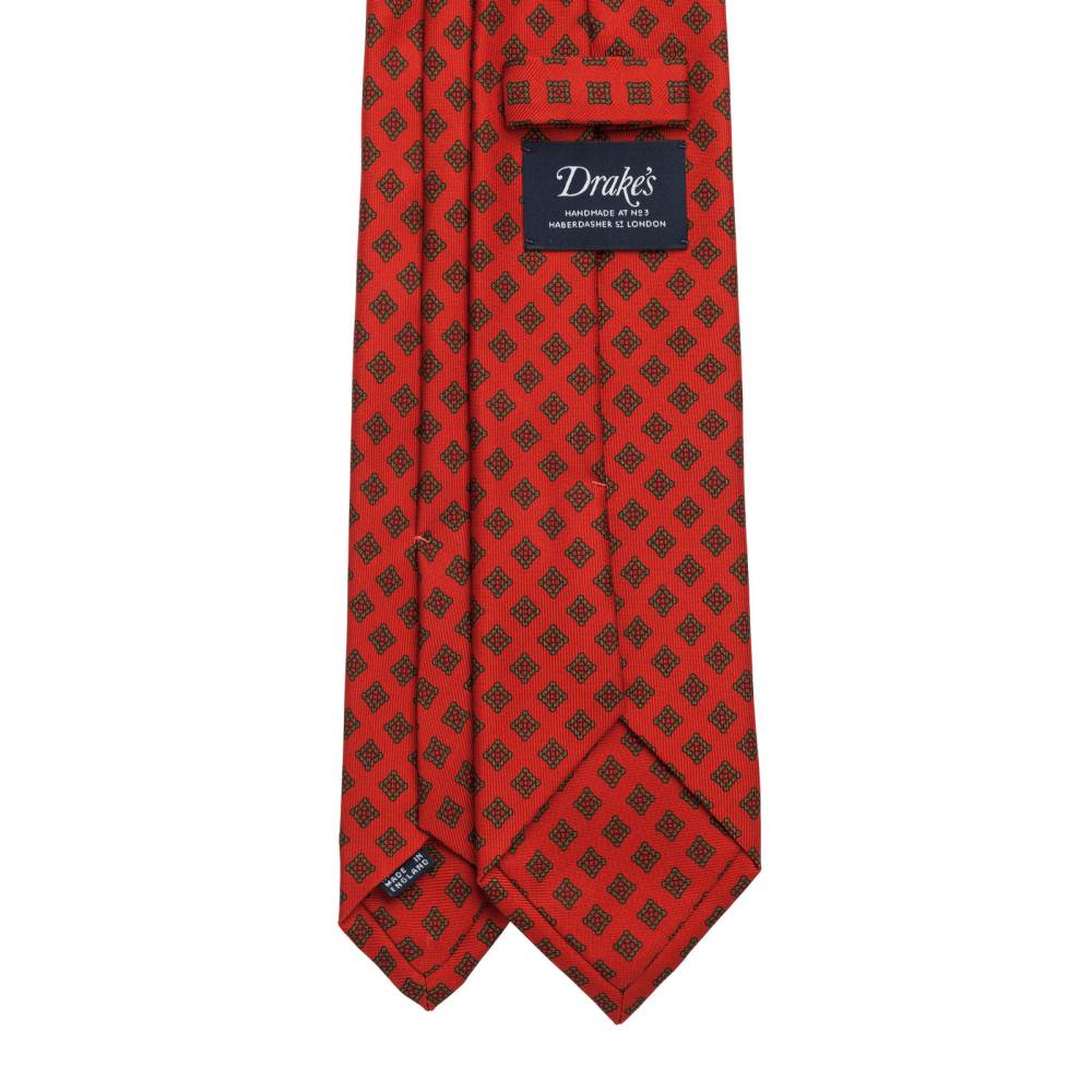 Классический галстук ручной работы от известной английской марки Drake’s. Изготовлен из плотного 100% шёлка с неброским фуляровым узором. Подкладка галстука выполнена из натуральной шерсти, которая добавляет узлу объём и характерную складку. По всей длине галстука проходит тонкая нить, завершающаяся петлёй в узком крае. Такая конструкция позволяет быстро разглаживать образовавшиеся складки на изделии. Кроме того, этот галстук подшит той же тканью, из которой изготовлена лицевая сторона (англ. self tipped). К галстуку прилагается фирменная подарочная коробка.