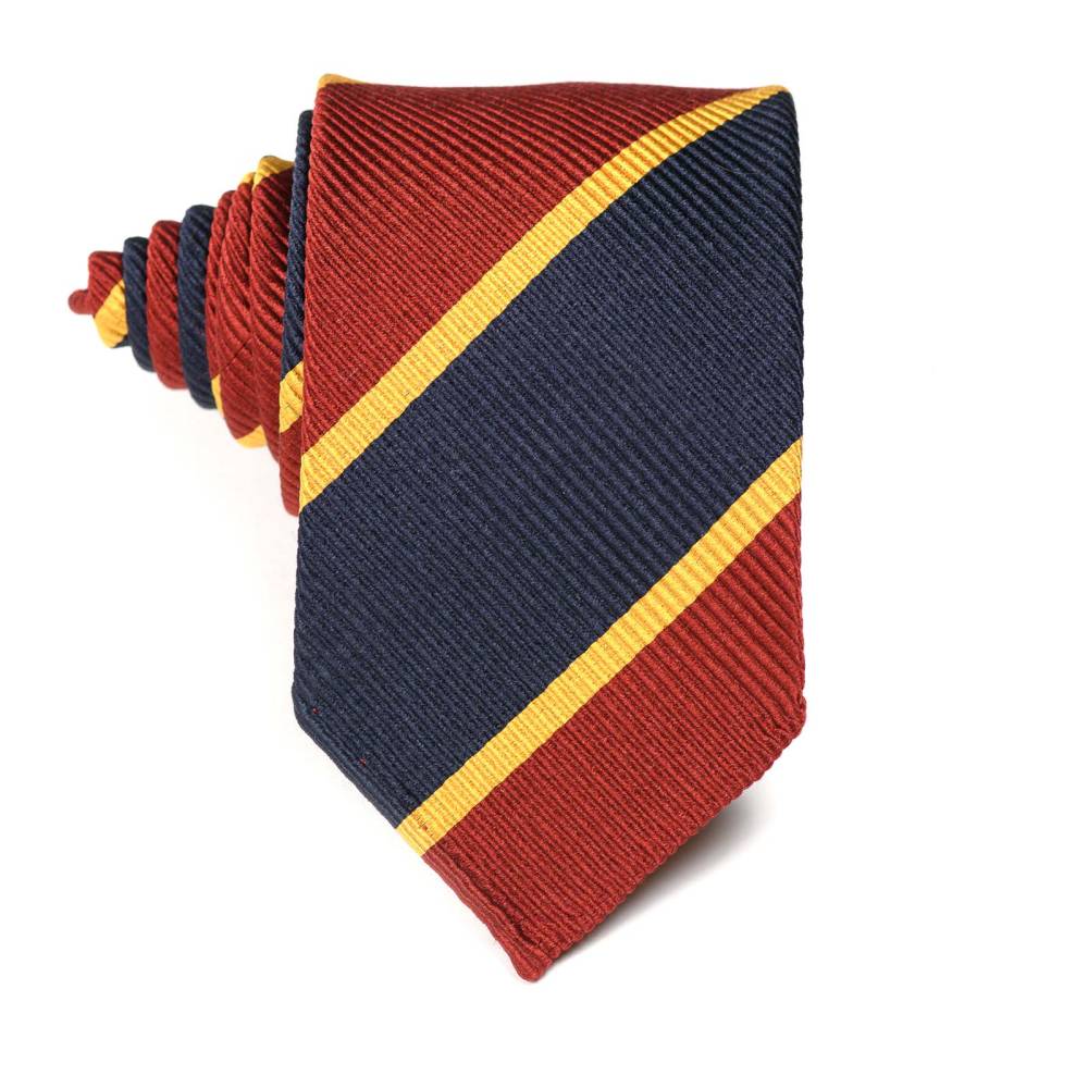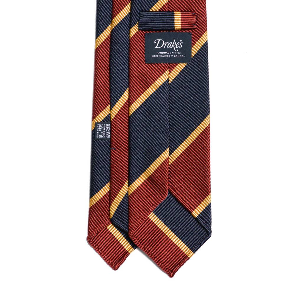 Классический галстук ручной работы известной английской марки Drake’s. Изготовлен из чистого репсового шёлка в классическую английскую «полковую» полоску и поэтому отлично подходит к умеренно строгому гардеробу. Двухслойная прокладка галстука, которая добавляет узлу объём и характерную складку, выполнена из натуральной шерсти. По всей длине галстука проходит тонкая нить, завершающаяся петлёй в узком крае, что позволяет быстро разглаживать образовавшиеся складки на изделии. Края галстука подшиты вручную (англ. hand rolled edges). К галстуку прилагается фирменный подарочный конверт.