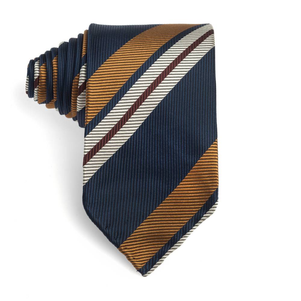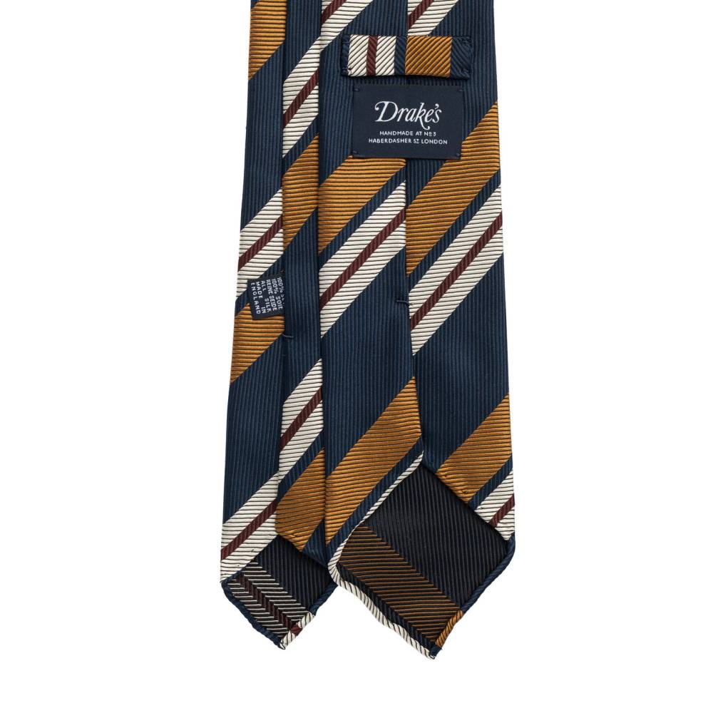 Классический галстук ручной работы от известной английской марки Drake’s. Изготовлен из чистого шёлка в фактурную (тканую) полоску. Подкладка галстука выполнена из натуральной шерсти, которая добавляет узлу объём и характерную складку. По всей длине галстука проходит тонкая нить, завершающаяся петлёй в узком крае, что позволяет быстро разглаживать образовавшиеся складки на изделии. Края галстука подшиты вручную (англ. hand rolled edges) К галстуку прилагается фирменная подарочная коробка.