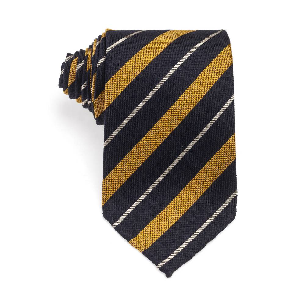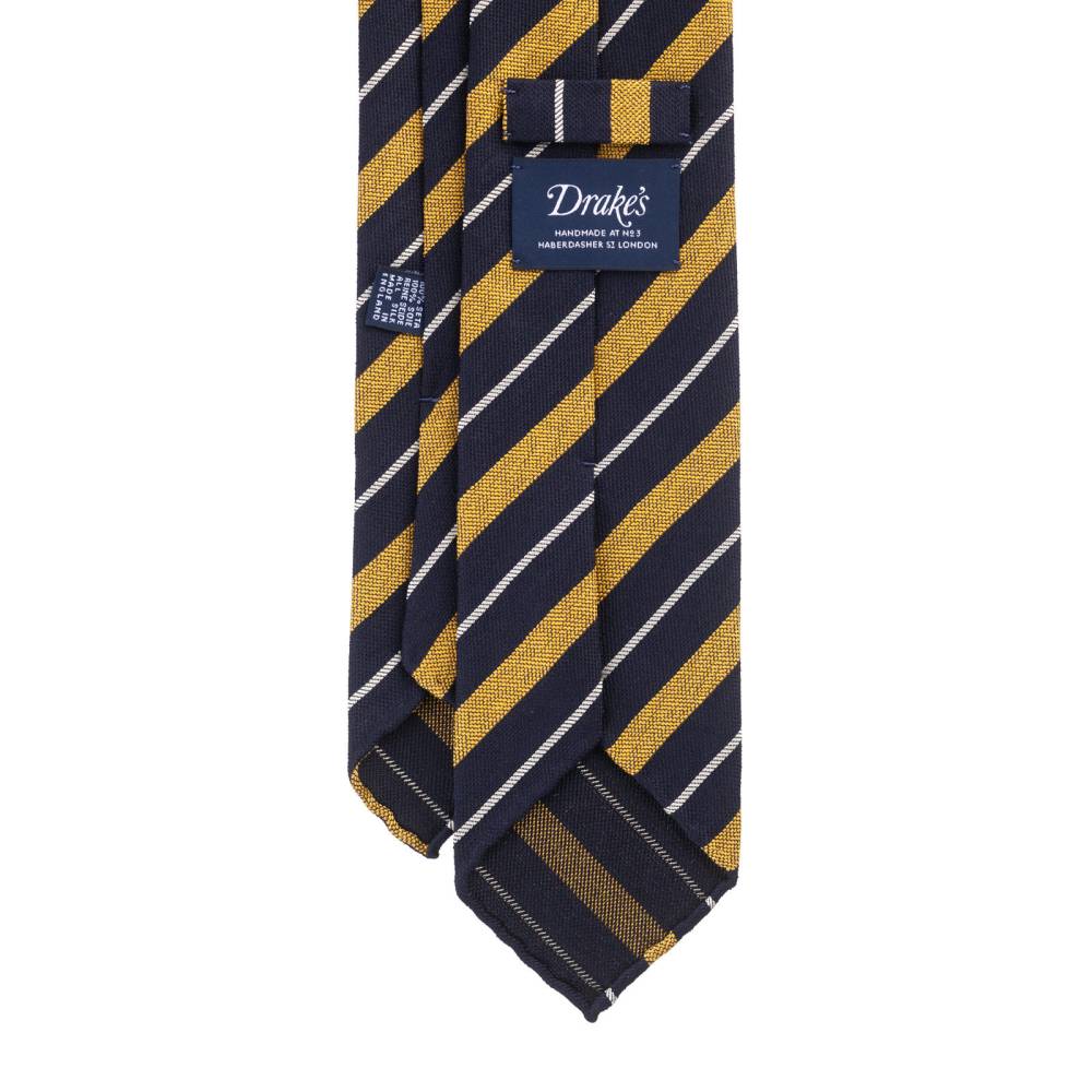 Классический галстук марки Drake`s в английскую полоску из рельефного жаккардового шёлка. Конструкция - 3-fold с шерстяной вкладкой (англ. Interlining), позволяющей завязывать объёмные красивые узлы. Сшитый вручную задний шов придаёт галстуку эластичность и предотвращает излишнюю закручиваемость. Маленькая незаметная петелька, выходящая с внутренней стороны узкого края, помогает быстро и легко разгладить складки (нужно одновременно: аккуратно потянуть петельку и плавно провести рукой по всей длине галстука). Края галстука подшиты вручную (англ. hand-rolled).