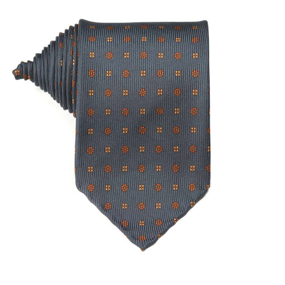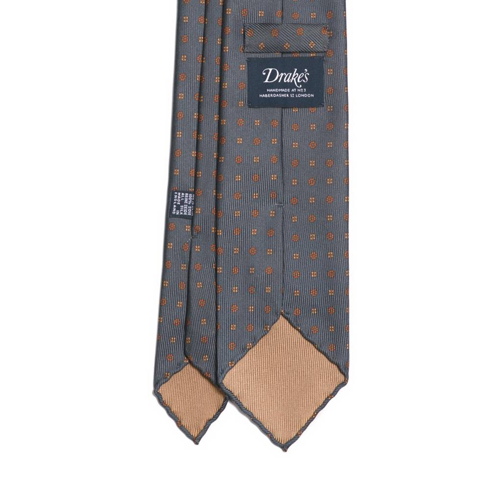 Классический галстук ручной работы известной английской марки Drake’s. Изготовлен из чистого шёлка серо-синего цвета со сдержанным фуляровым узором и поэтому отлично подходит к деловому гардеробу. Двухслойная прокладка галстука, которая добавляет узлу объём и характерную складку, выполнена из натуральной шерсти. По всей длине галстука проходит тонкая нить, завершающаяся петлёй в узком крае, что позволяет быстро разглаживать образовавшиеся складки на изделии. Края галстука подшиты вручную (англ. hand rolled edges). К галстуку прилагается фирменный подарочный конверт.