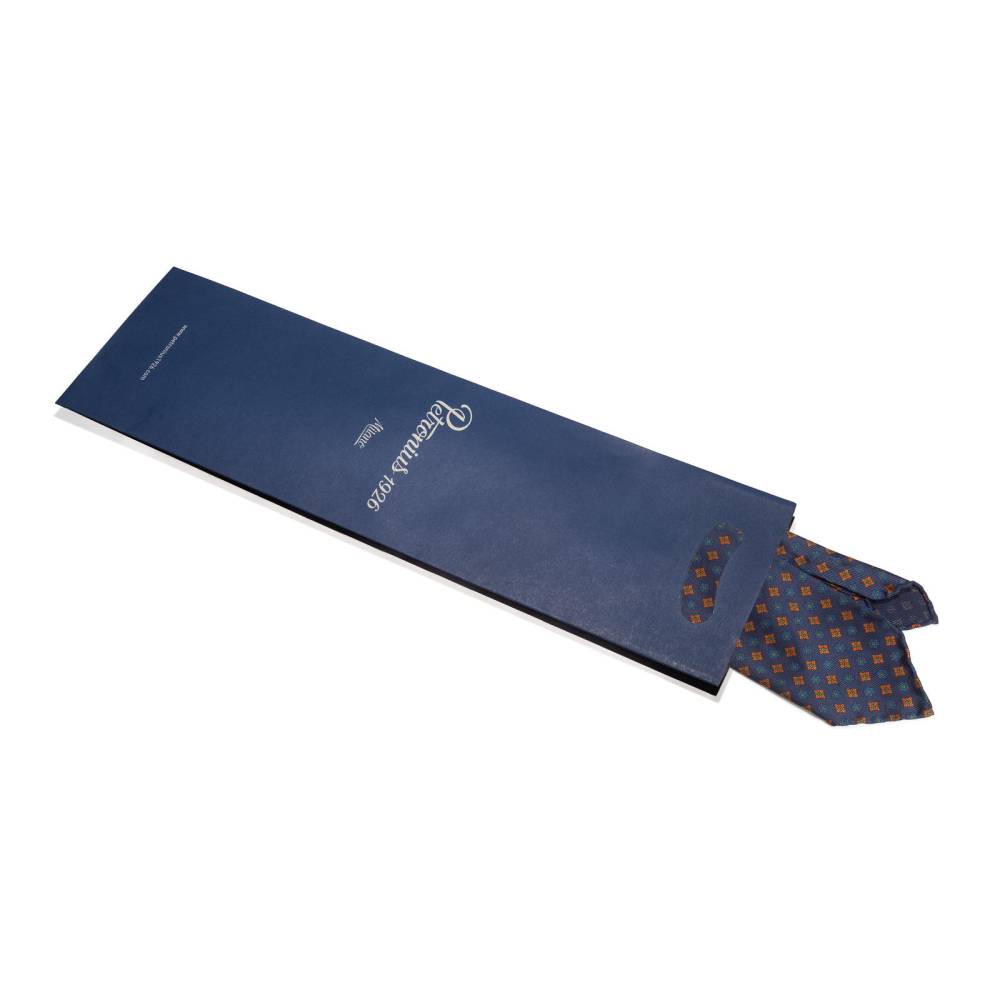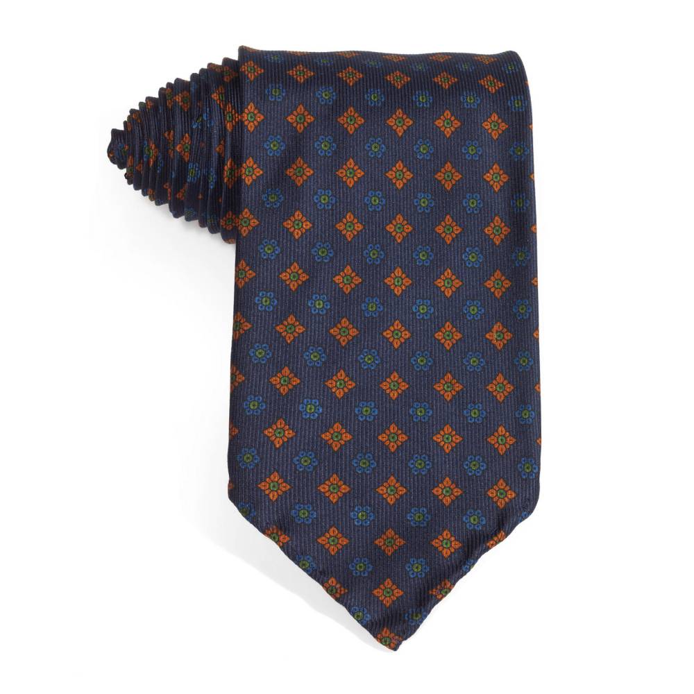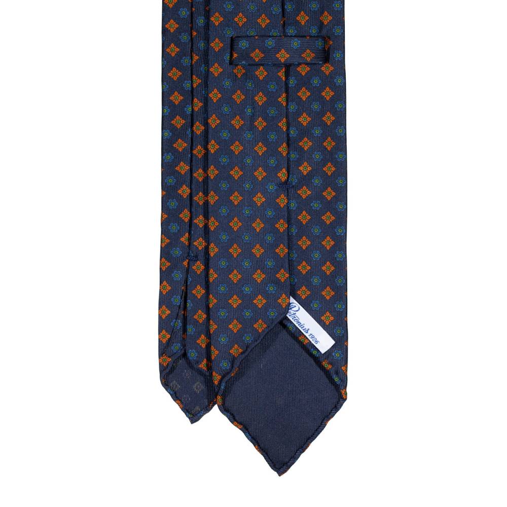Классический мужской галстук Petronius ручной работы тёмно-синего цвета с орнаментом фуляр. Выполнен в три сложения из шёлка наивысшего качества весом 50 унций (50 oz). Края скруглены и подшиты вручную (англ. hand-rolled edges). Рисунок на полотно нанесён по технологии ручной печати. Внутри бортовая ткань средней плотности. Благодаря этому галстучный узел приобретает хороший объём и характерную для качественных галстуков складку-ямочку. К галстуку прилагается фирменный подарочный конверт.