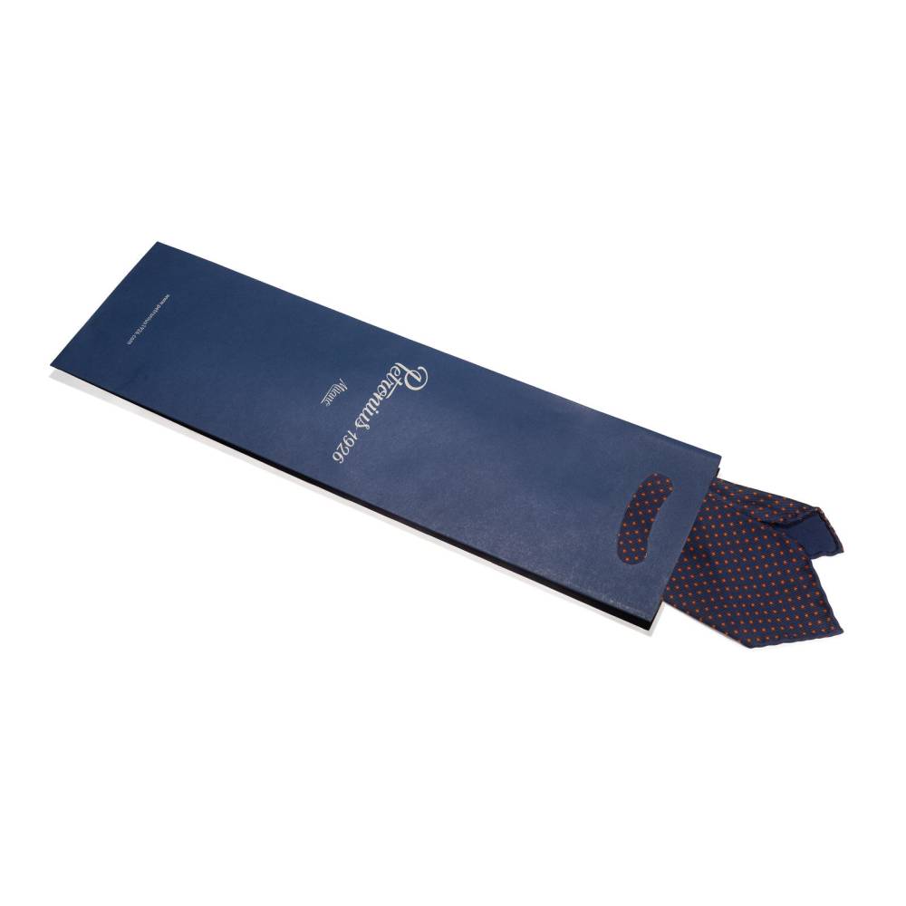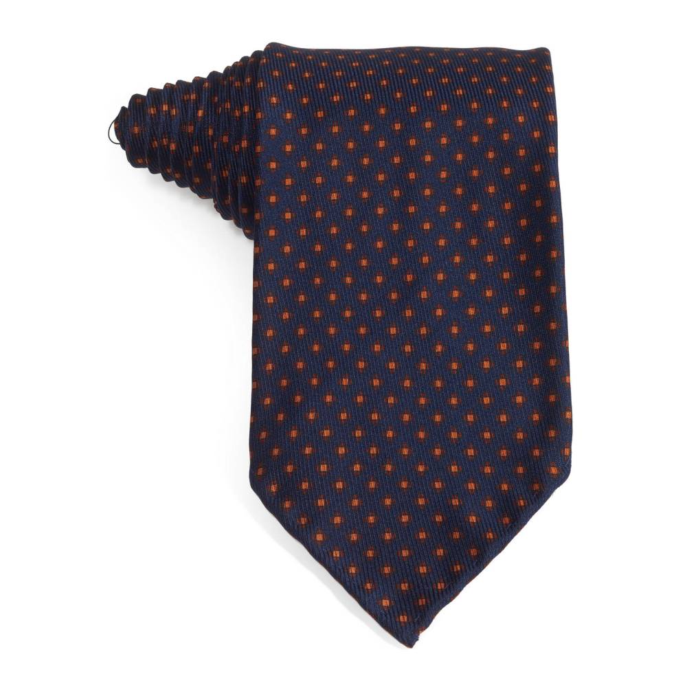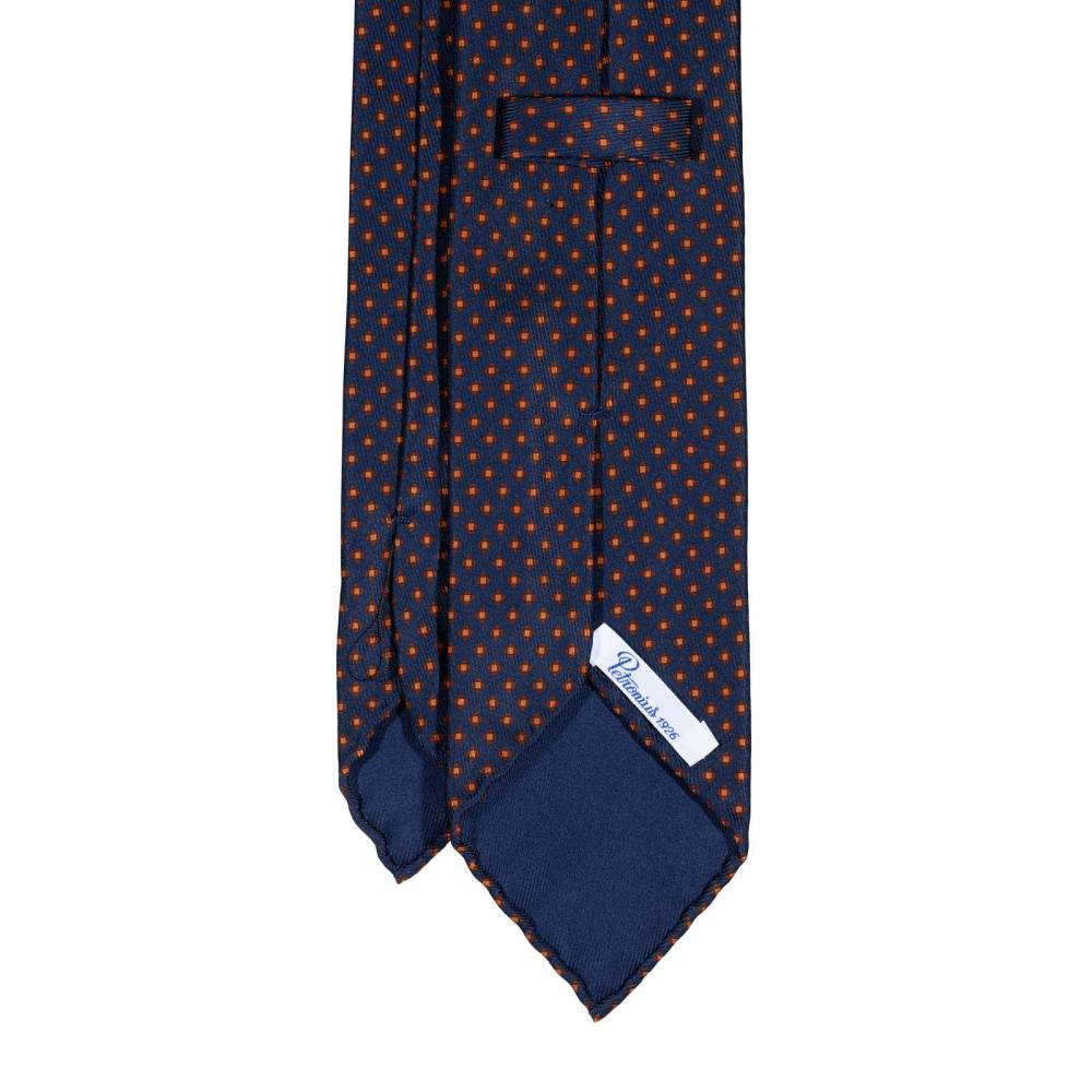 Классический мужской галстук Petronius ручной работы тёмно-синего цвета в мелкий горох. Выполнен в три сложения из шёлка наивысшего качества весом 50 унций (50 oz). Края скруглены и подшиты вручную (англ. hand-rolled edges). Рисунок на полотно нанесён по технологии ручной печати. Внутри бортовая ткань средней плотности. Благодаря этому галстучный узел приобретает хороший объём и характерную для качественных галстуков складку-ямочку. К галстуку прилагается фирменный подарочный конверт.
