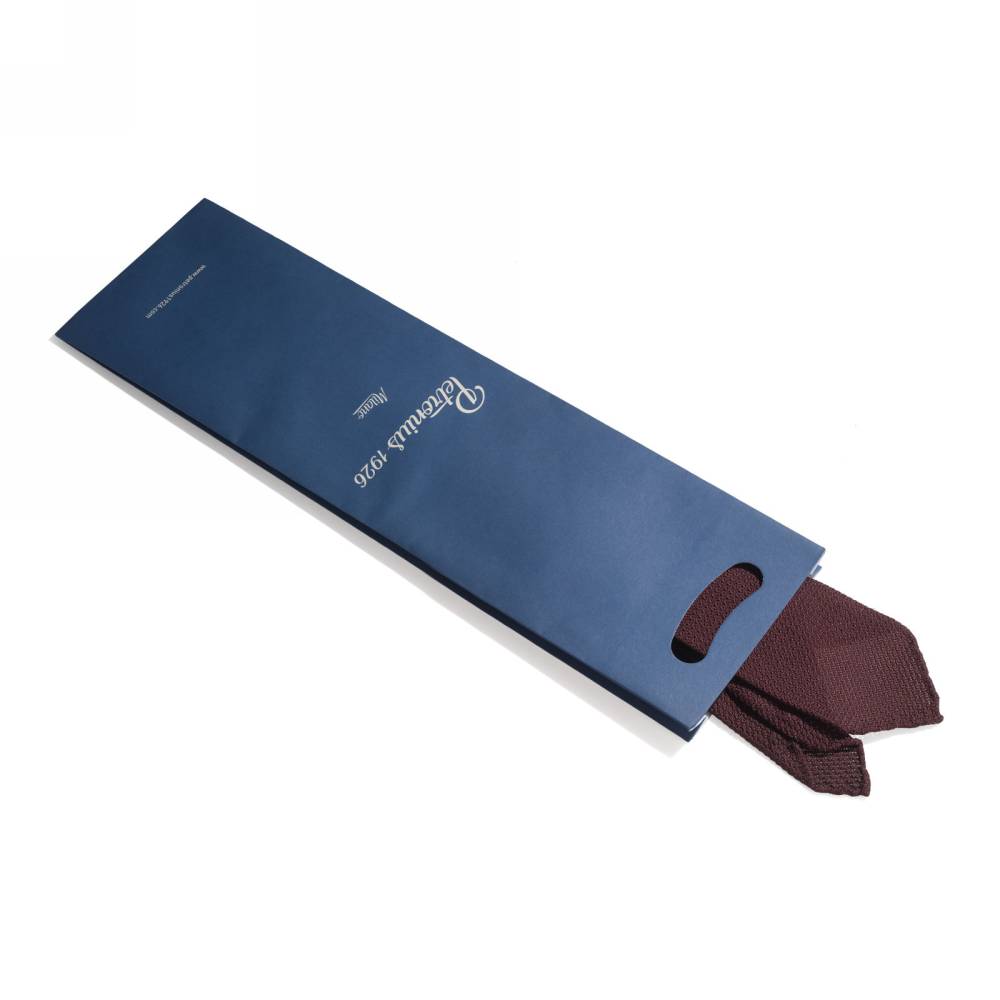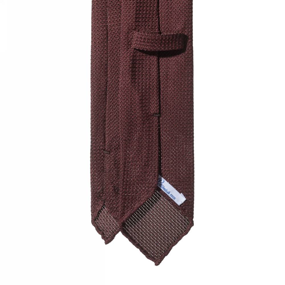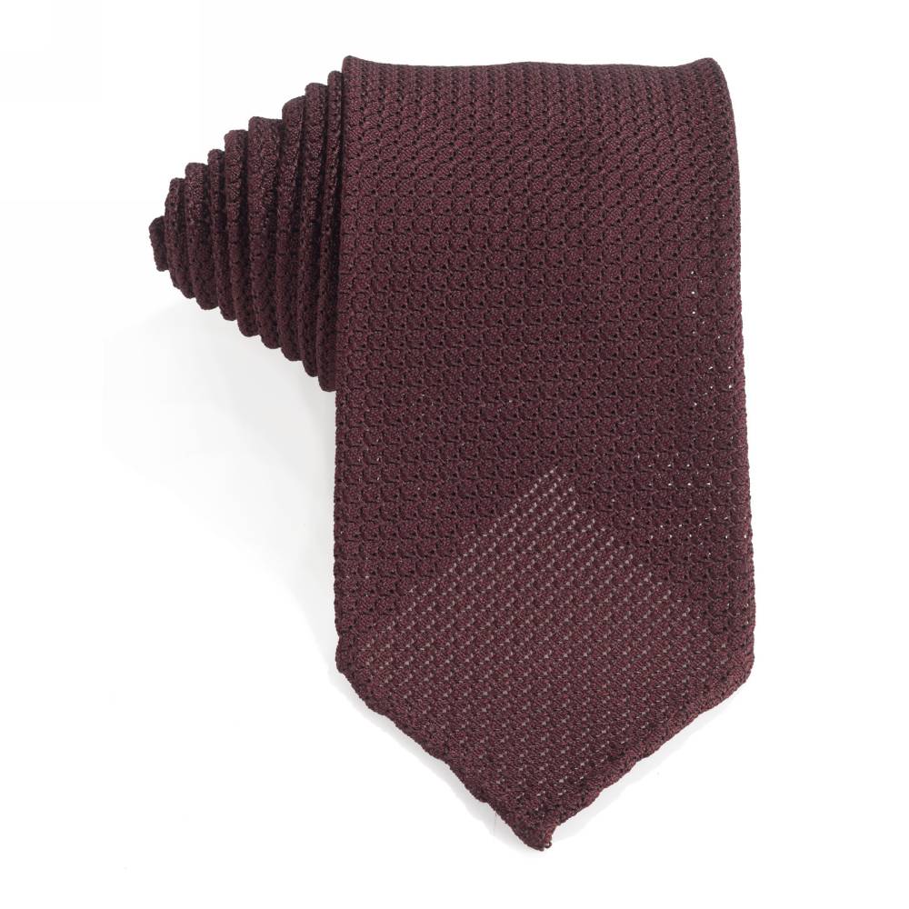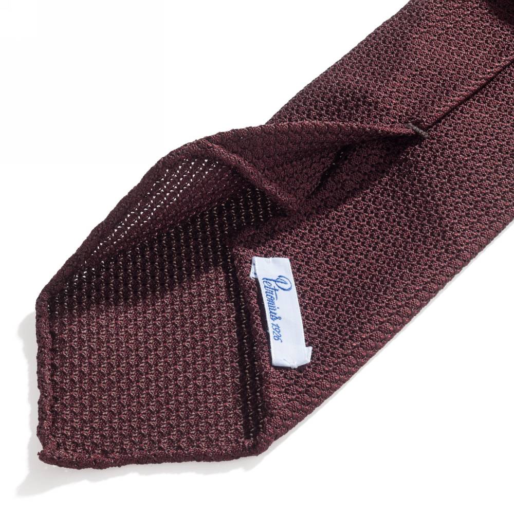 Классический однотонный мужской галстук Petronius. Выполнен в три сложения из бордового шёлка-гренадина высшего качества. Края подшиты вручную (англ. hand rolled edges). Заслуживает внимания и фактура ткани: для пошива использован гренадин крупного плетения — ит. garza grossa. Поскольку материал «увесистый», внутренняя подкладка выполнена из шерсти средней плотности. Поэтому галстучный узел приобретает хороший объём и характерную для качественных галстуков складку-ямочку. К галстуку прилагается фирменный подарочный конверт.