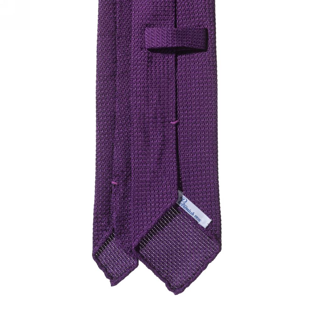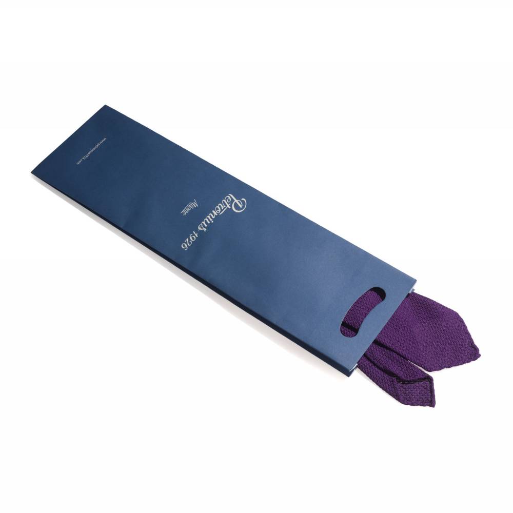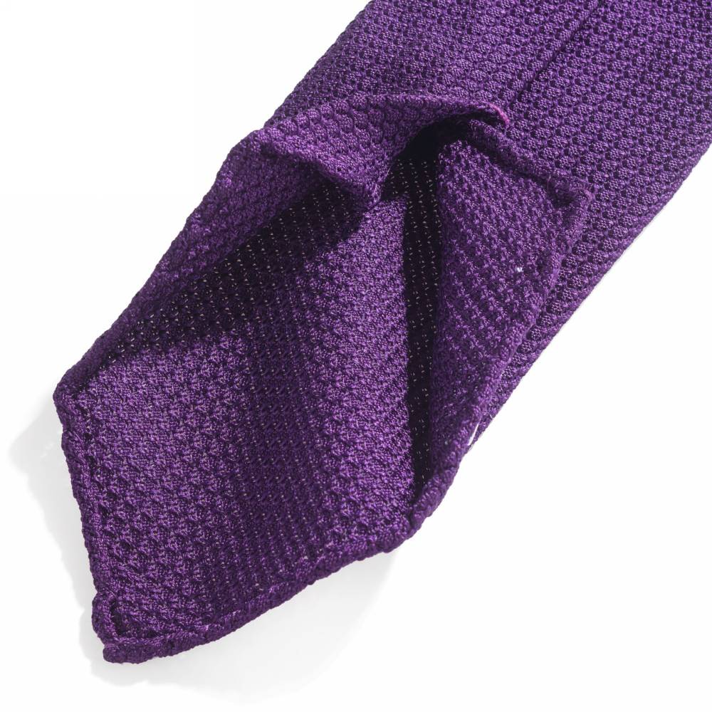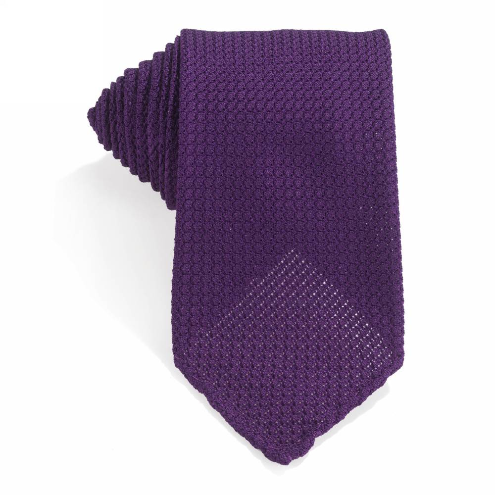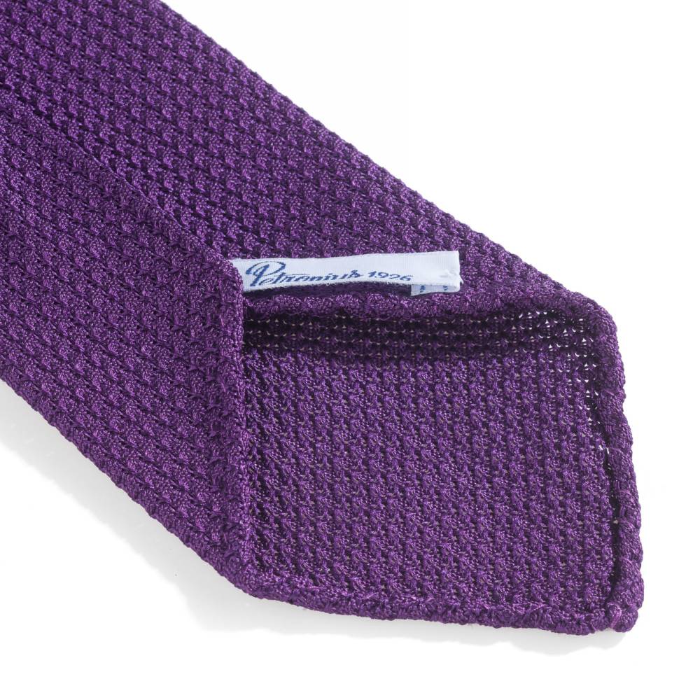 Классический однотонный мужской галстук Petronius. Выполнен в три сложения из фиолетового шёлка-гренадина высшего качества. Края подшиты вручную (англ. hand rolled edges). Заслуживает внимания и фактура ткани: для пошива использован гренадин крупного плетения — ит. garza grossa. Поскольку материал «увесистый», внутренняя подкладка выполнена из шерсти средней плотности. Поэтому галстучный узел приобретает хороший объём и характерную для качественных галстуков складку-ямочку. К галстуку прилагается фирменный подарочный конверт.