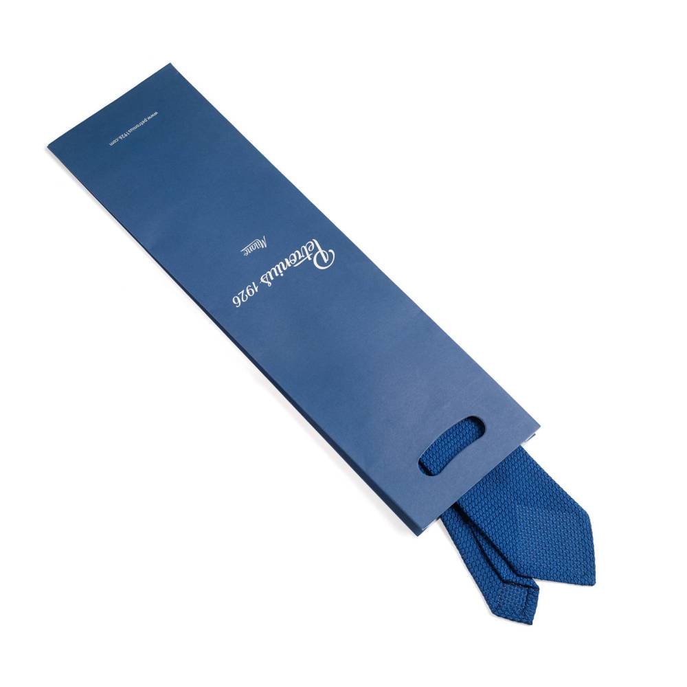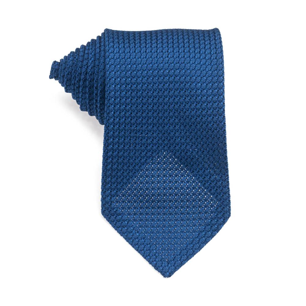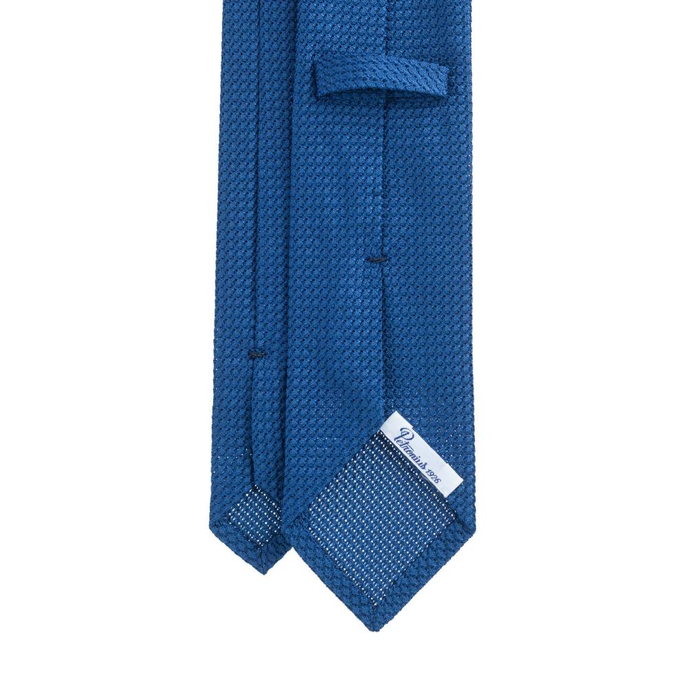 Классический однотонный мужской галстук Petronius из синего шёлка-гренадина высшего качества. Заслуживает внимания фактура ткани: для пошива этого галстука использован гренадин крупного плетения — ит. garza grossa. Поскольку материал «увесистый», подкладки у галстука нет, а его края аккуратно подшиты вручную. Такой галстук хорошо сочетается как со строгим тёмно-серым или тёмно-синим костюмом, так и с фактурным непарным пиджаком или даже курткой.