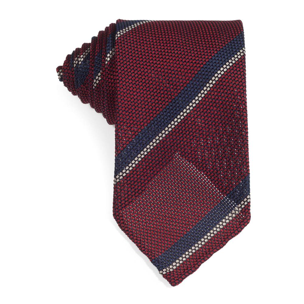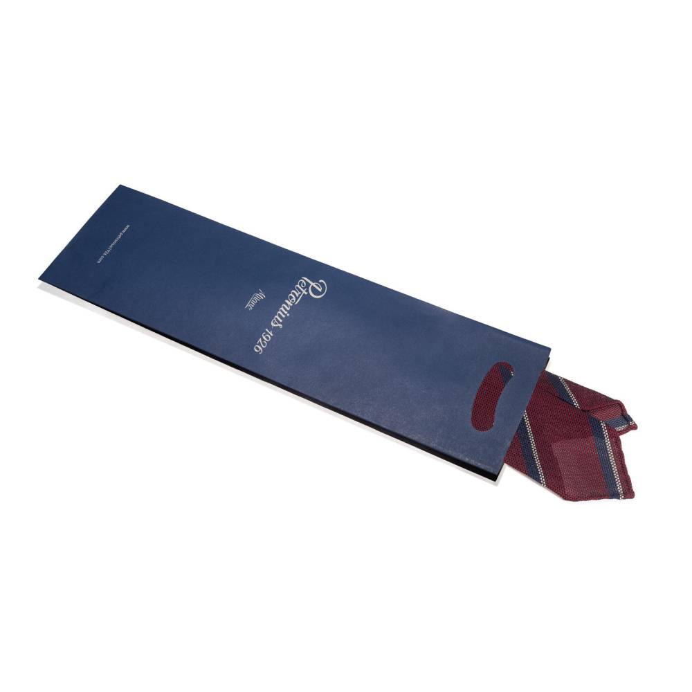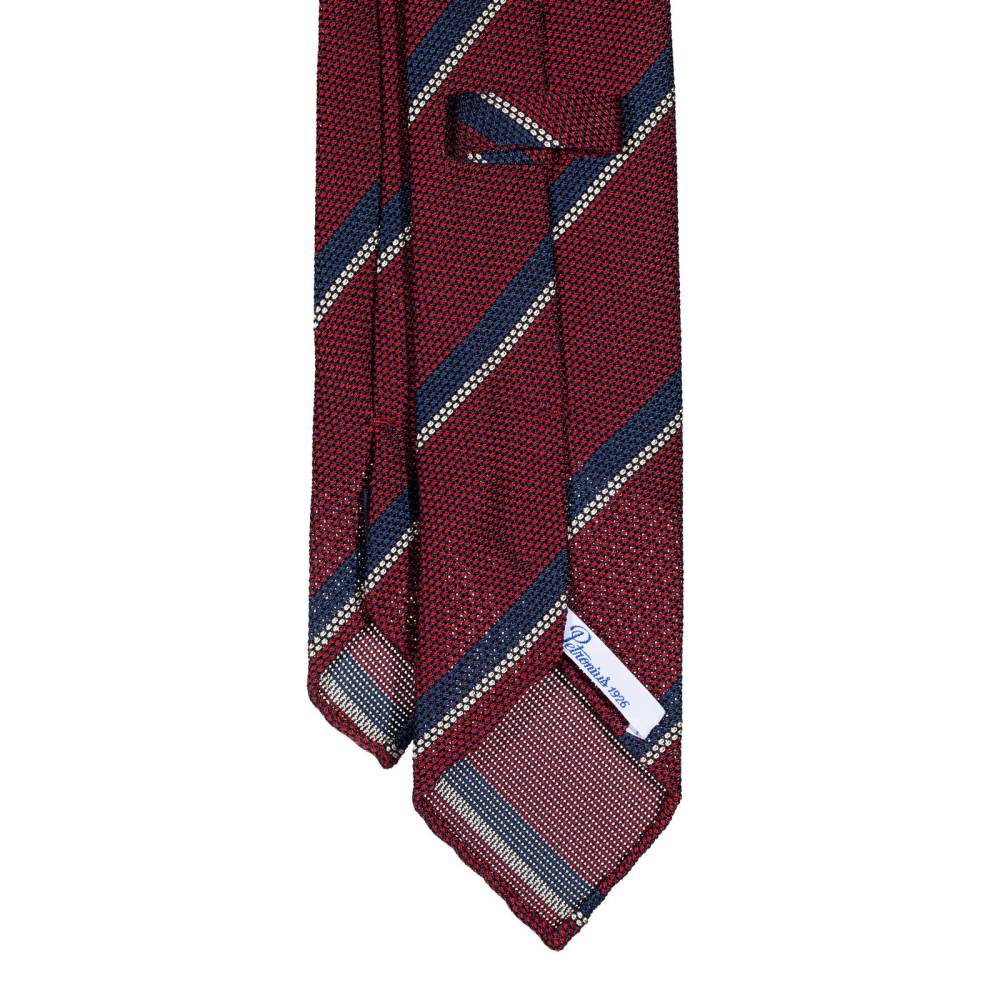 Классический мужской галстук Petronius в полковую полоску. Выполнен в три сложения из бордового шёлка-гренадина высшего качества. Края скруглены и подшиты вручную (англ. hand rolled edges). Заслуживает внимания и фактура ткани: для пошива использован гренадин мелкого плетения. Внутренняя подкладка выполнена из шерсти средней плотности. Поэтому галстучный узел приобретает хороший объём и характерную для качественных галстуков складку-ямочку. К галстуку прилагается фирменный подарочный конверт.