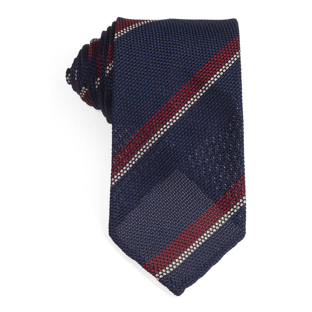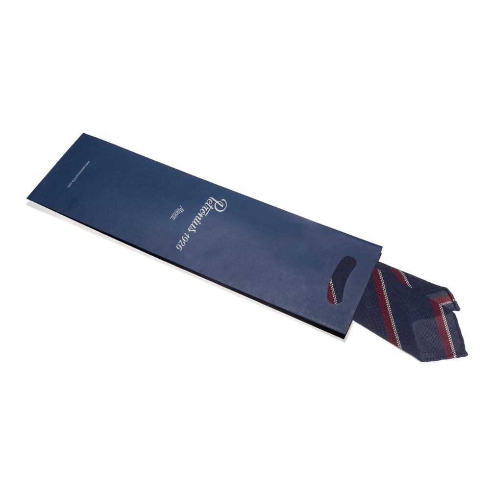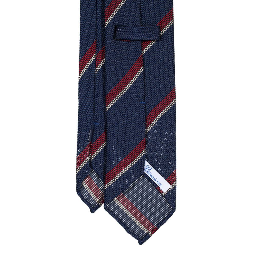 Классический мужской галстук Petronius в полковую полоску. Выполнен в три сложения из синего шёлка-гренадина высшего качества. Края скруглены и подшиты вручную (англ. hand rolled edges). Заслуживает внимания и фактура ткани: для пошива использован гренадин мелкого плетения. Внутренняя подкладка выполнена из шерсти средней плотности. Поэтому галстучный узел приобретает хороший объём и характерную для качественных галстуков складку-ямочку. К галстуку прилагается фирменный подарочный конверт.