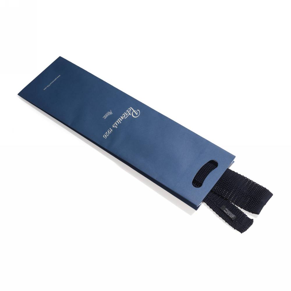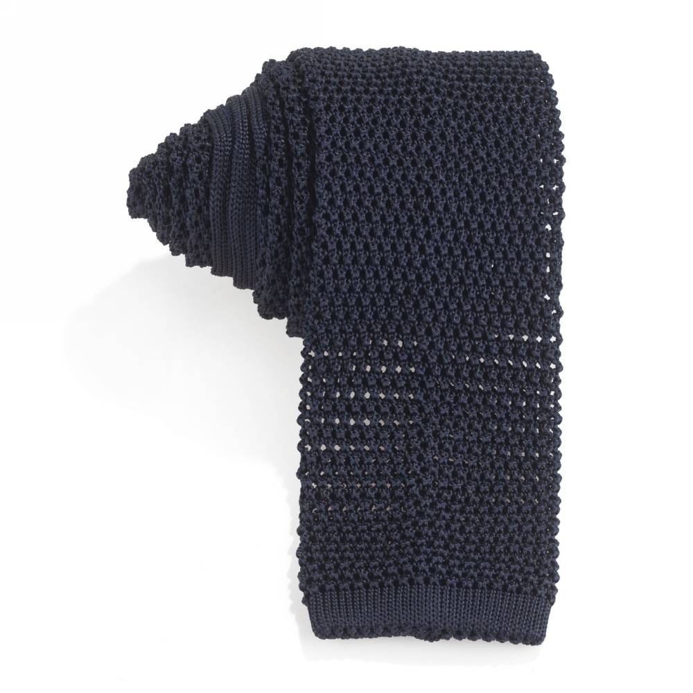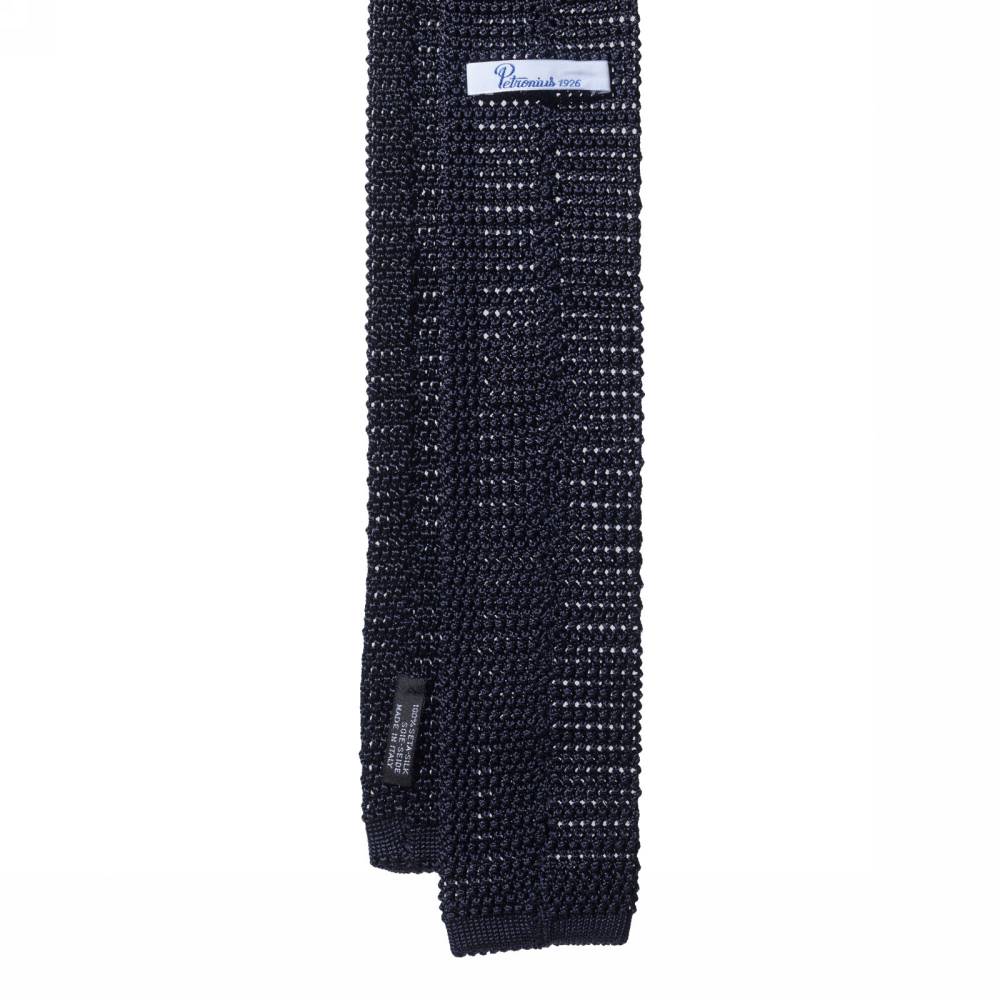 Полностью вязаный неформальный галстук ручной работы миланского ателье Petronius. Выполнен из фактурного шёлка, известного среди ценителей как «хрустящий» или под французским названием «cri de la soie» (пер. с фр. яз. «крик шёлка») из-за сухости материала. Эта уникальная черта, а также квадратный край выгодно выделают подобные галстуки среди привычных моделей. Особенно если хочется носить галстук чаще и снизить градус формальности образа в целом. Полотно тёмно-синего цвета.