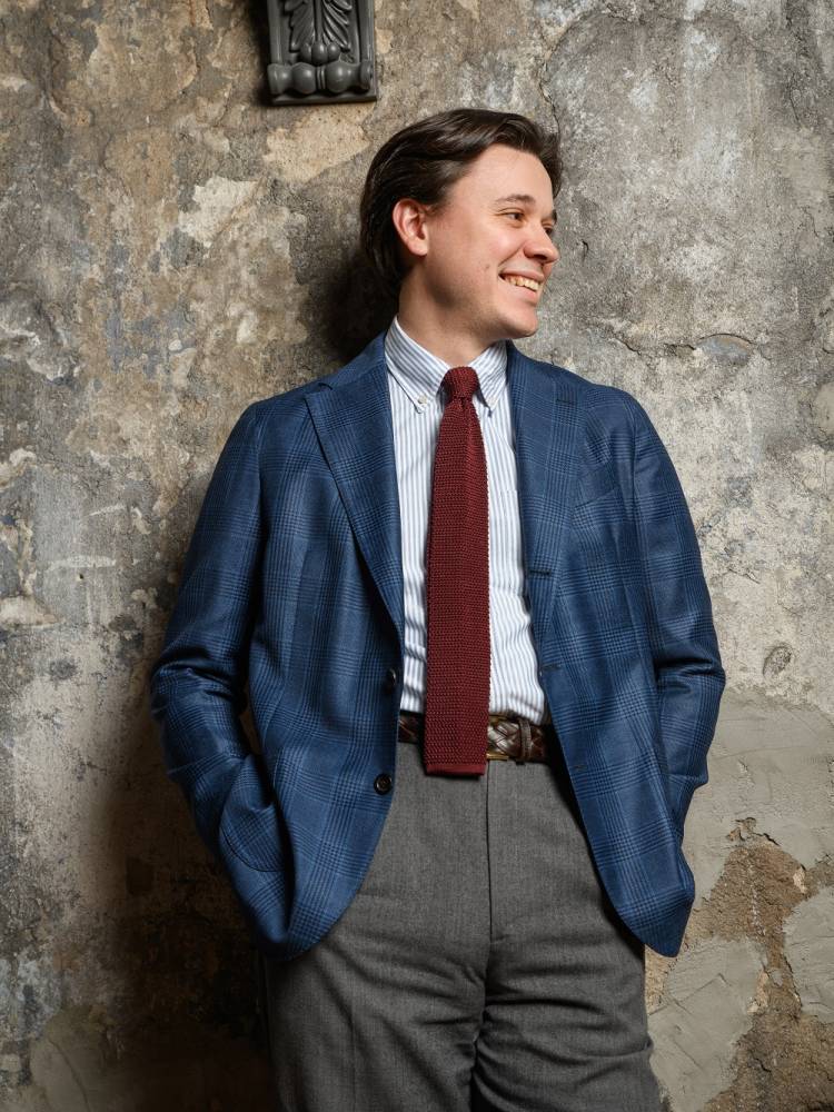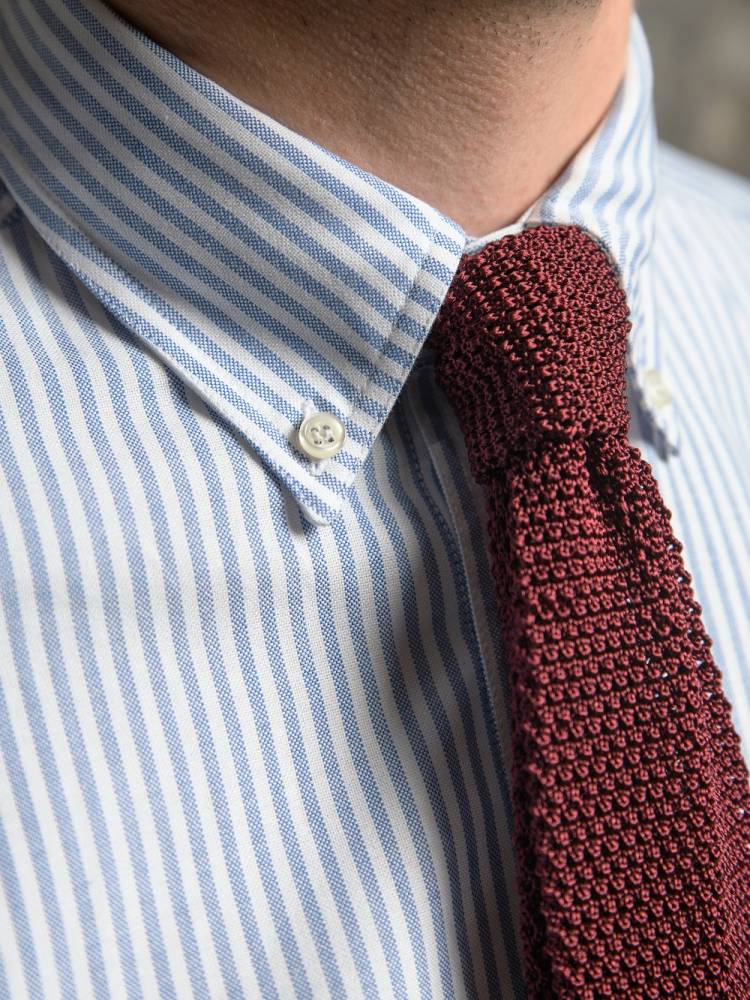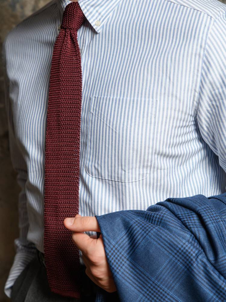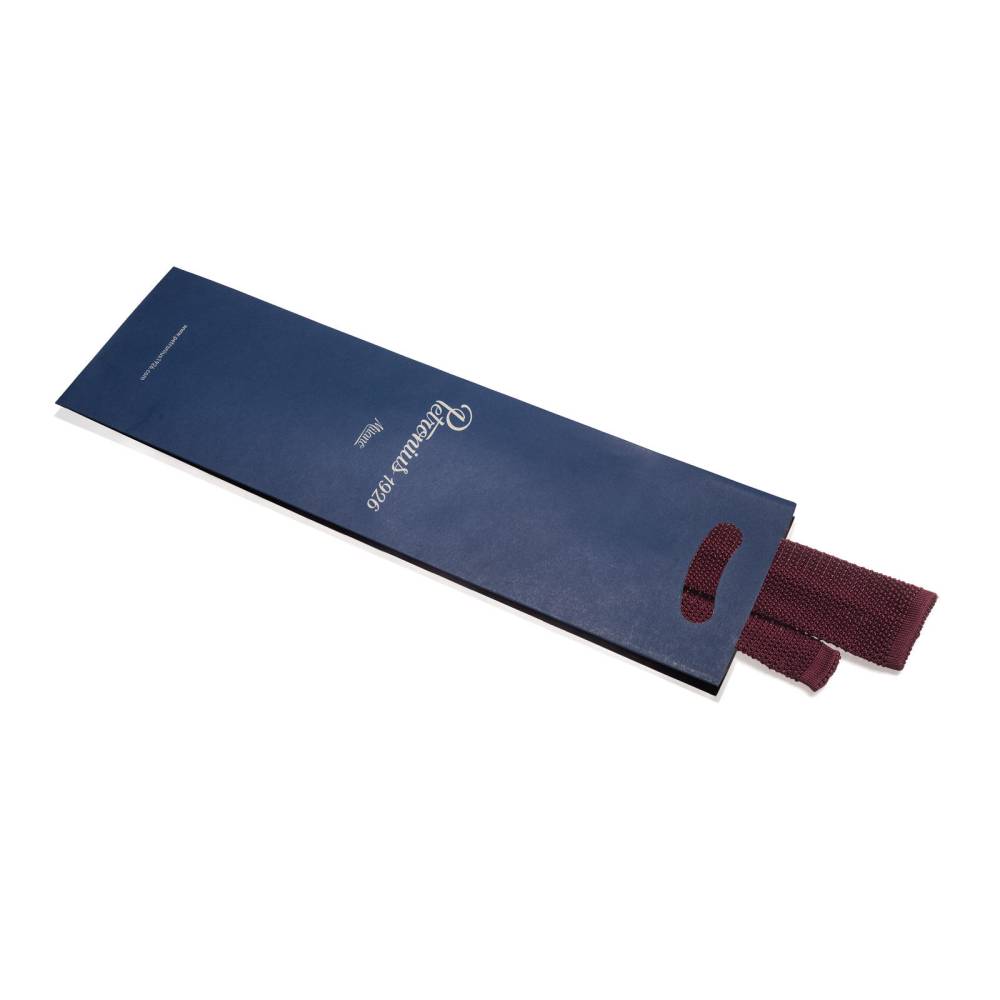 Полностью вязаный неформальный галстук ручной работы миланского ателье Petronius. Выполнен из фактурного шёлка, известного среди ценителей как «хрустящий» или под французским названием «cri de la soie» (пер. с фр. яз. «крик шёлка») из-за сухости материала. Эта уникальная черта, а также квадратный край выгодно выделают подобные галстуки среди привычных моделей. Особенно если хочется носить галстук чаще и снизить градус формальности образа в целом. Полотно бордового цвета.