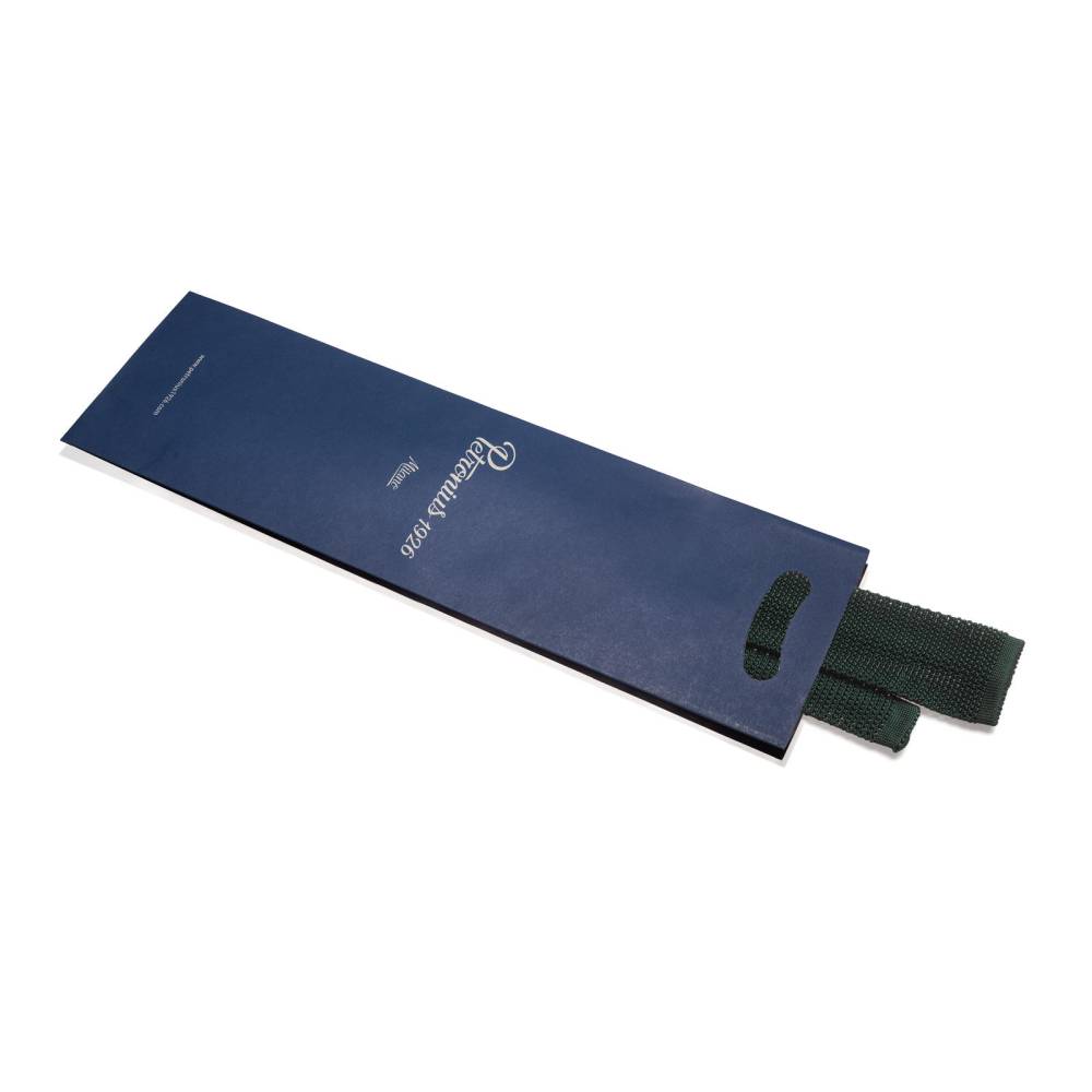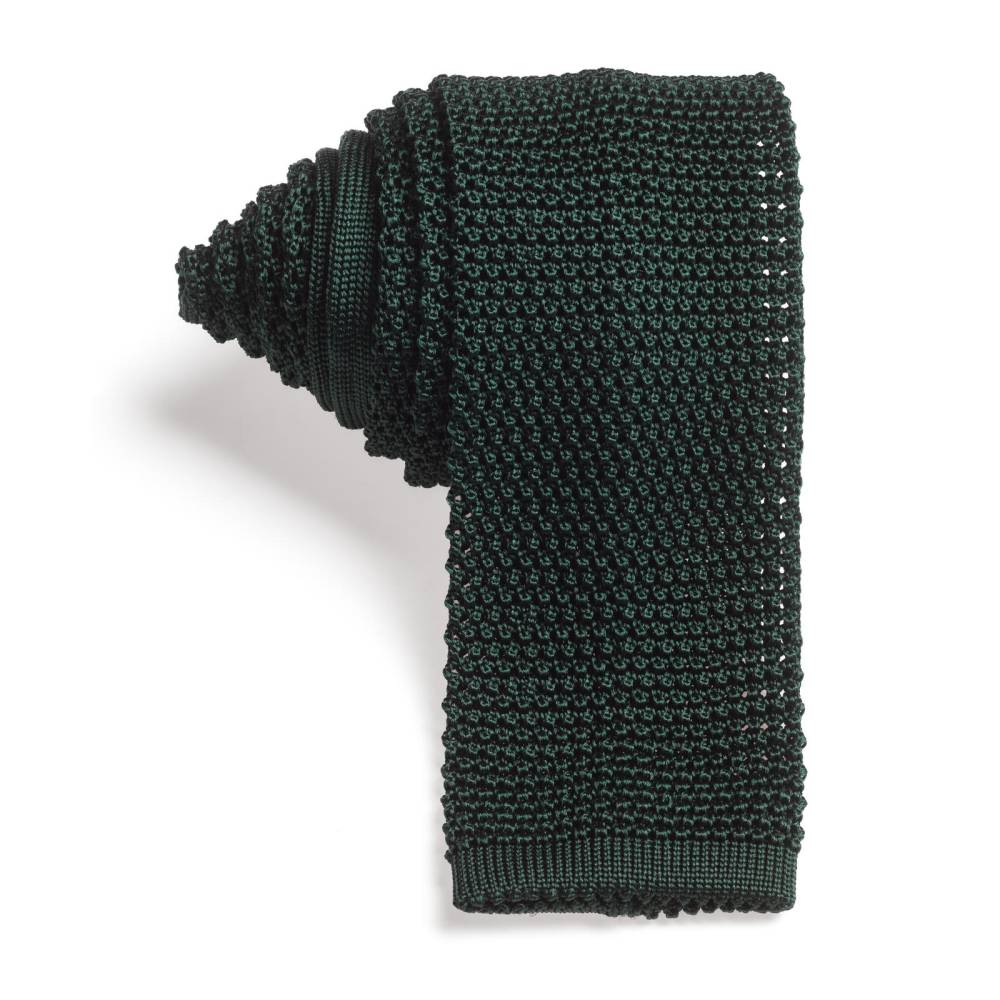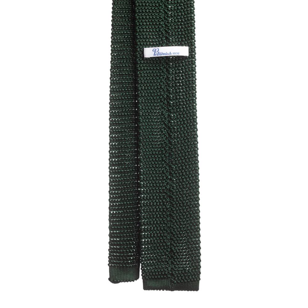 Полностью вязаный неформальный галстук ручной работы миланского ателье Petronius. Выполнен из фактурного шёлка, известного среди ценителей как «хрустящий» или под французским названием «cri de la soie» (пер. с фр. яз. «крик шёлка») из-за сухости материала. Эта уникальная черта, а также квадратный край выгодно выделают подобные галстуки среди привычных моделей. Особенно если хочется носить галстук чаще и снизить градус формальности образа в целом. Полотно тёмно-зелёного цвета.