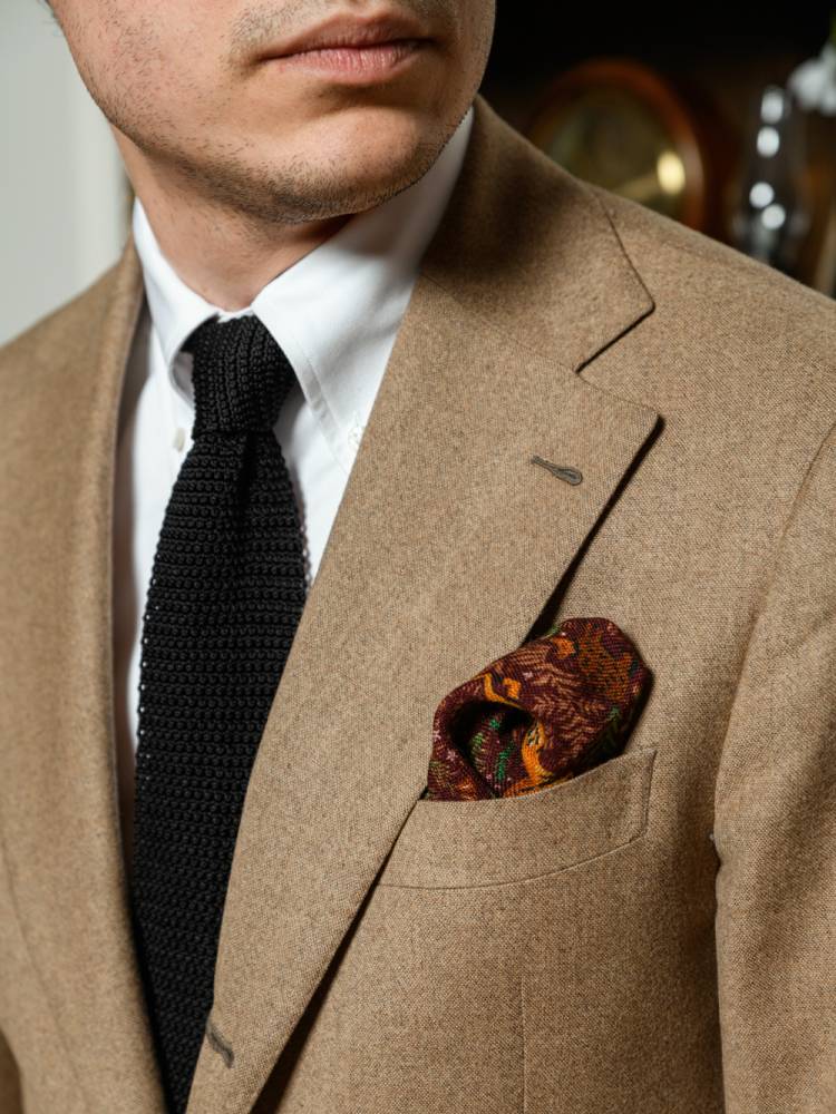 Такой галстук хорошо сочетается с лёгкими летними костюмами и пиджаками приглушённых оттенков, а также неформальными демисезонными классическими костюмами из фактурных тканей: твида, вельвета или фланели.