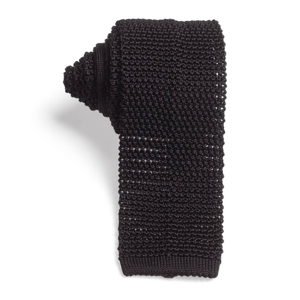 Полностью вязаный неформальный галстук ручной работы миланского ателье Petronius. Выполнен из фактурного шёлка, известного среди ценителей как «хрустящий» или под французским названием «cri de la soie» (пер. с фр. яз. «крик шёлка») из-за сухости материала. Эта уникальная черта, а также квадратный край выгодно выделают подобные галстуки среди привычных моделей. Особенно если хочется носить галстук чаще и снизить градус формальности образа в целом. Полотно чёрного цвета.