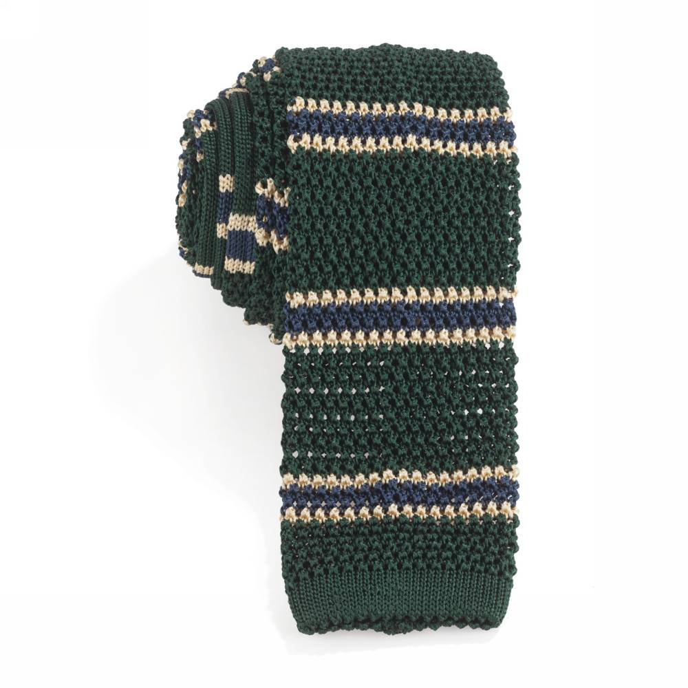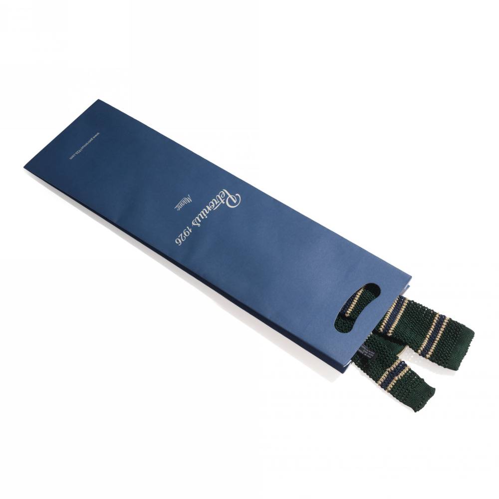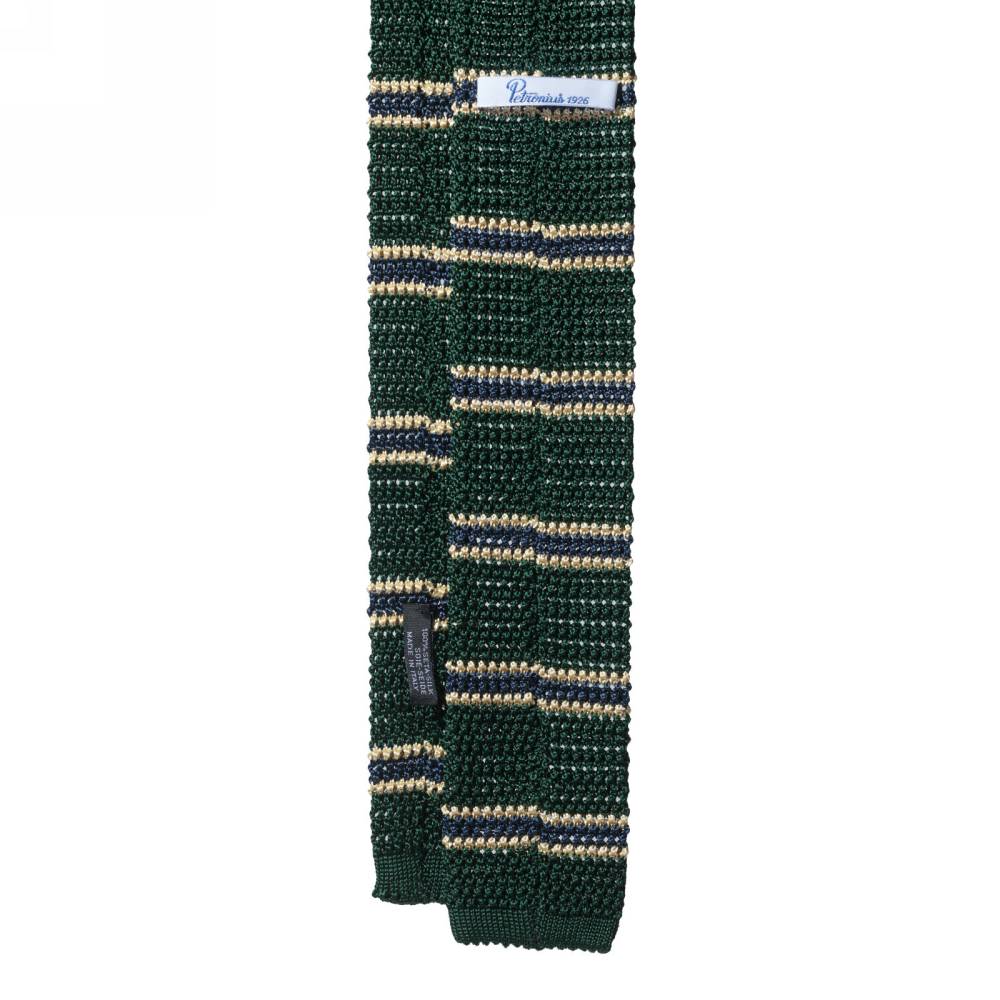 Полностью вязаный неформальный галстук миланского ателье Petronius. Модель связана из фактурного шёлка тёмно-зелёного цвета с бежевыми полосками. Край галстука квадратный, что добавляет особый характер изделию. Материал обладает характерной особенностью для такого типа галстука – он слегка суховатый. Знатоки ценят такую фактуру и узнаваемый «скрип», свойственный вязаным галстукам (фр. «cri de la soie»).